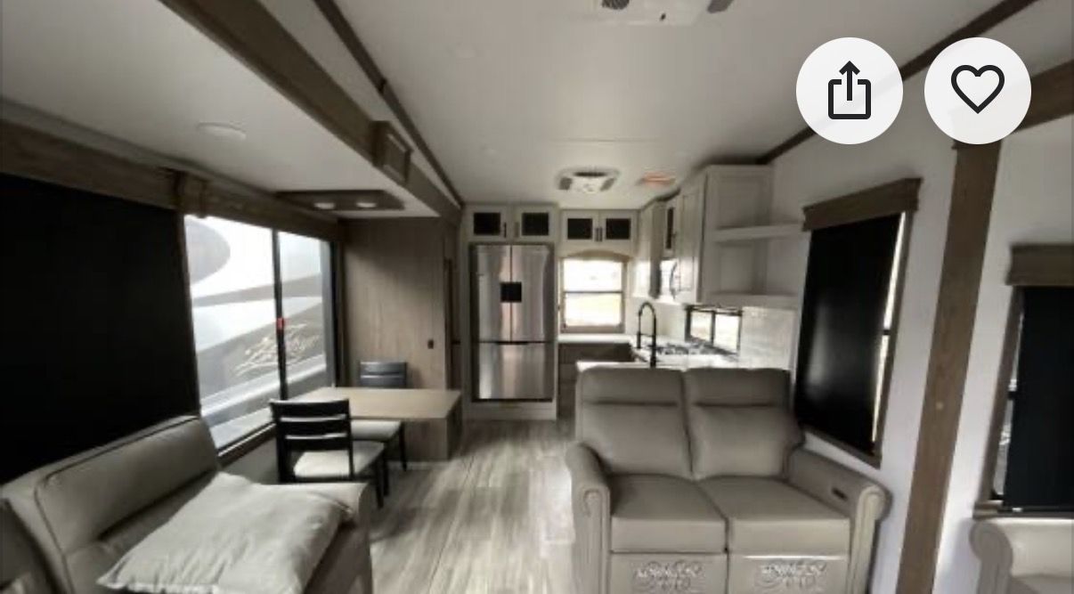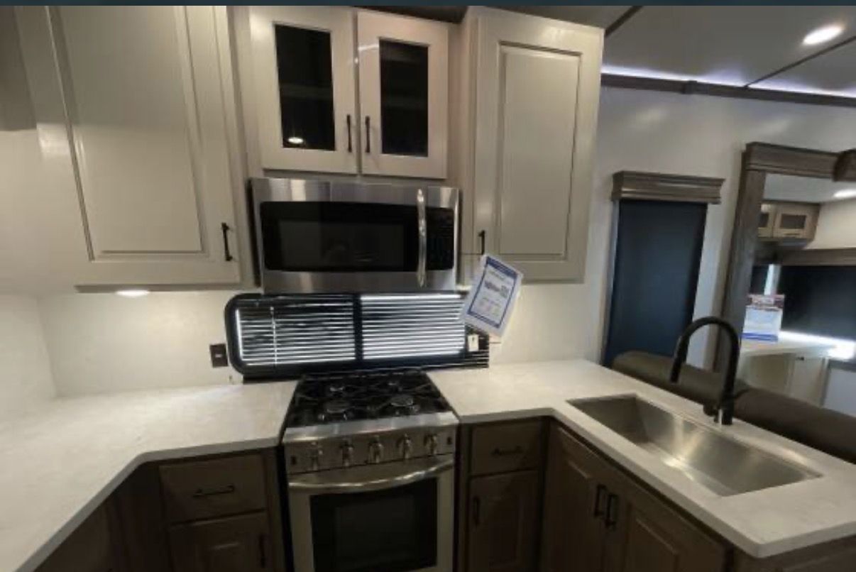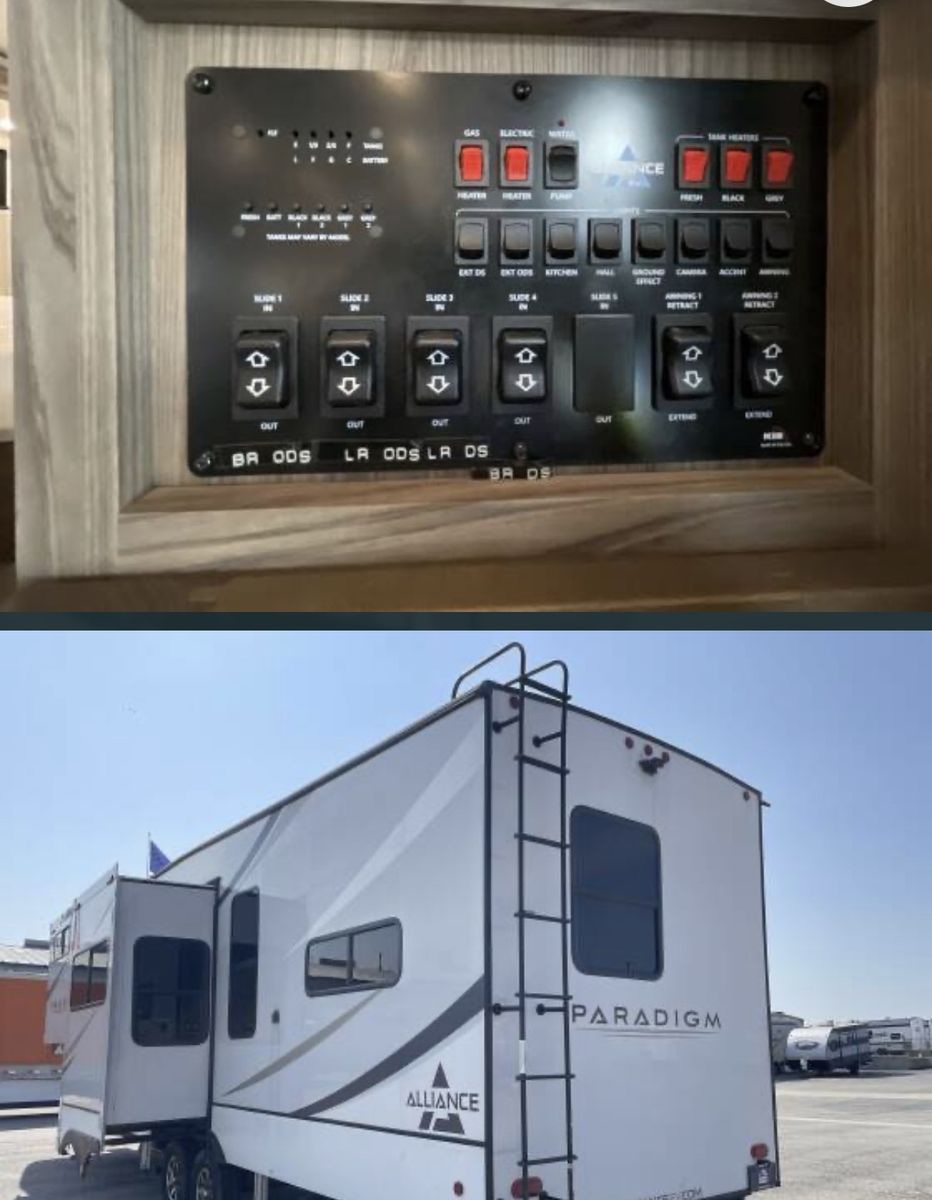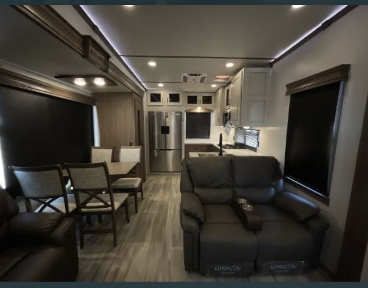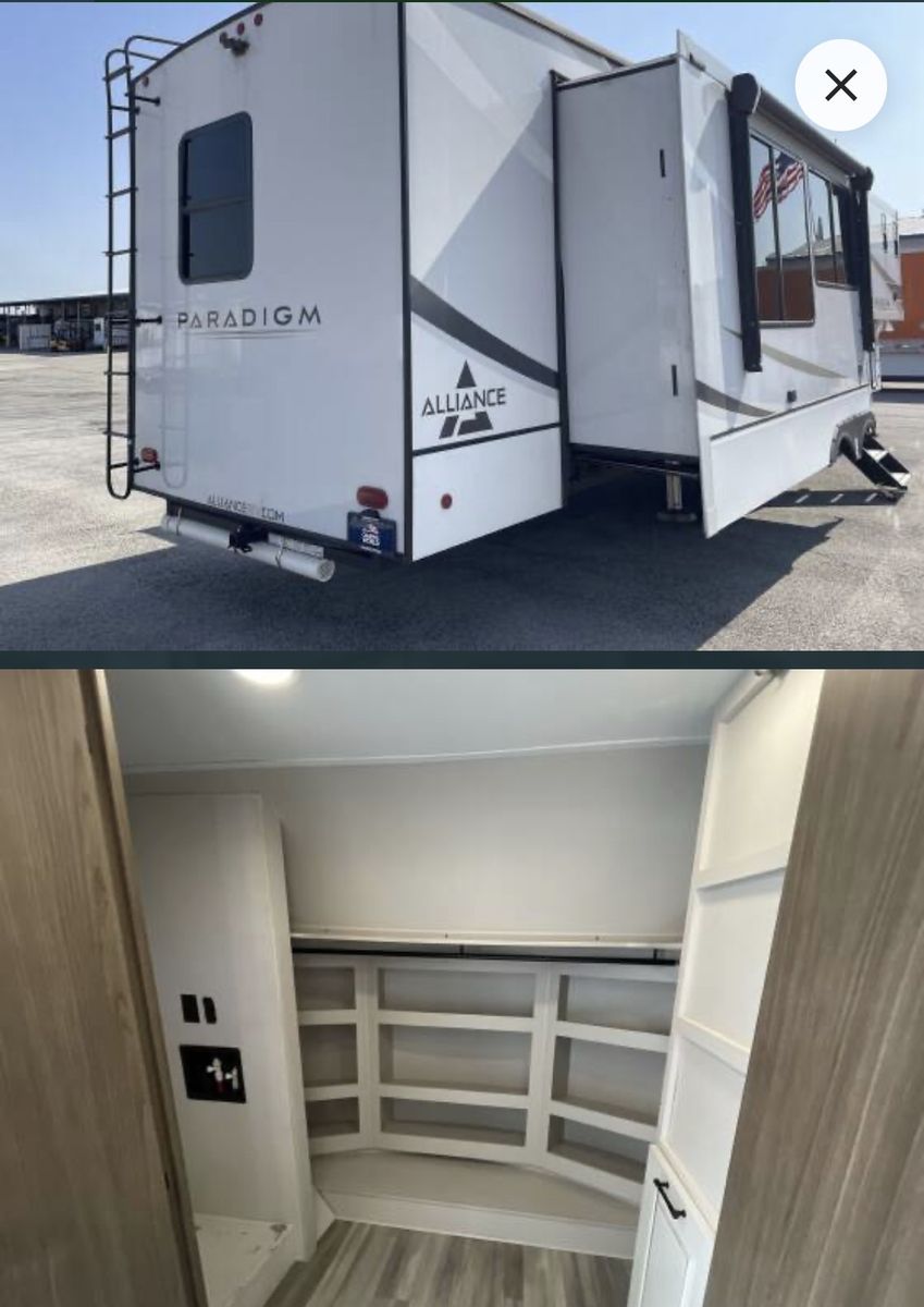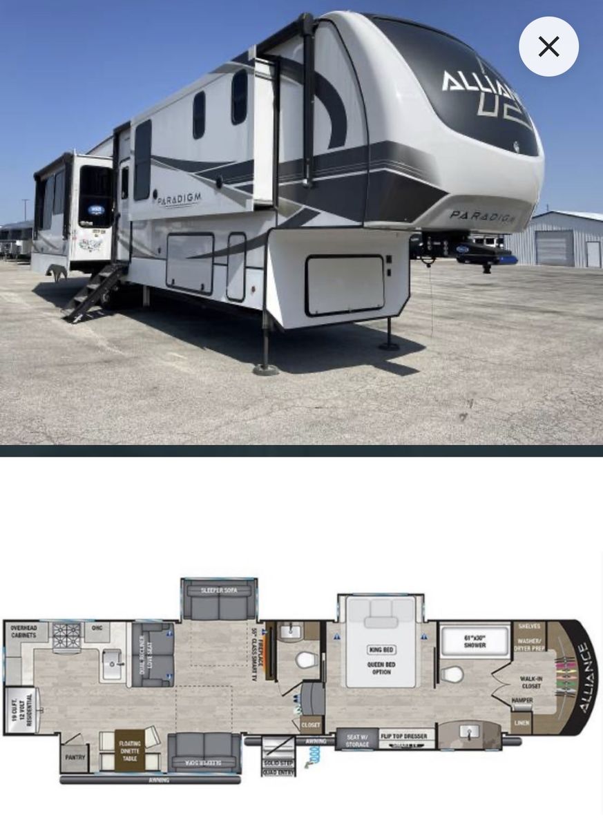This is an Alliance, rarely can you find used and in the great condition it is in. Well made, owners love the Quailty and keep for along time. This RV and tires have traveled less than 400 miles. It has large kitchen area, residental fridge and large enough oven to cook a turkey in. It also has a dishwasher in it. A table for 4 with panoramic view. It has lots of kitchen cabinets plus a large pantry. Also, a second 1/2 bathroom, so nice. In the living room area it has a fireplace with TV above it and 2 recliner love seat, 2 other couch that make into beds for your guest. With the slides outs it is very spacious. To the front of the RV is the bedroom with a king bed, large oversized shower and bathroom. In the super large closet is prep for washer and dryer. This has space for everything. Outside has skirting for around the whole thing. It has solar in it, it is 4 season for the extra insulation and heated belly. It self levels, prep for generator. A lot of storage space underneath, too!! This has only been lived in for 1 year by an elderly couple, so hardly used at all. With the extras it is worth well over $90,000. Come see, you will fall in love with the comfort, Quailty you desire.