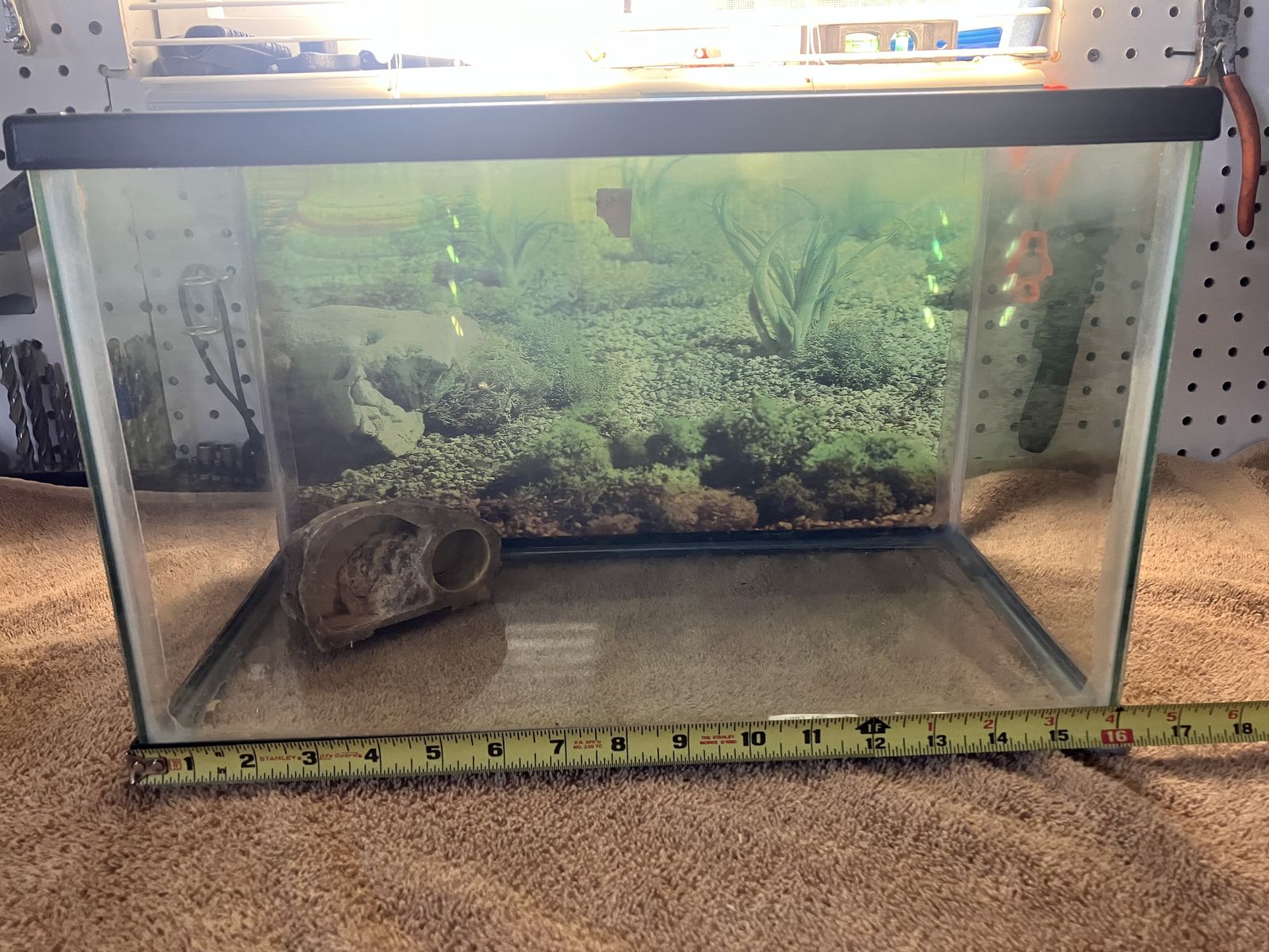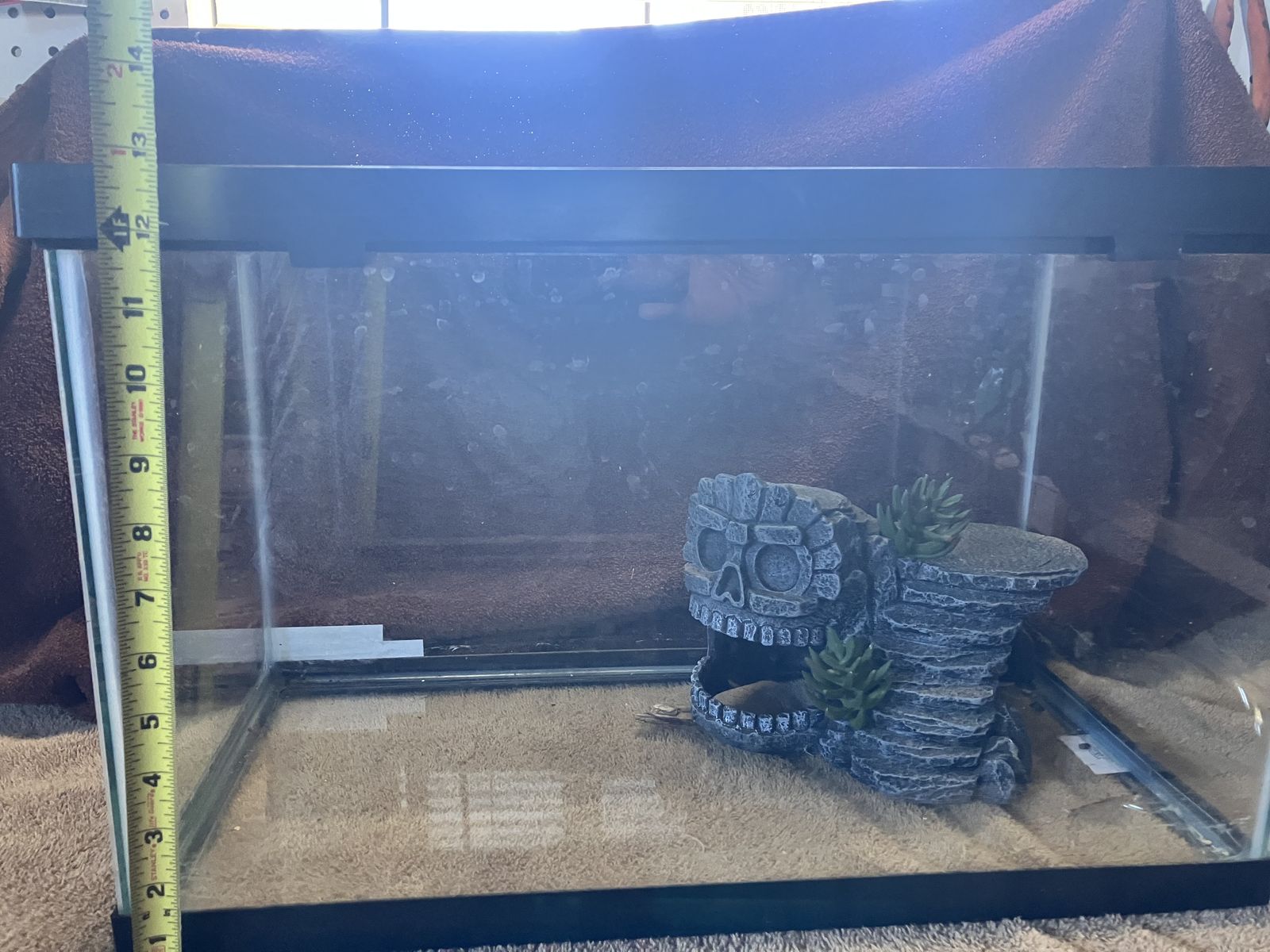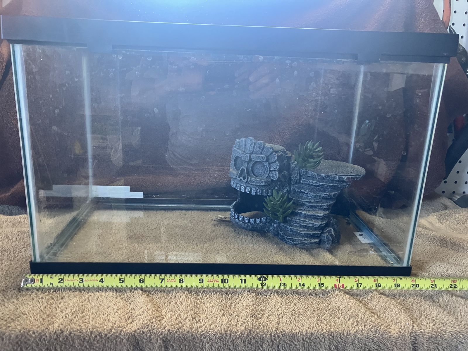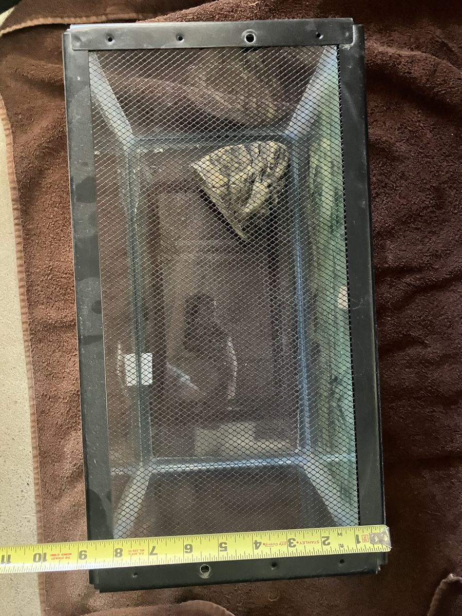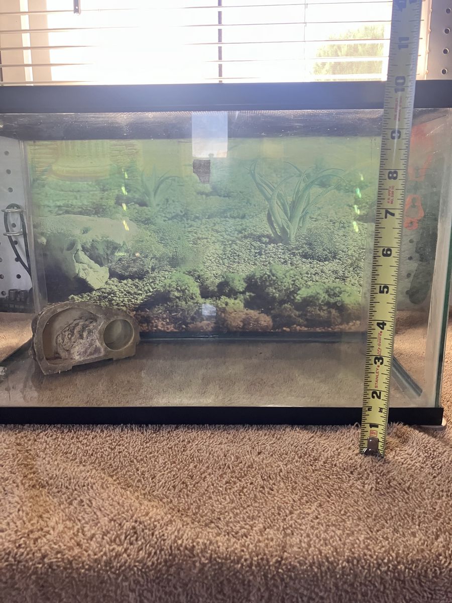 ZelleI have two terrariums for sale. No cracks but I’m not sure if they will hold water. Both come with screen tops. The 5 gal had a metal screw top. The 10 gal has wire mesh top with some heat damage to it. I can through the decorations on the pic. 5 gal is $15 10 gal is $20 Please contact me with any questions. Thank you