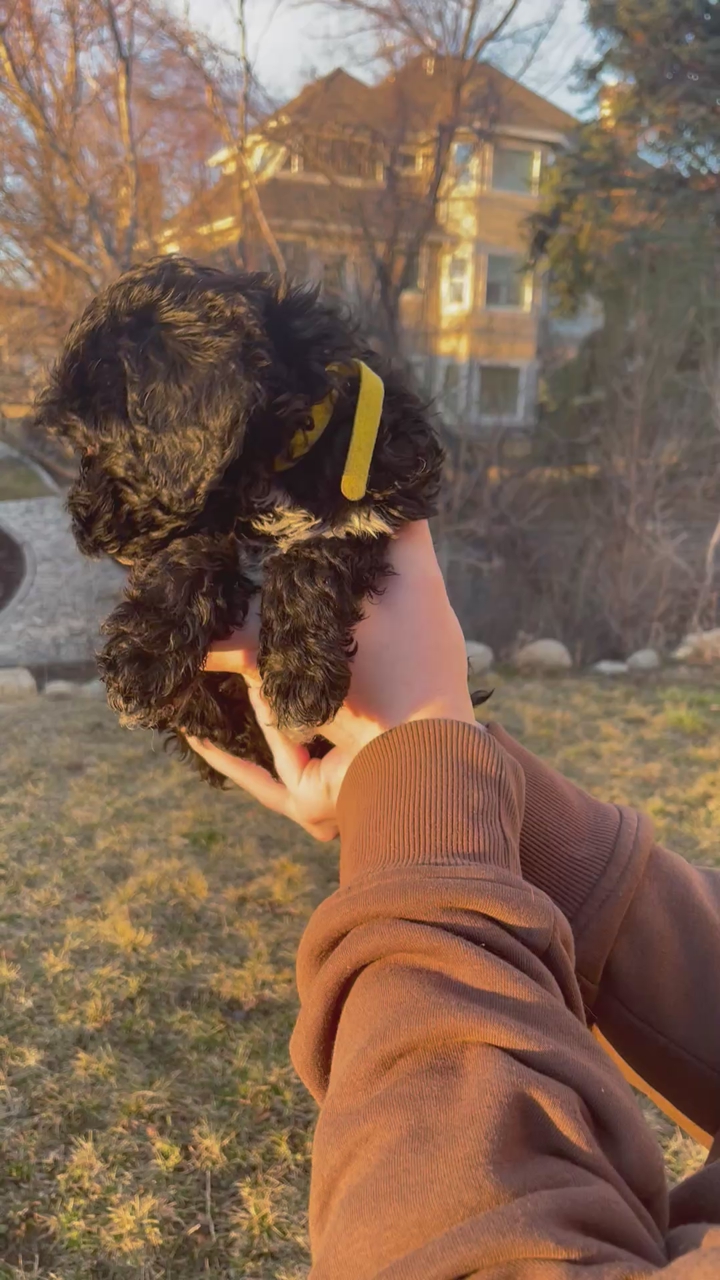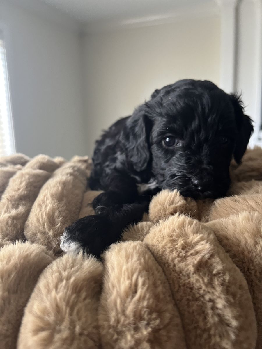 This is Miss Cardamom, she is a 9 week old Golden Cavapoo (Golden Doodle/Cavapoo mix) this means that she is super hypoallergenic, she has amazing soft silky fur, she has a more petite bone structure and a less pointy nose.