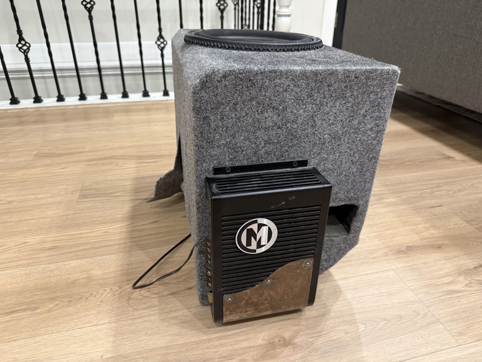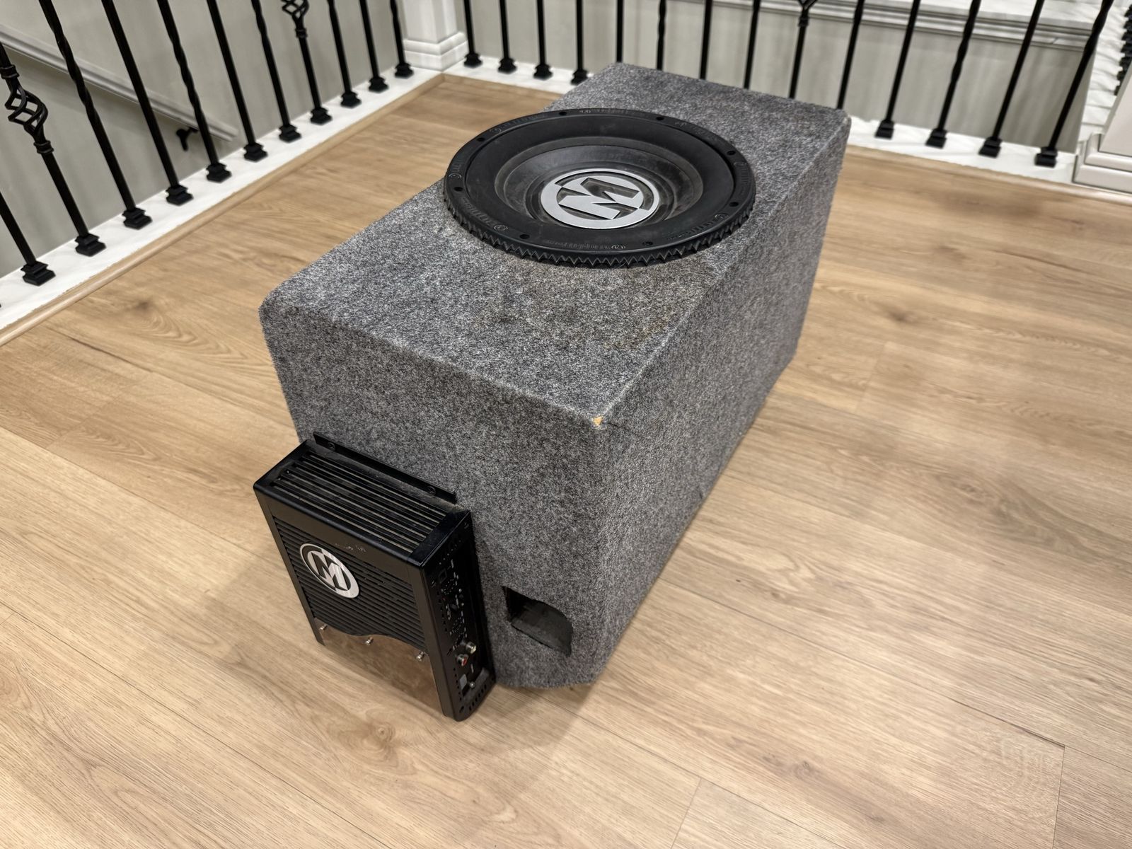 VenmoMemphis Audio 12” powered subwoofer in a carpeted enclosure. Built-in amp, everything works great and hits hard. Perfect for upgrading your car audio system without needing a separate amp.\