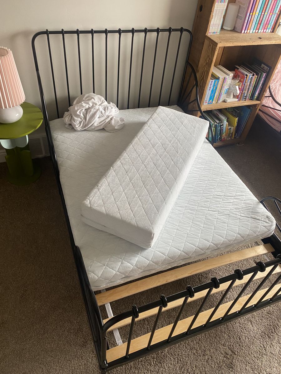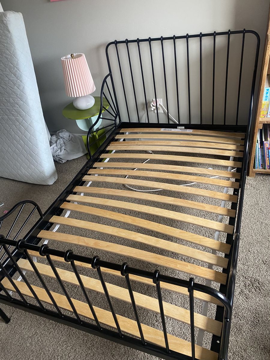 Black adjustable length IKEA bed with foam pads with cover for adjustment. The slat boards are a little bowed so we had them bow side up and they worked just fine but you could replace them.