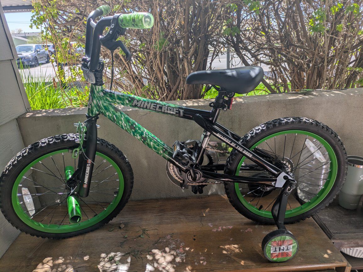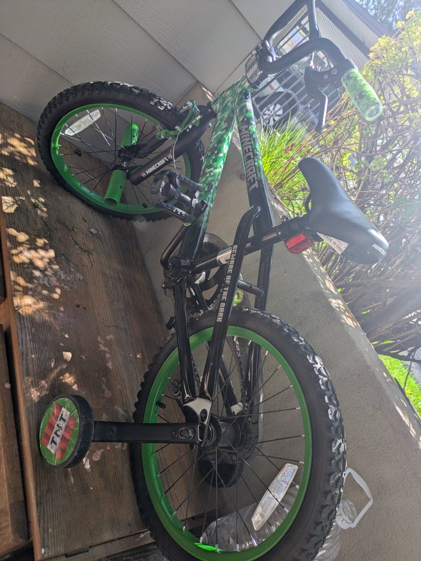 CashAppbrand new kids Minecraft bike. 18" wheel. bought this for my son. I tried to put air in the tire it blew up and bent the rim. I know nothing about bikes. I figured it'd just be easier for me to get a new one so I'm trying to sell this to get the money to replace it. figured someone who is handy with bikes might want it