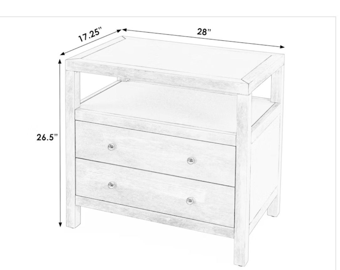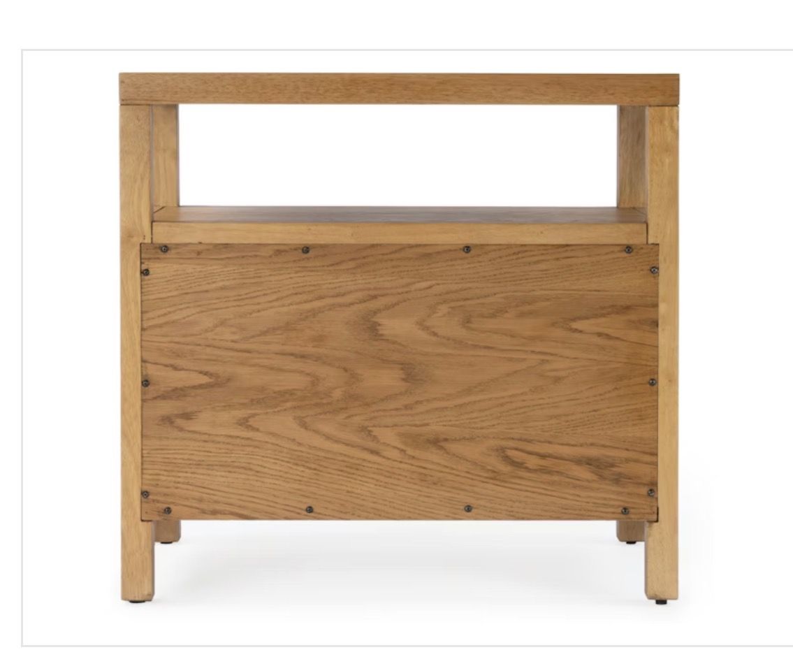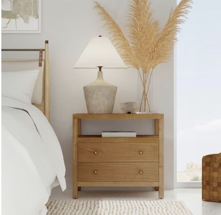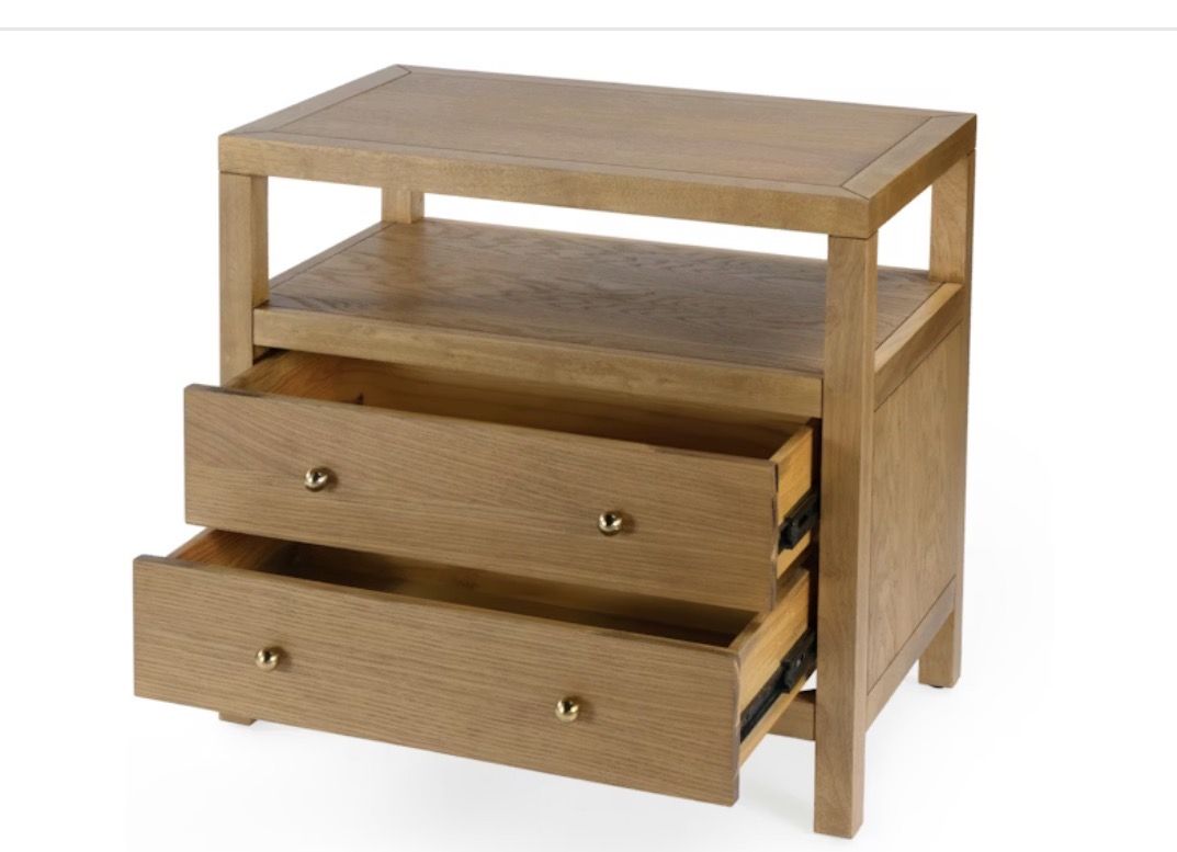 Designed with 2 lower drawers and an open shelf above, it offers thoughtful features for easy access and storage and comes in a light natural finish that lends a gorgeous visual texture and sophisticated look.