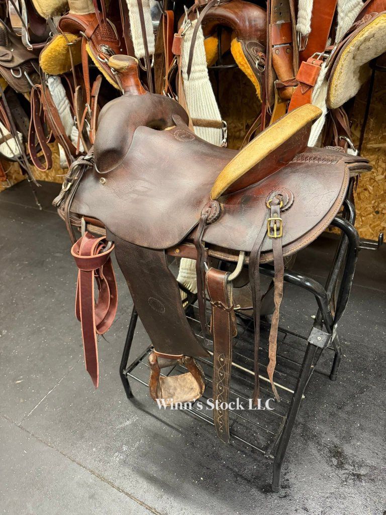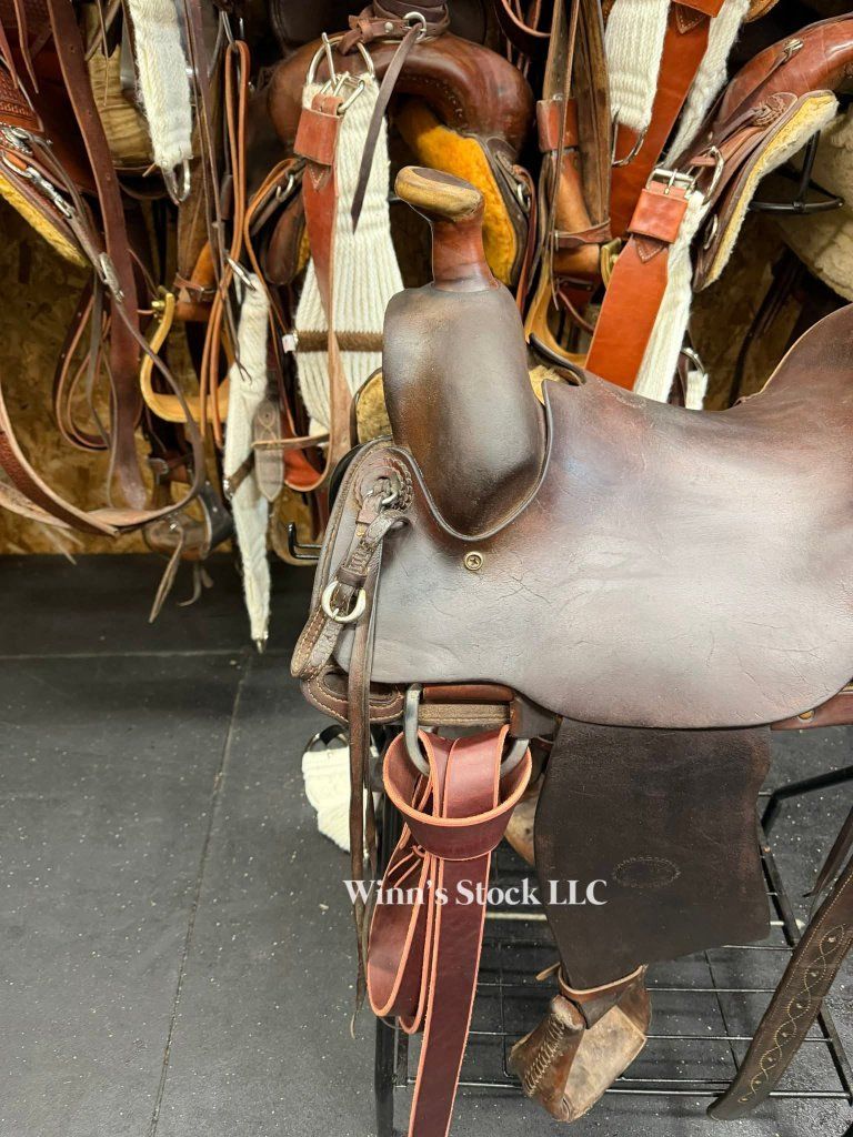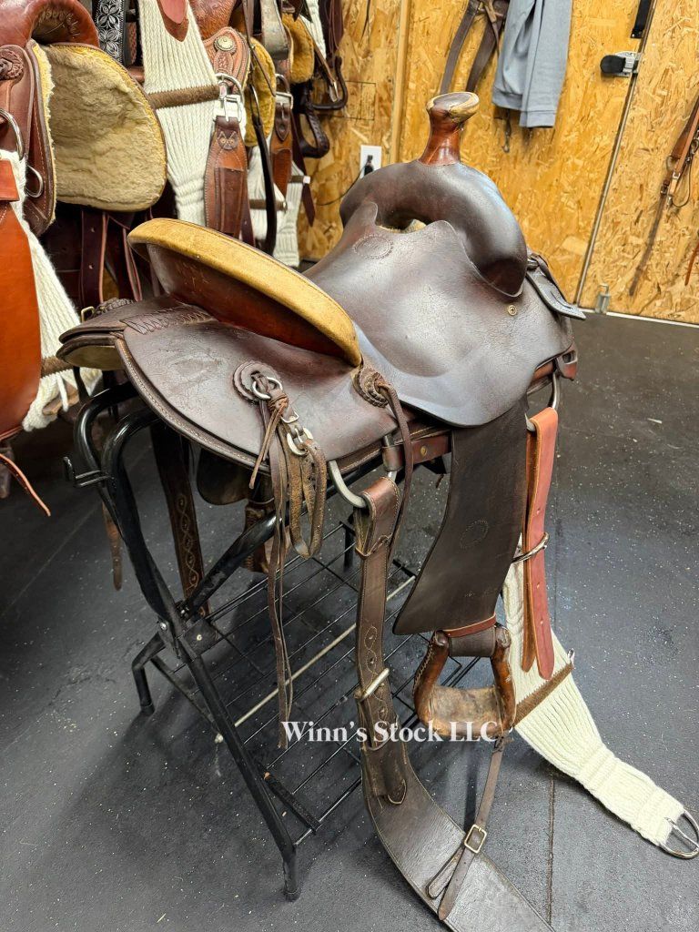 This saddle features a 14" hard seat, 4" cantle with rawhide trim, post horn, 6 long leather ties, stainless rigging, round skirt, back cinch, 6 3/4" Gullet, QH bars, rawhide wrapped wood tree, fleece is good, and weight is around 38lbs.