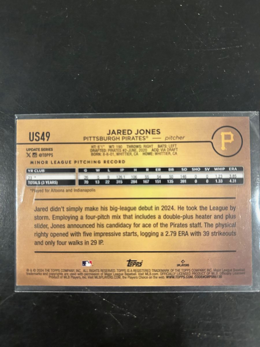 VenmoThis is an image variation Super short Print of Jared Jones called a Golden Mirror. The back is gold instead of the standard white. The front also has gold printing instead of the standard silver. This is his rookie card from the 2024 topps update series. It's in mint condition. Cash or Venmo accepted.