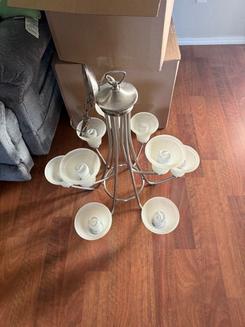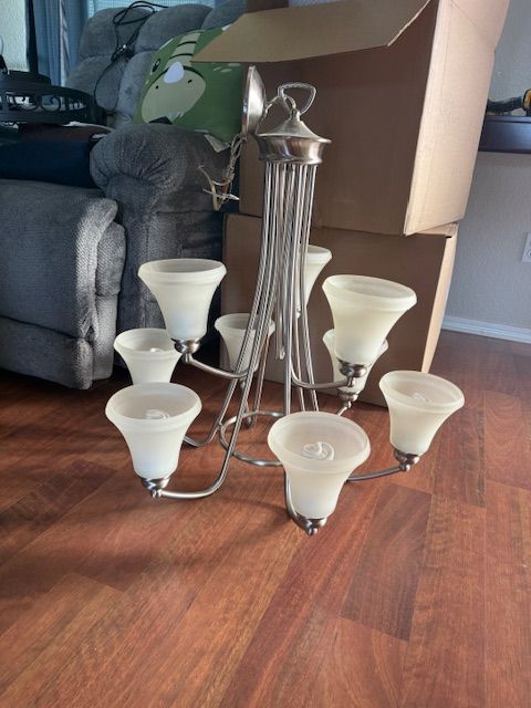 VenmoUsed Brushed Nickle Hanging chandelier. Has 9 lights with shades and CFL Bulbs. Works Great. See pics for measurements.