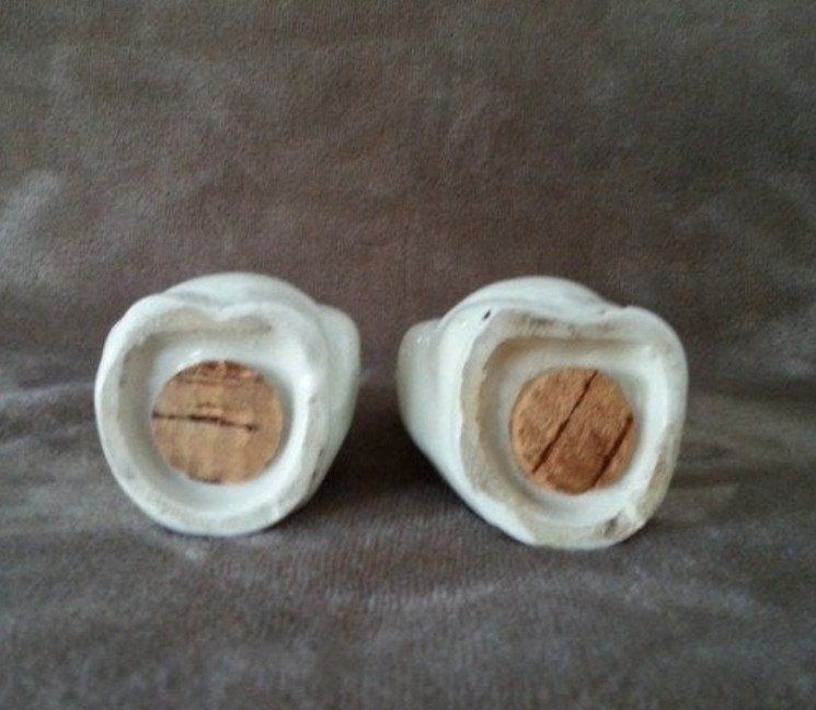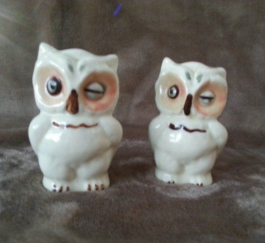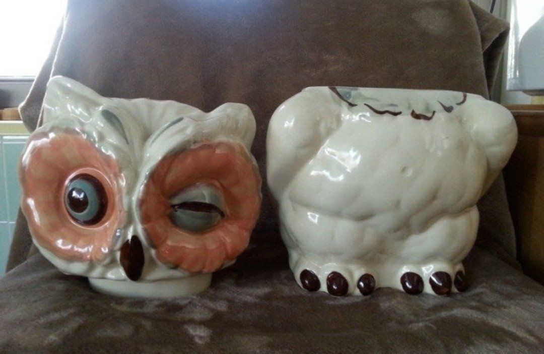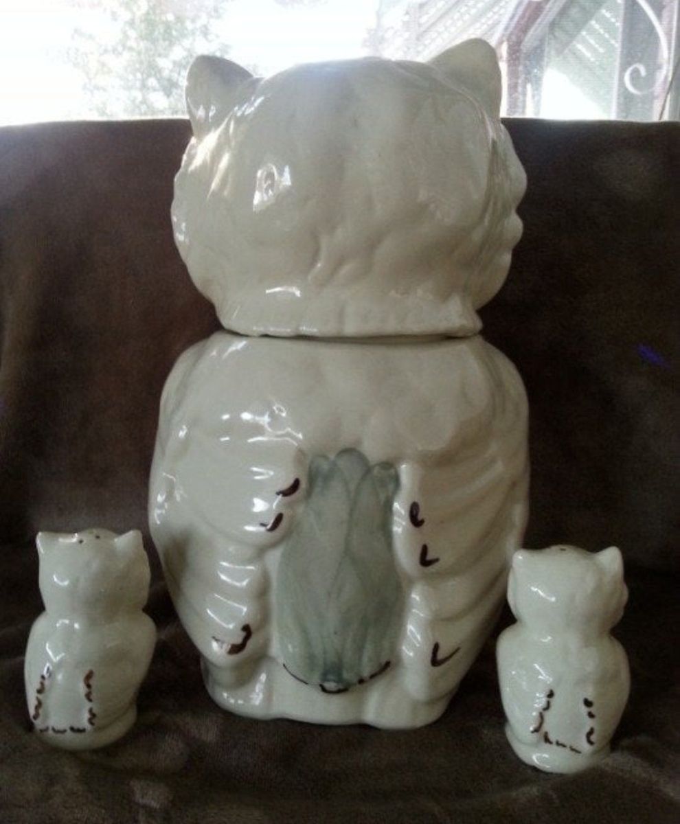 Vintage Shawnee Pottery Winking Owl Vintage, Cookie jar with matching Salt and Pepper shakers, shakers have original corks, cookie jar has indent in stomach (the indent is not a crack or chip). No cracks or chips. colors: Peach and blue Good condition Gently used $70 cash only