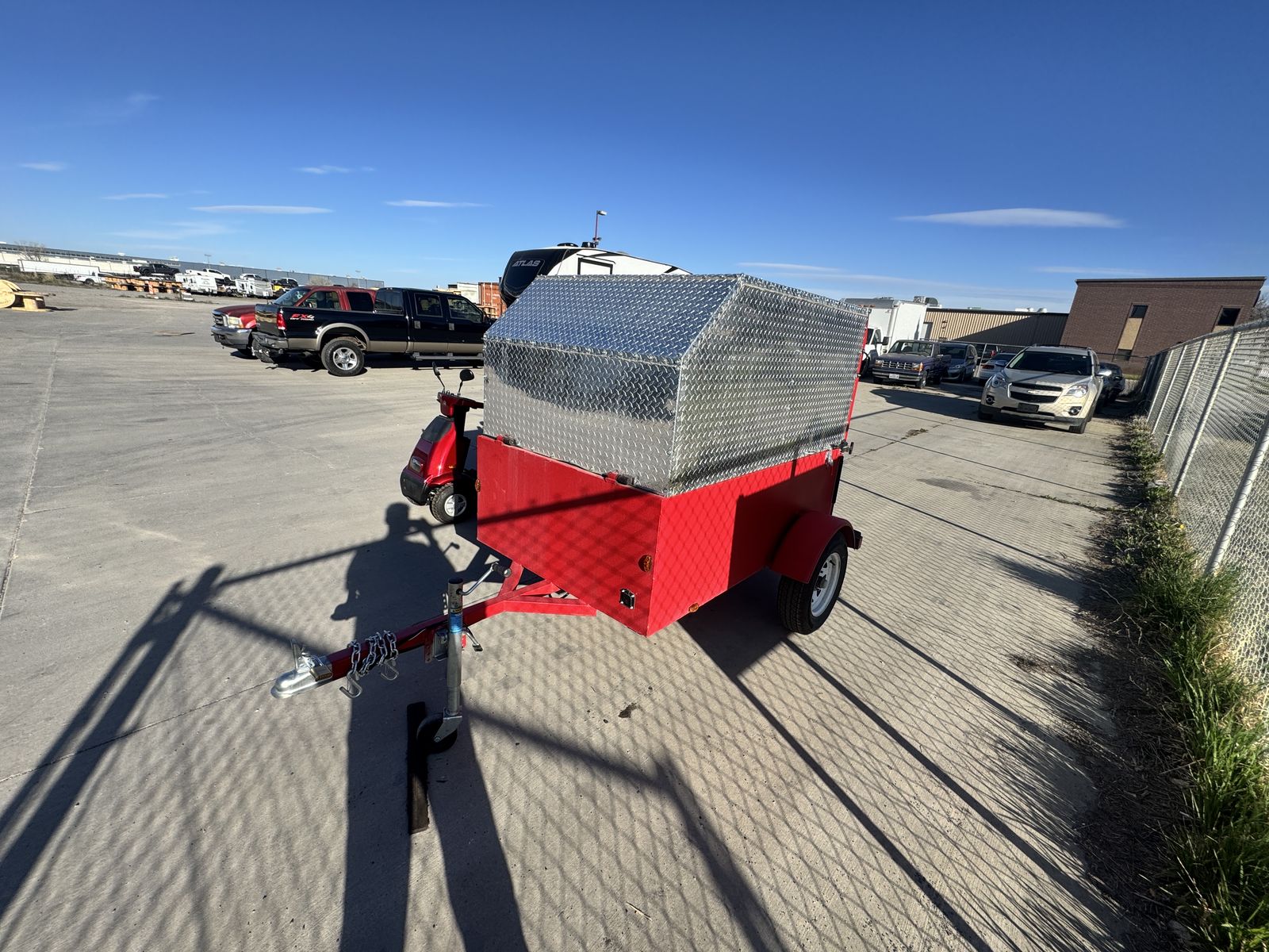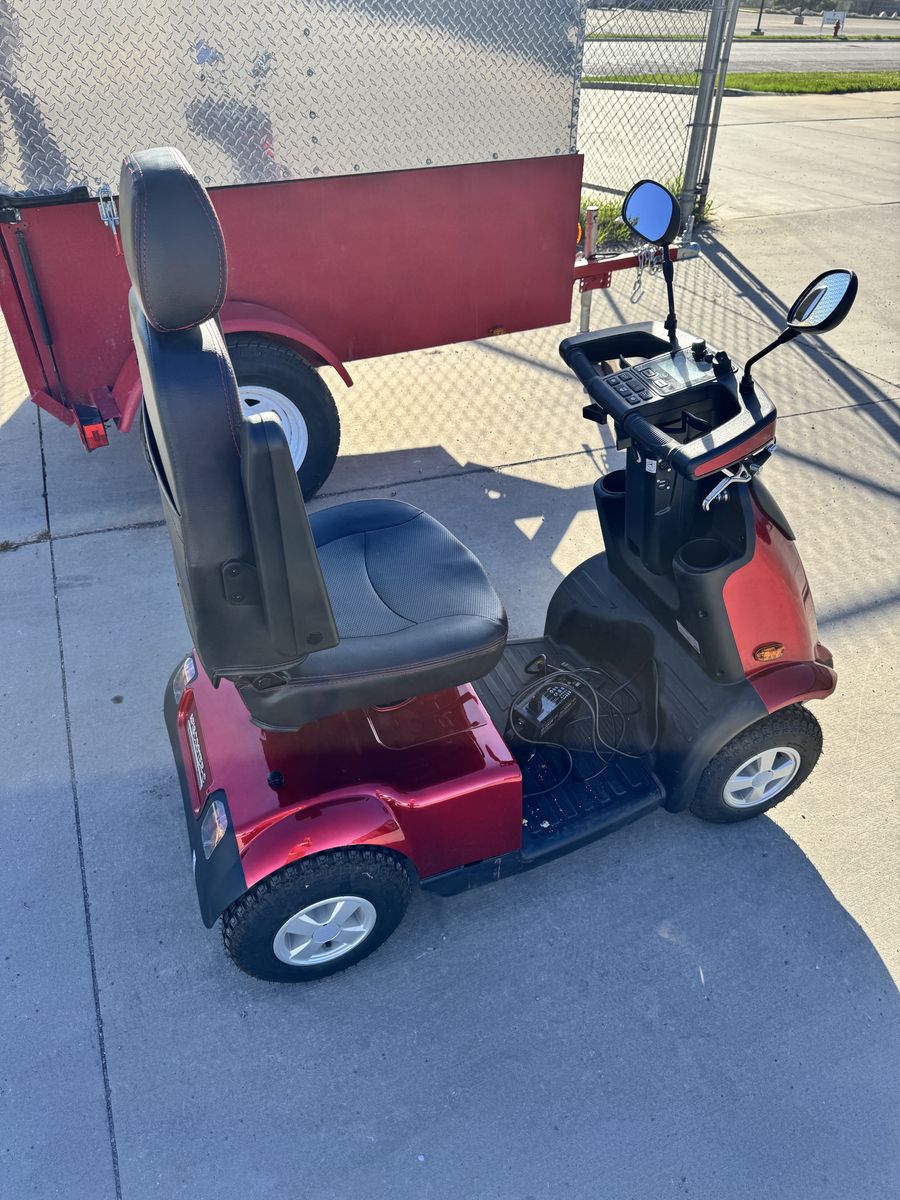 This is a trailer made to pull a scooter around. It works really well and keeps the scooter protected and out of the weather. It can be pulled with just about any vehicle with a hitch. It’s very light and can be pushed around pretty easily. I also have a scooter that can be bought with it that matches. Price for both is $6,000