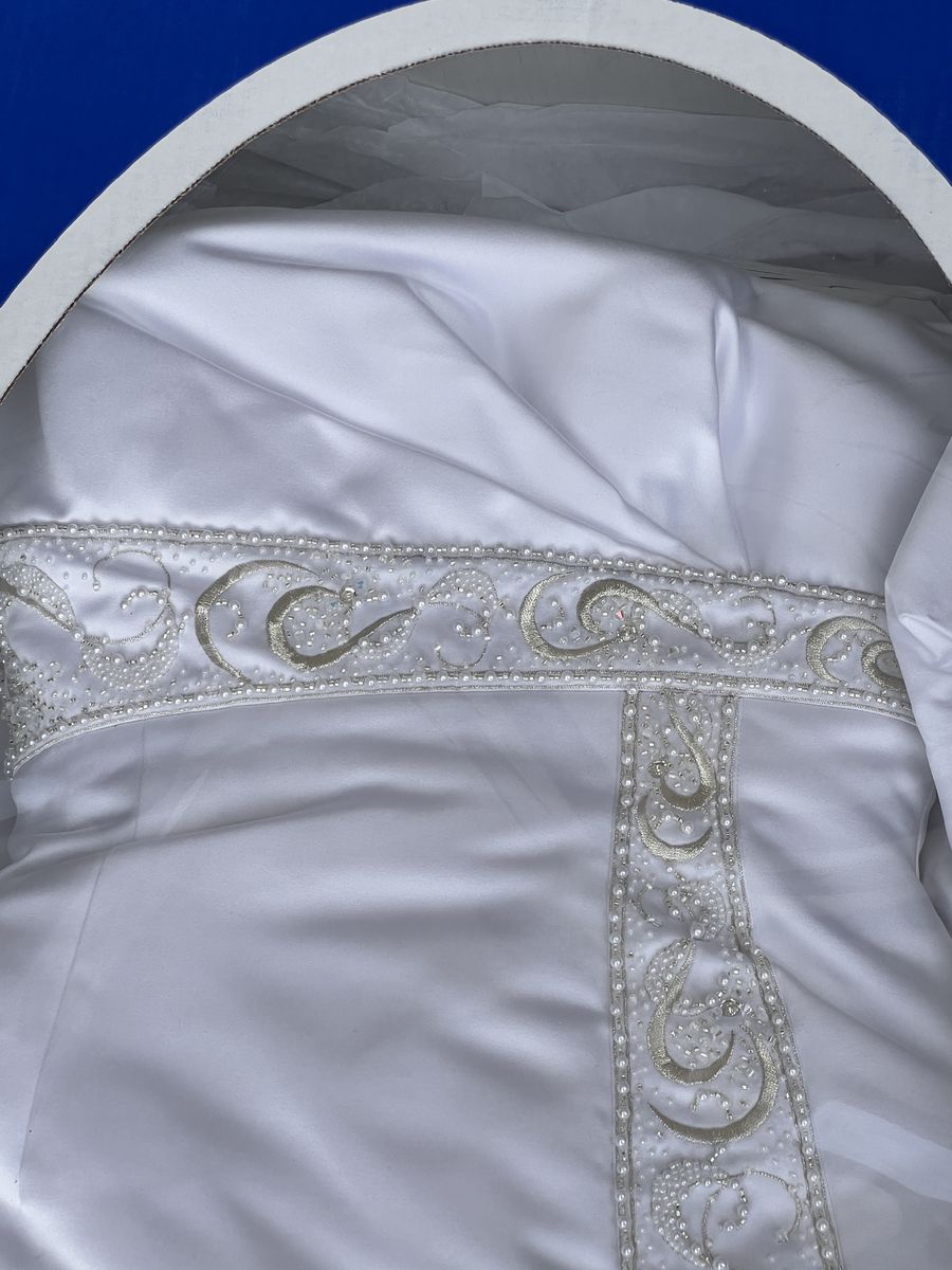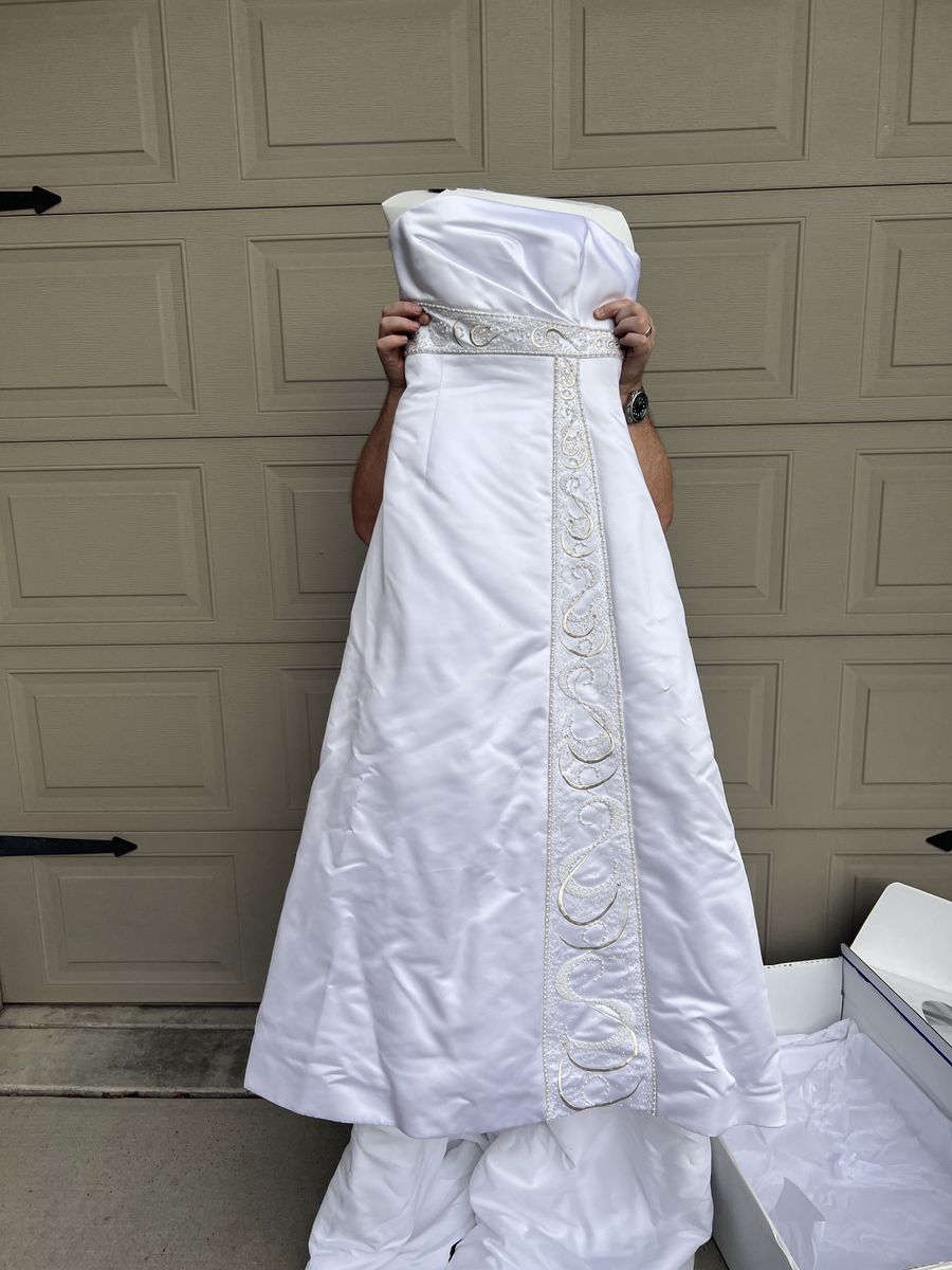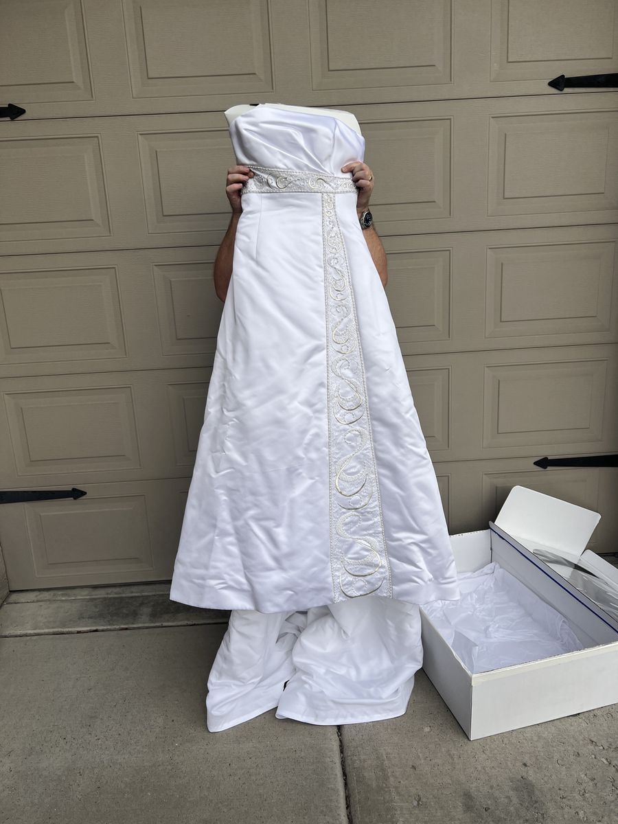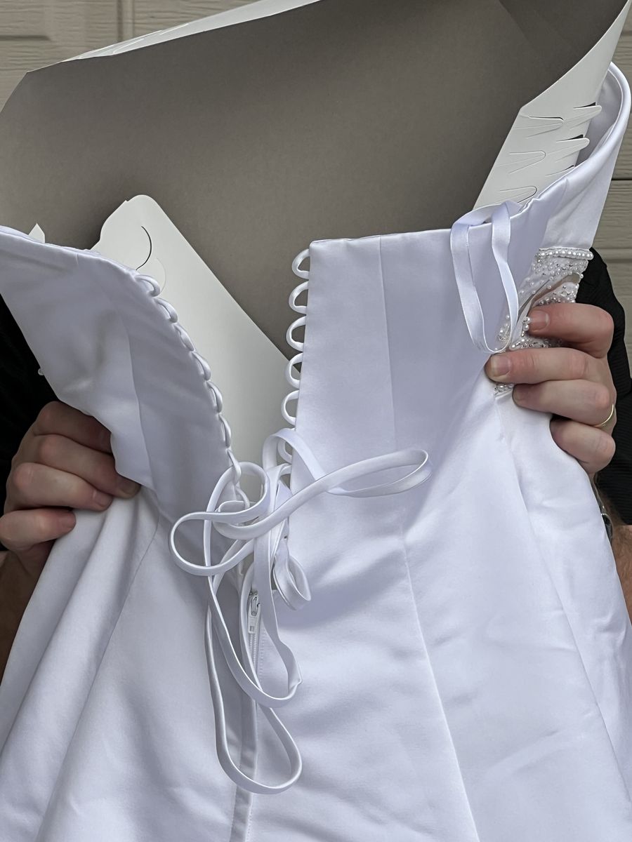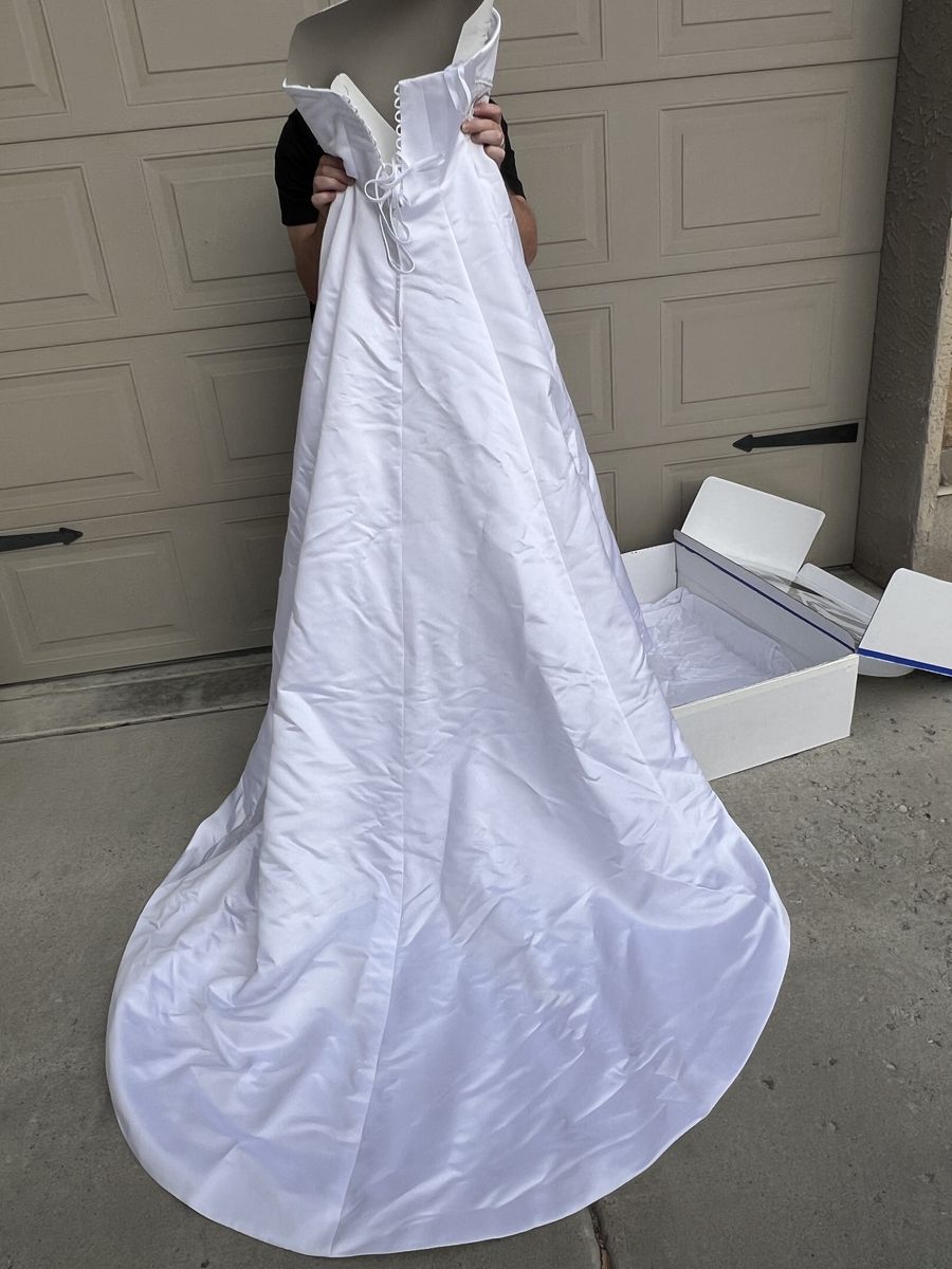 VenmoJust in time for wedding season- Beautiful satin dress with incredible bead detail and corset back. Has a train. Was hemmed for someone 5’3”. Size 8. Was used for the day and then professionally preserved. Taken out of the box for photos. Pick up in Draper. From pet and smoke free home. Cash or Venmo. $200.