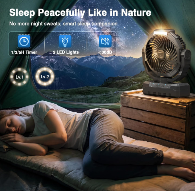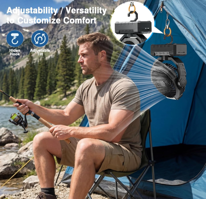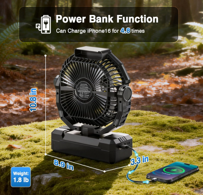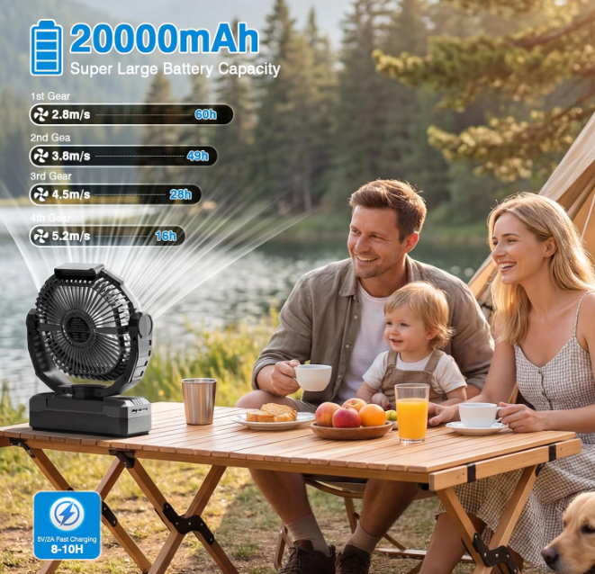 ZelleLong-Lasting Rechargeable BatteryThis battery-powered portable fan is equipped with a robust 20000mAh rechargeable battery that charges fully in 3-5 hours via Type-C and provides 10-60 hours of runtime depending on the mode. It also serves as a power bank with a USB-A port to charge your GPS or phone during outdoor adventures, eliminating battery anxiety.