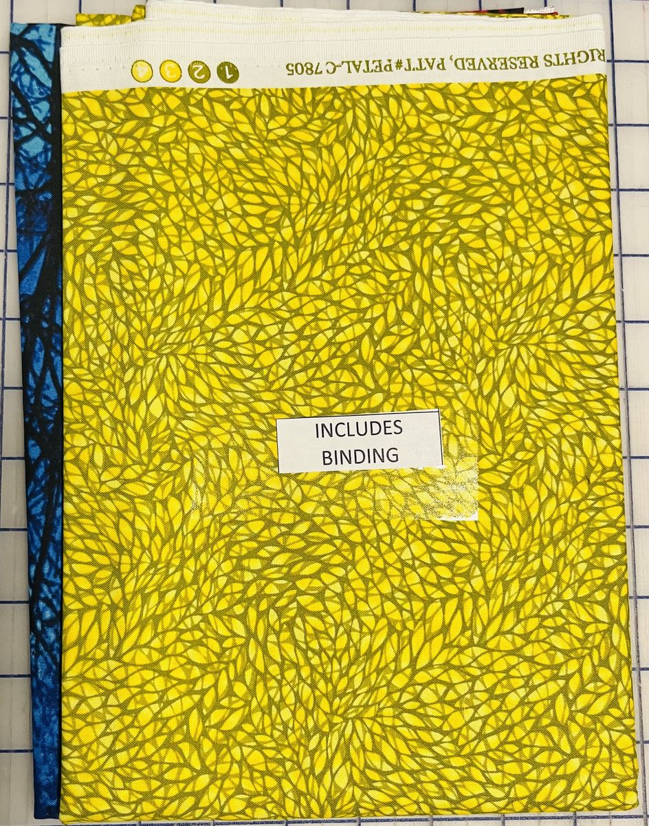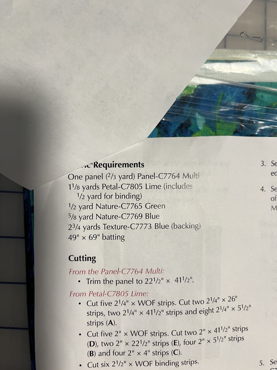 One panel (23 yard) Panel-C7764 Multi 1 yards Petal-C7805 Lime (includes 1½ yard for binding) 12 yard Nature-C7765 Green 5/8 yard Nature-C7769 Blue