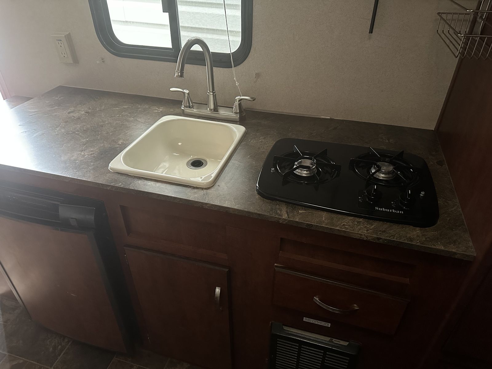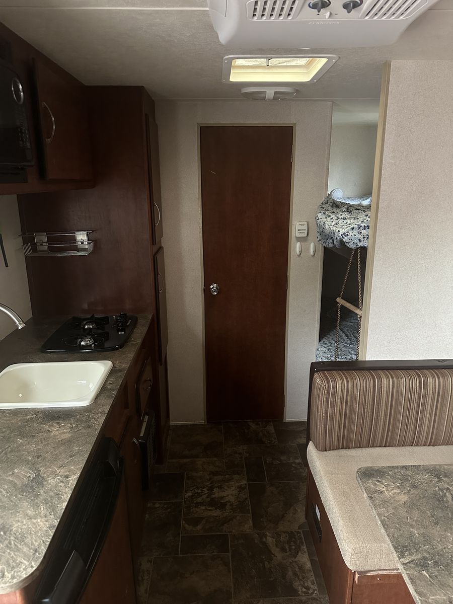 Features: Lightweight and easy to tow Sleeps up to 5 Rear bunk beds (perfect for kids) Front queen bed Convertible dinette Full bathroom with shower and toilet Kitchen with stove, microwave, fridge, and sink Heat & A/C for comfortable camping Plenty of storage