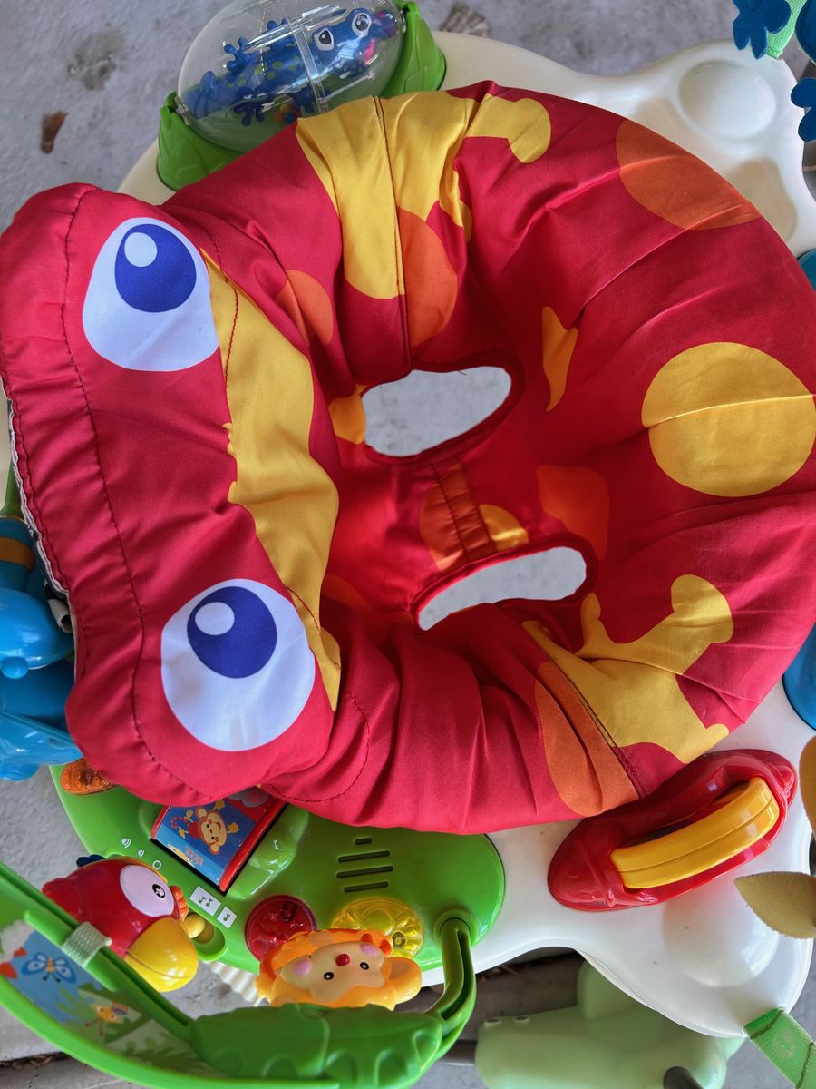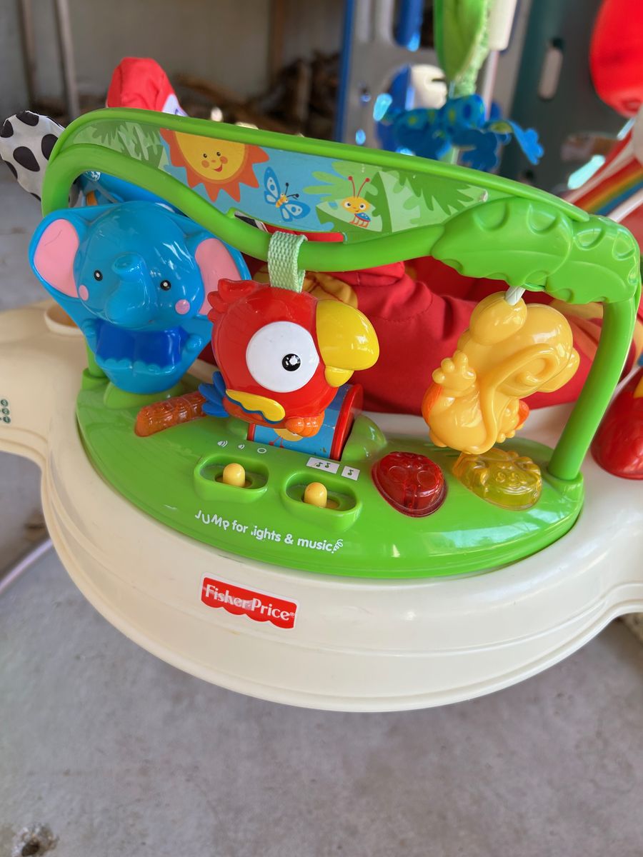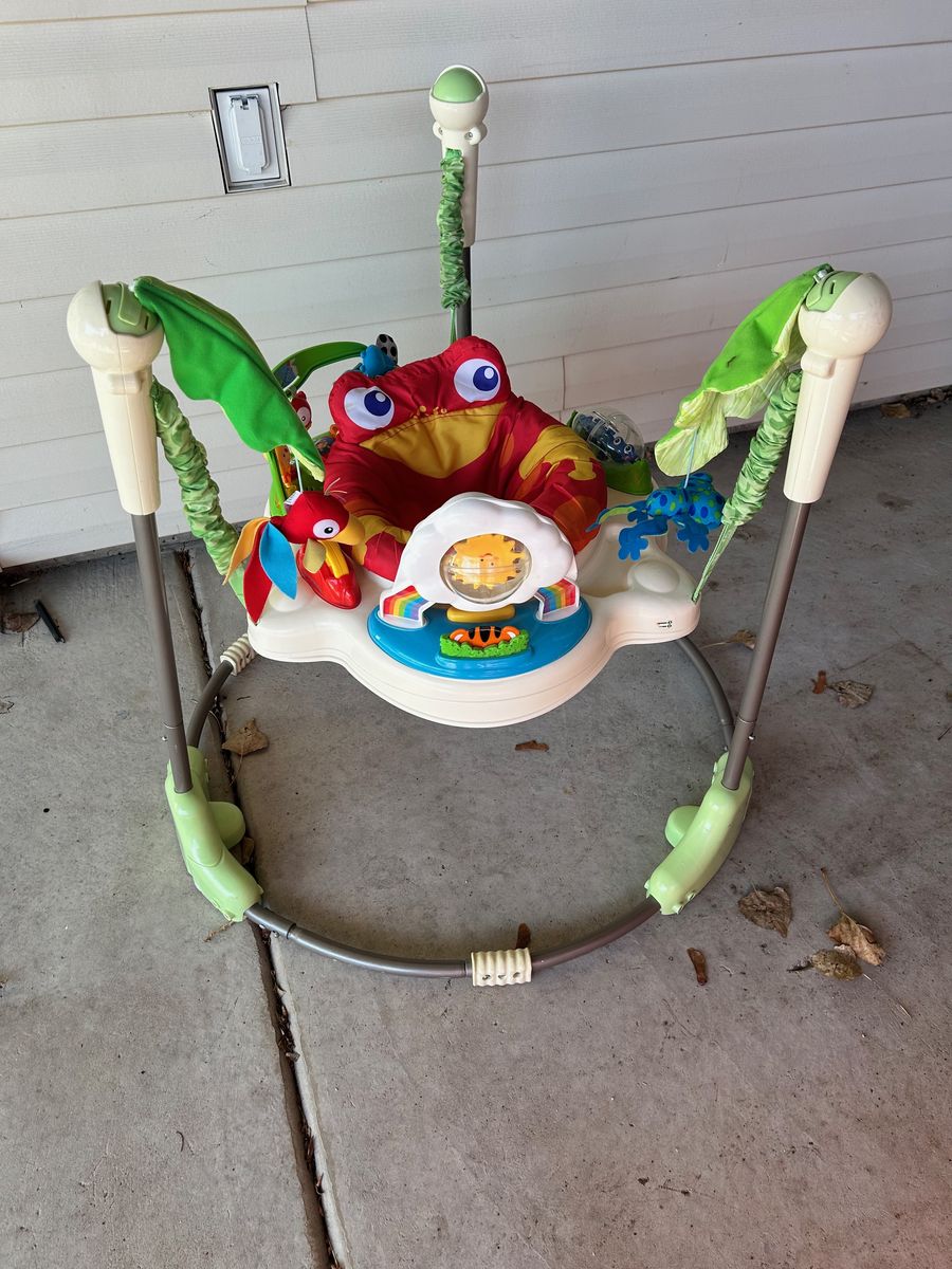 ApplePayFisher Price Rainforest Jumperoo. Freestanding activity center, seat rotates 360 degrees, has lights, sounds, music, toys, adjustable height seat. Base will collapse to smaller footprint to make it easier to move around or to store it. It all works great and while it is used, it is in good condition. It has been stored indoors in a smoke free, pet free home since my last child outgrew it several years ago.