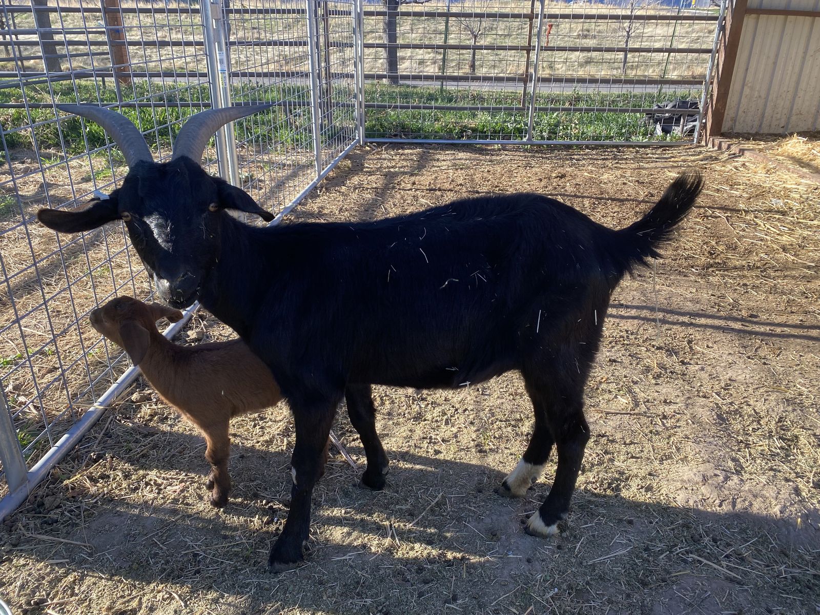 I have a sweet doe available! She is a Boer-Saanen. I believe she is almost 2. She is an excellent mother and had triplets about 6 weeks ago. These breeds are also excellent milk goats. She can be a bit shy at first but loves you if you give her veggies! Message for additional questions.
