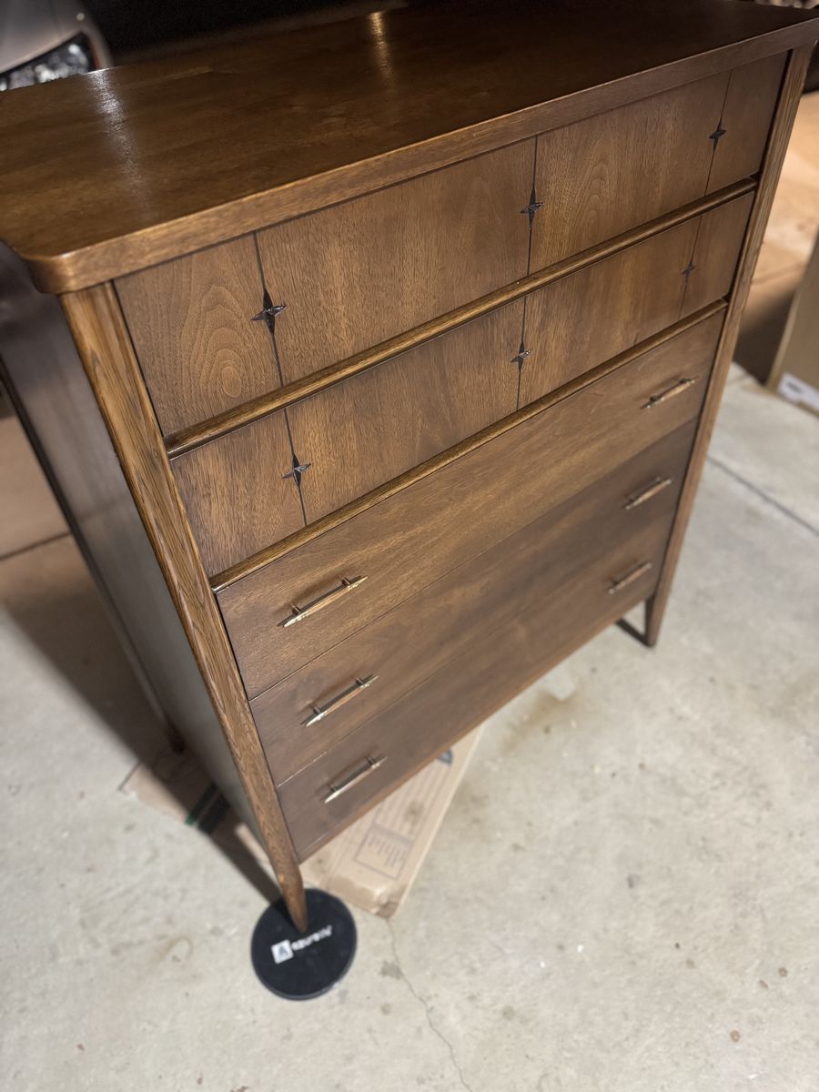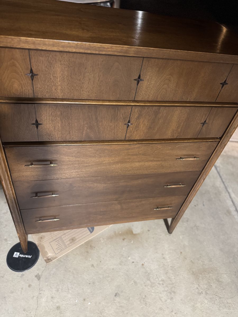 Broyhill Saga Mid Century Modern Walnut Highboy Dresser – Starburst Inlay