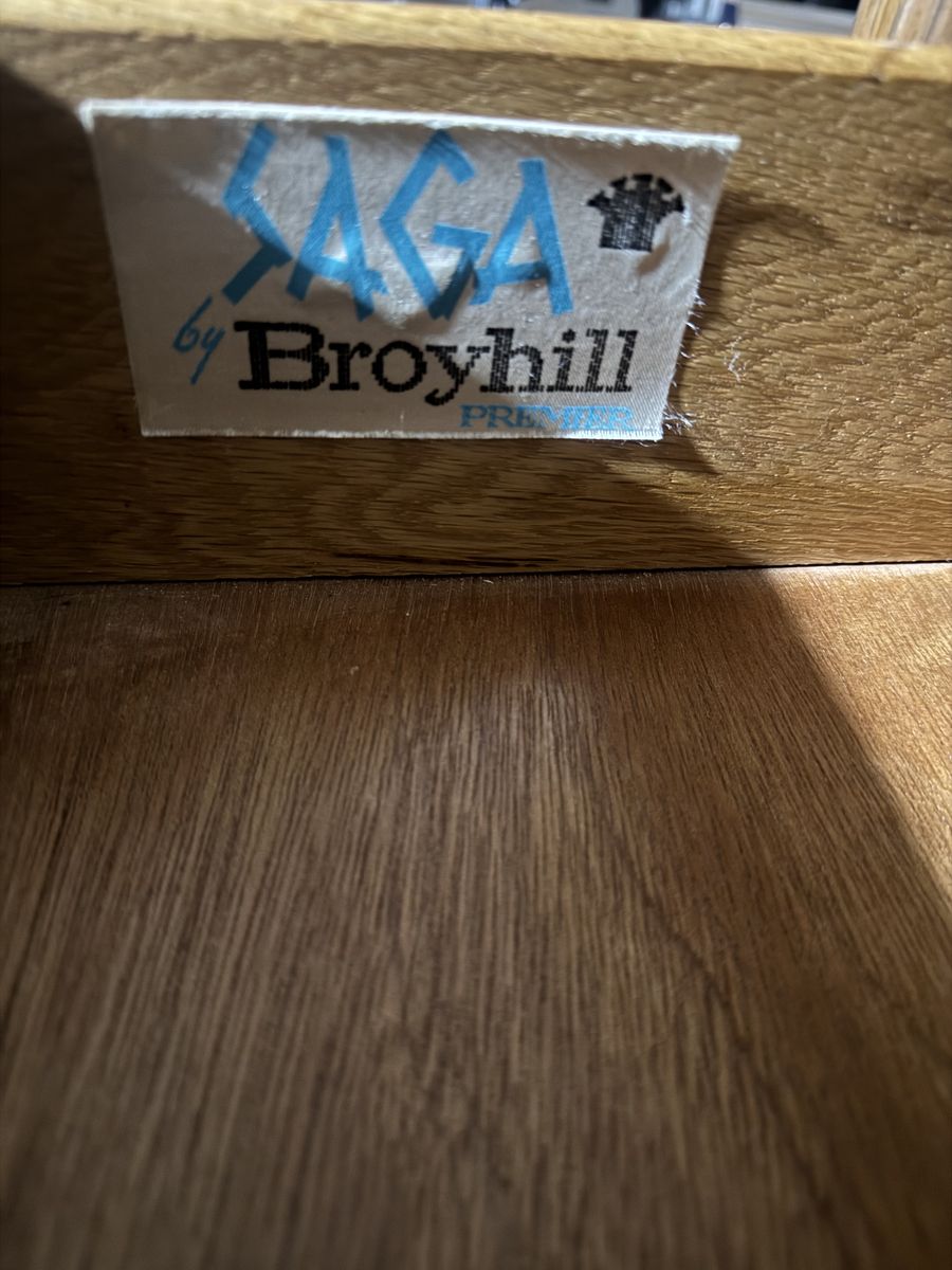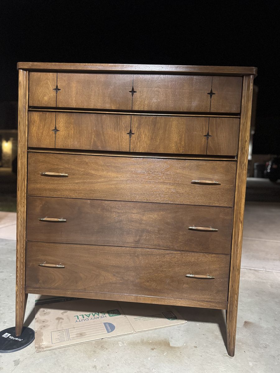 Hard-to-find Broyhill Saga highboy dresser featuring the iconic starburst inlays—one of Broyhill’s most recognizable and collectible mid-century lines.