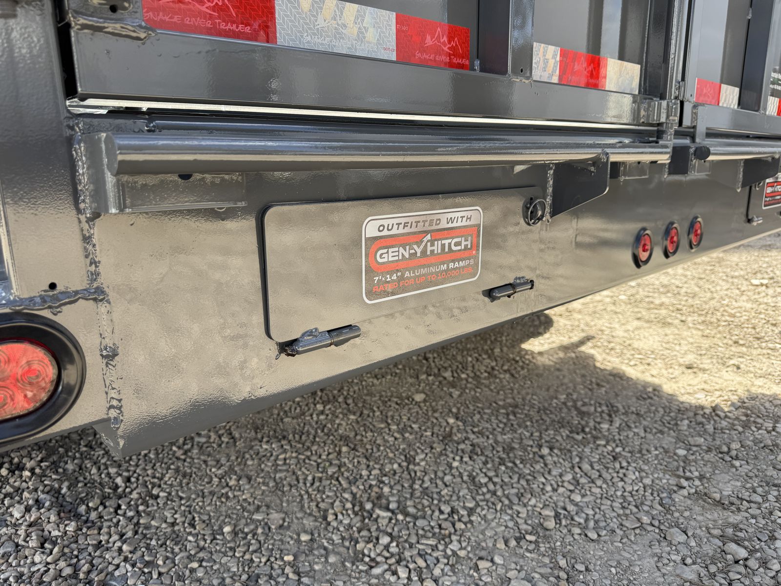 Snake Rivers Contractor Dump Trailer Line is engineered for the toughest jobs and the professionals who demand uncompromising durability. Available in both bumper pull and gooseneck configurations from 82" to 8' wide and up to 16' long, each model is built on a low-profile 6" heavy-duty tube frame and equipped with a 7-gauge plate floor with 3" channel crossmembers on 16" centers for unmatched strength. Standard features like 26" tall walls, Lippert 7k slipper spring electric brake axles, a Premium Rugby scissor hoist system, ST235/80R16E 10-ply tires, and an X-large tongue box ensure reliable performance on every jobsite. With premium components such as sealed LED lighting, Gen-Y aluminum ramp packages, heavy-duty hinges, and a deep-cycle battery system with charger, this line delivers rugged capability, long-lasting value, and the confidence contractors can count on daily.