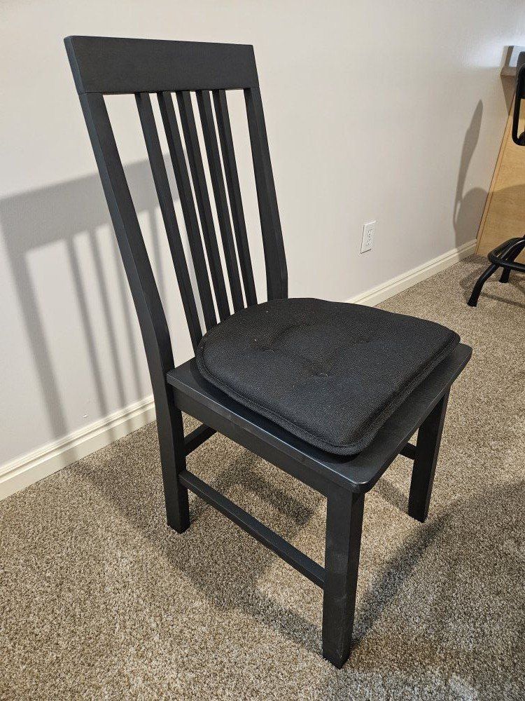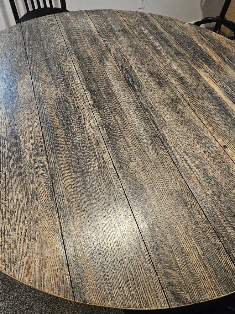 48" round wooden table, with one-of-kind unique finish. 4 black chairs included.