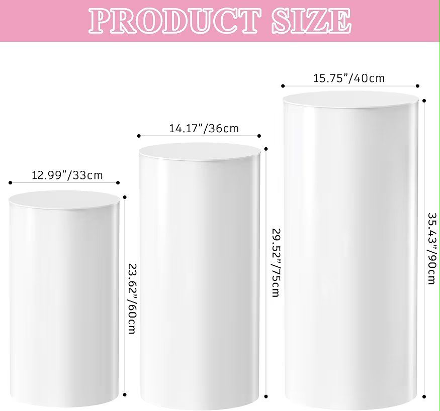 3Pcs Round Cylinder Stand PedestalLarge pvc white cylinder pedestal stands for parties include three white column stands, 15.735.4''(L),14.229.5''(M),13*23.6''(S). Three different sizes of cylinder pedestal display plinth pillars to give you full choice.