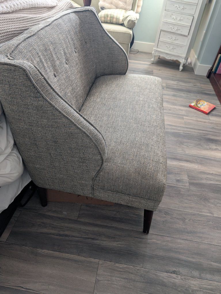 good condition... grey brown with a hint of blue fabric. perfect for a bedroom. message with questions.