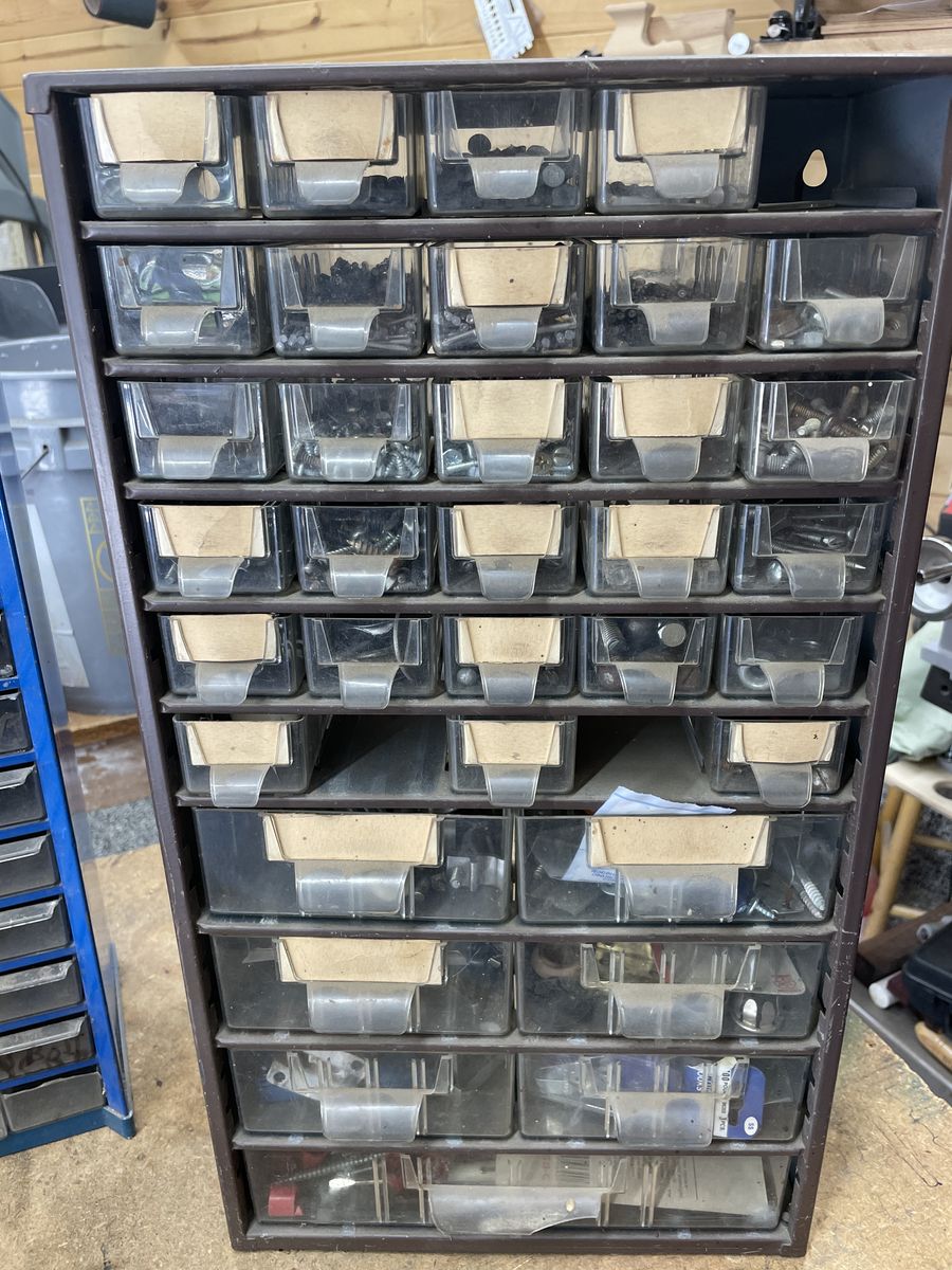 Small parts bins storage units well used but still usable $4 for the small one and $8 for the large ones or take all 3 for $15 there’s still hardware in some of these drawers you keep the hardware