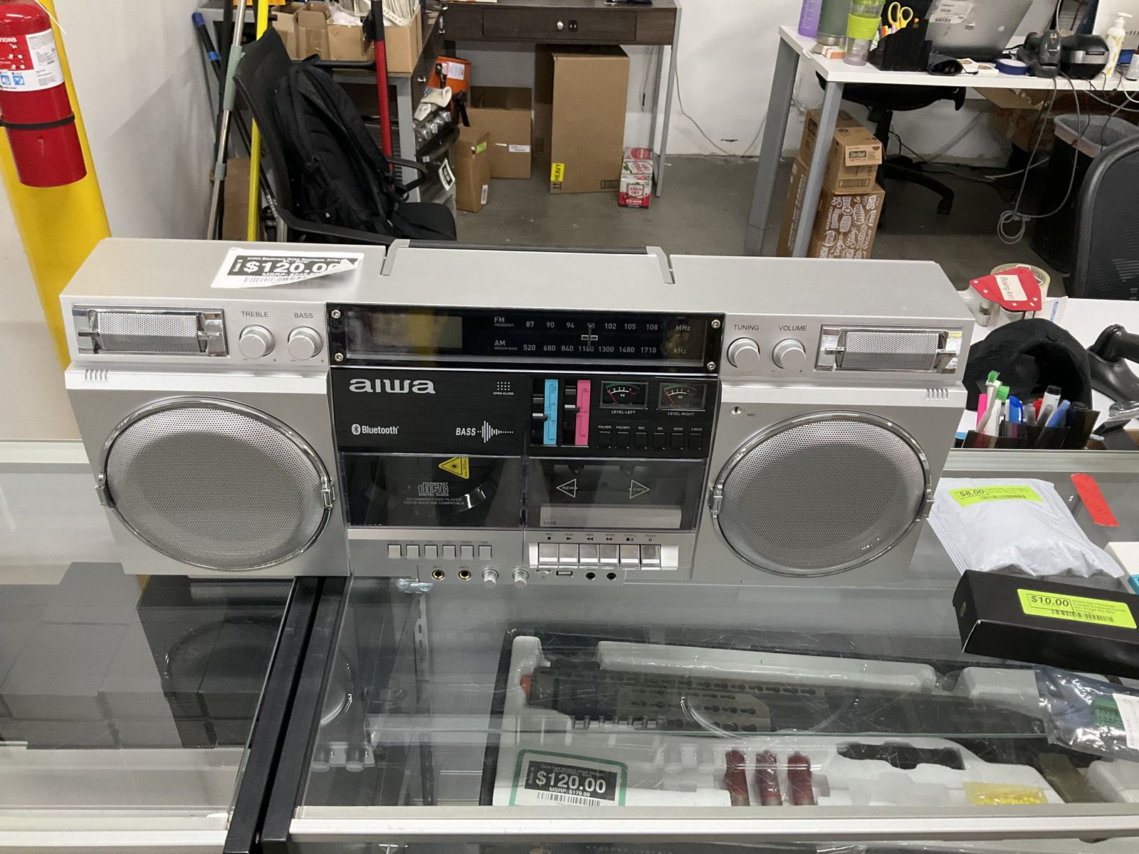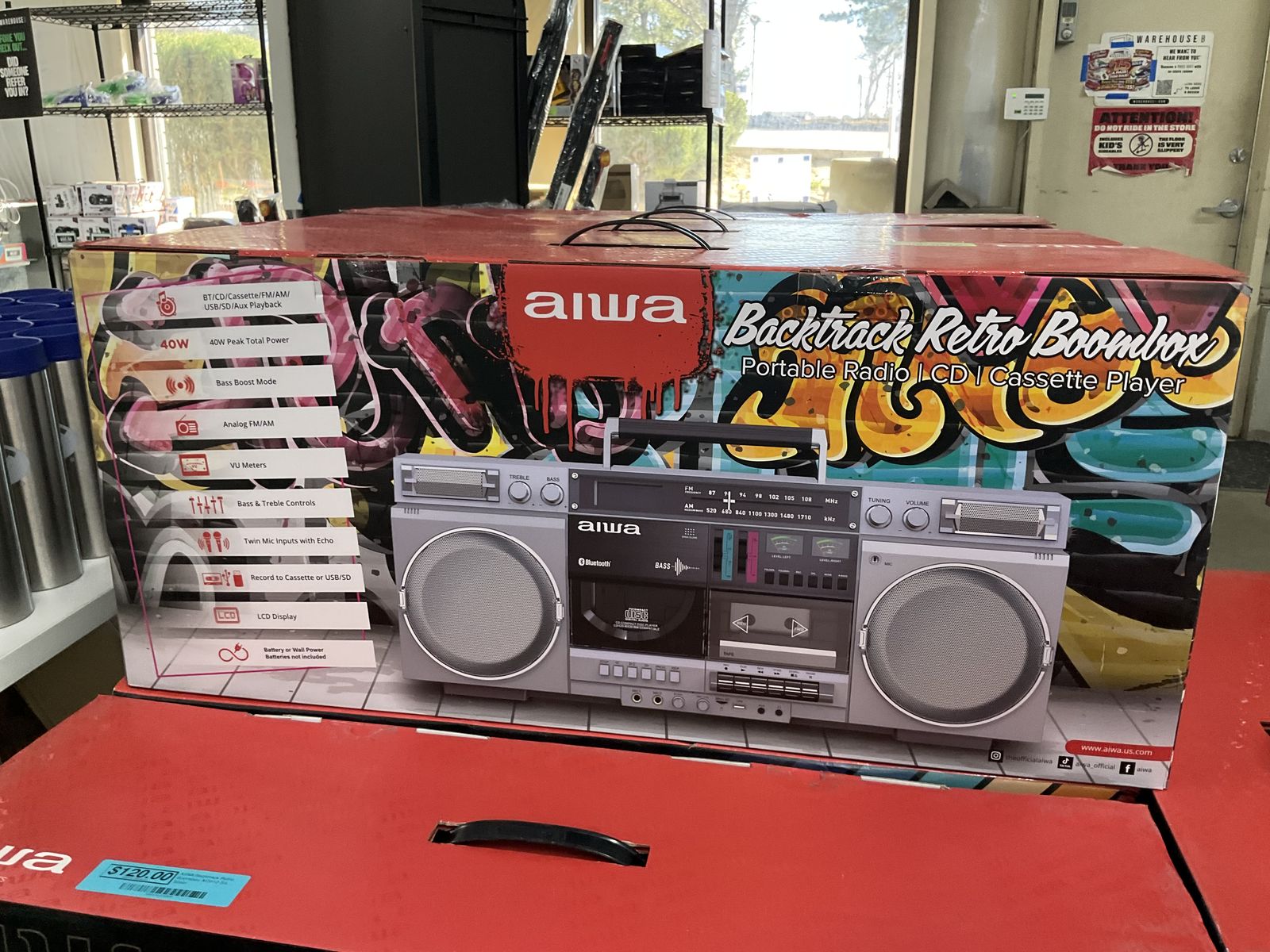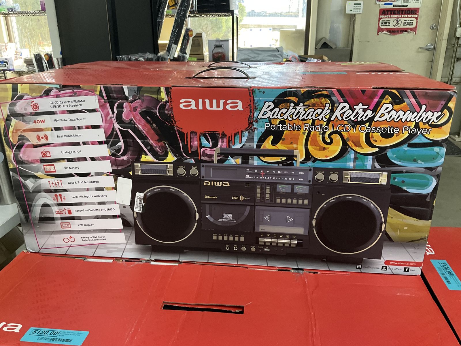 ApplePayAiwa Backtrack Retro Boombox — available in black and silver, classic retro style with modern sound. Our price $120 — MSRP $249.99!