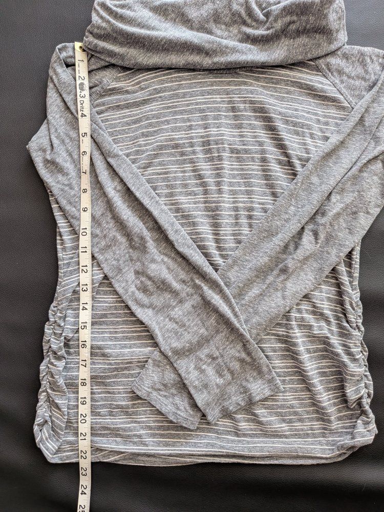 VenmoComfy Maurices long sleeve top. Grey with white stripes. Has a cowl neck and cute ruched sides. Size L. Measures about 19 inches across chest and 24 inches long. Great for everyday wear.