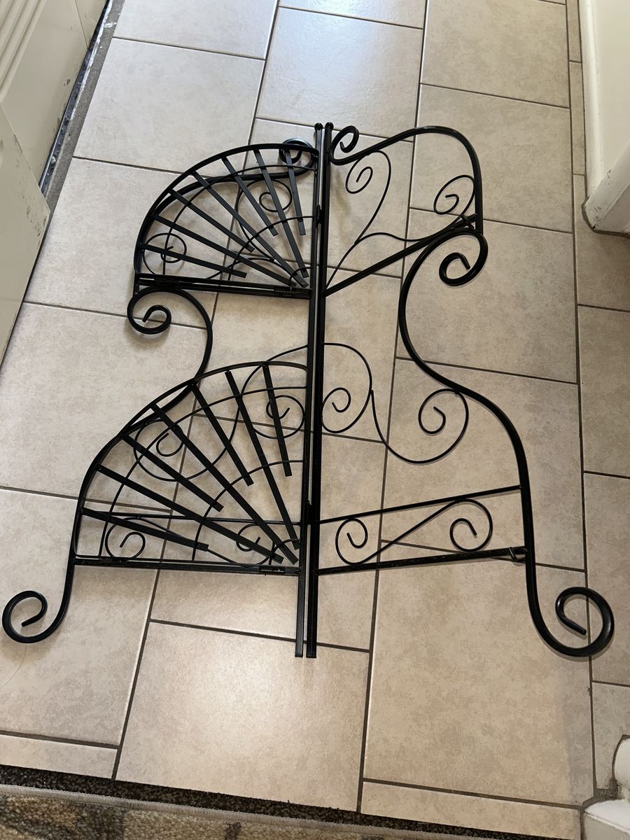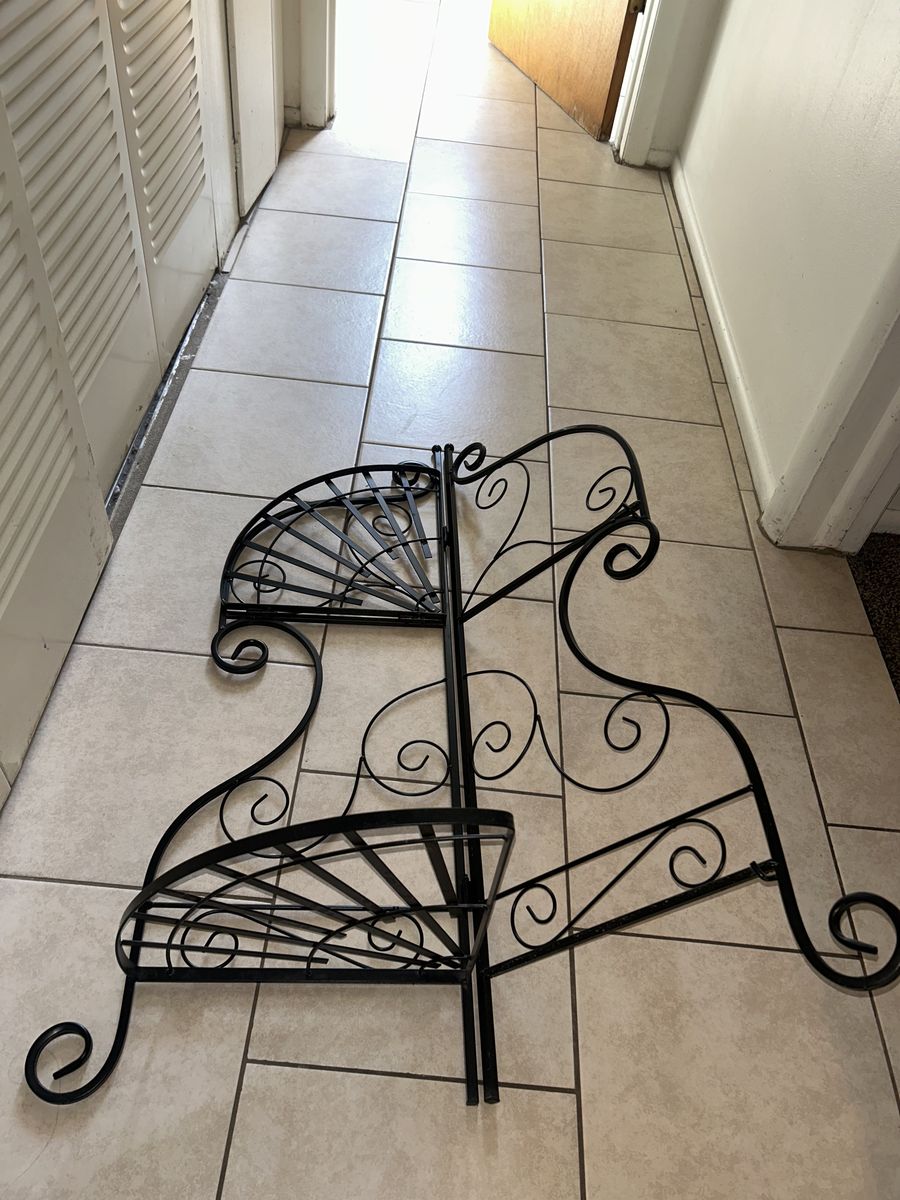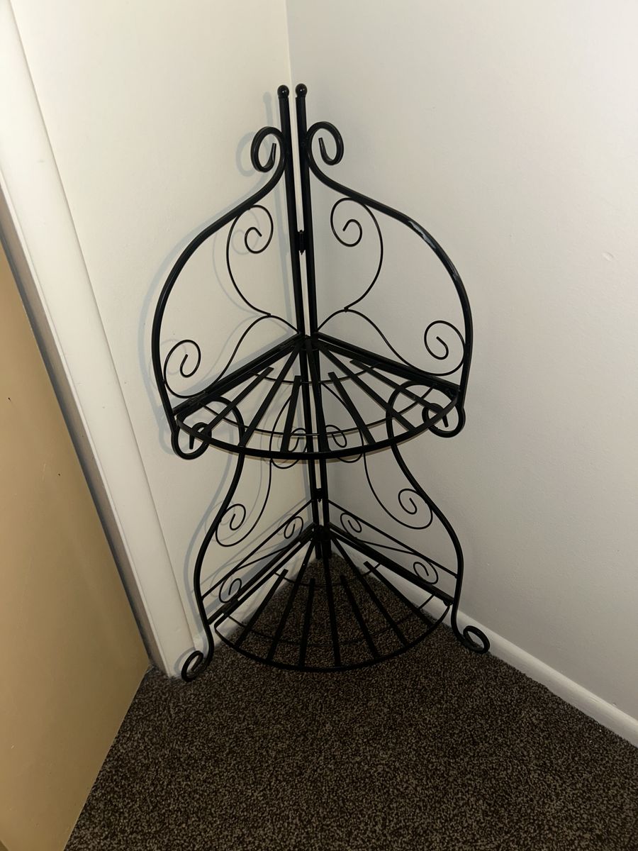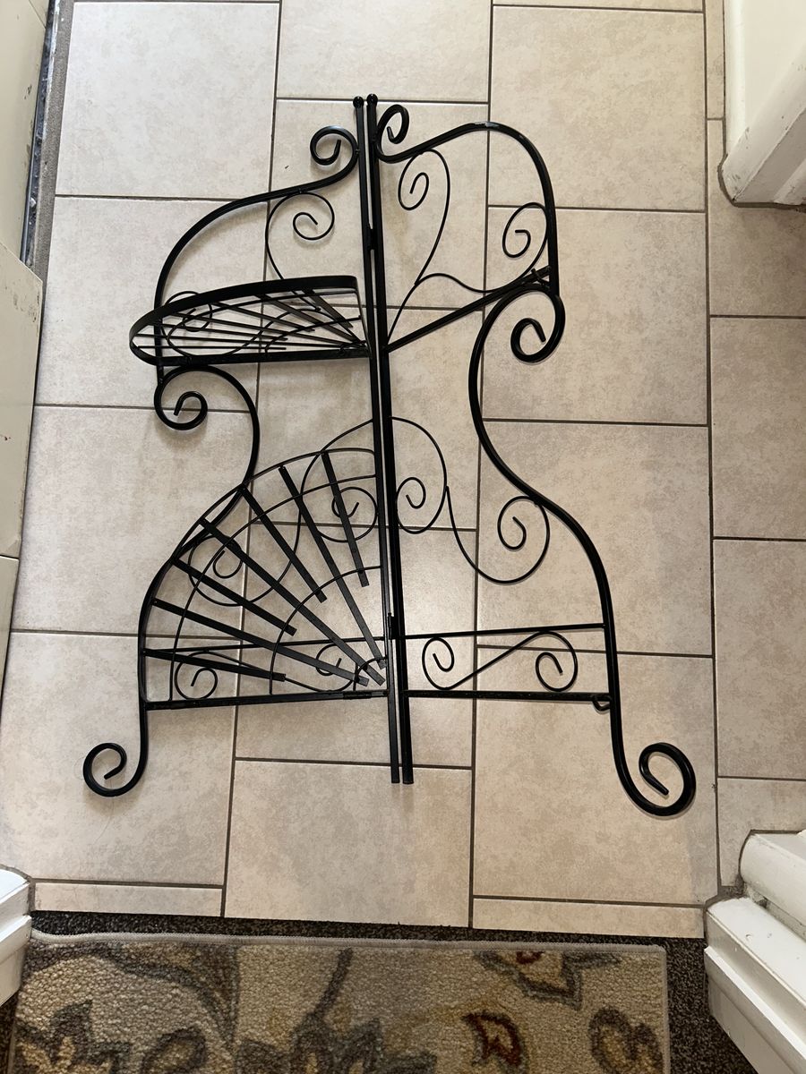 ApplePayThis collapsible two tier metal corner shelf is a practical and stylish space saving home decor piece. Perfect for plants, books, displaying items or as a stand alone ornate decorative piece.