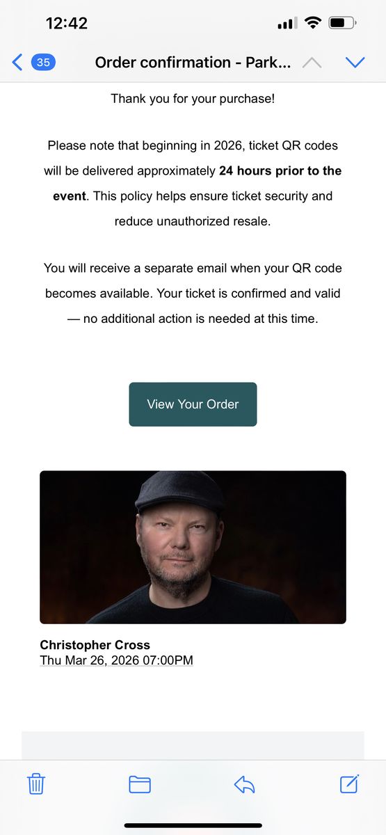 Two (2) tickets to the Christopher Cross Concert. Park City. $70 for each ticket, Section MAIN. Row O.