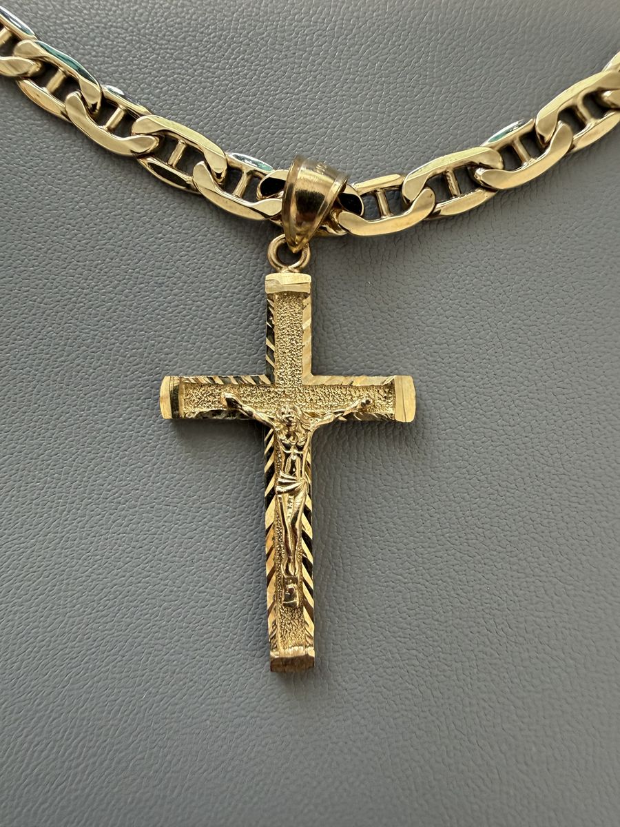 10K Yellow Gold Jesus Crucifix Cross Pendant Necklace. Italian Air Solid Gold Chain, with Solid pendant. Weighs about 14 grams.