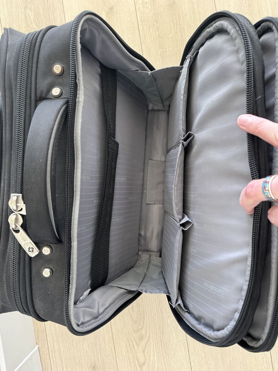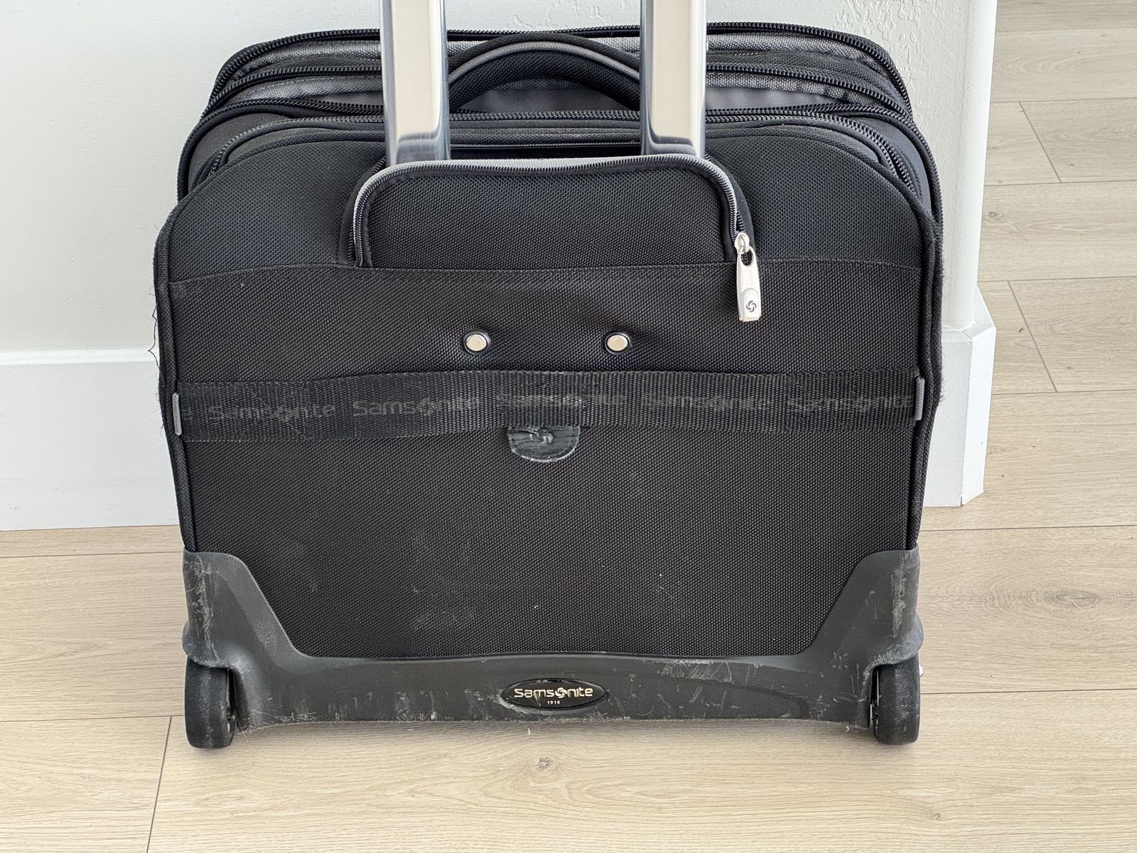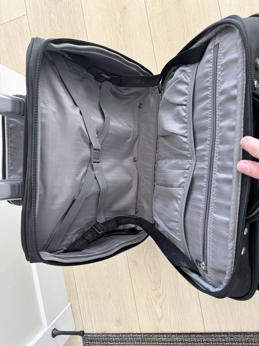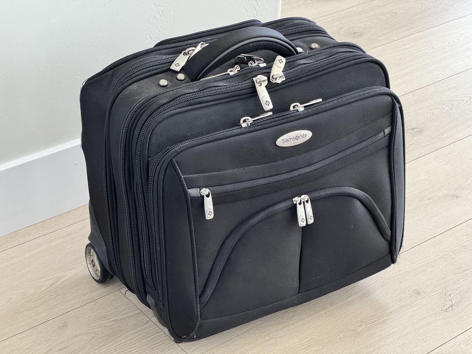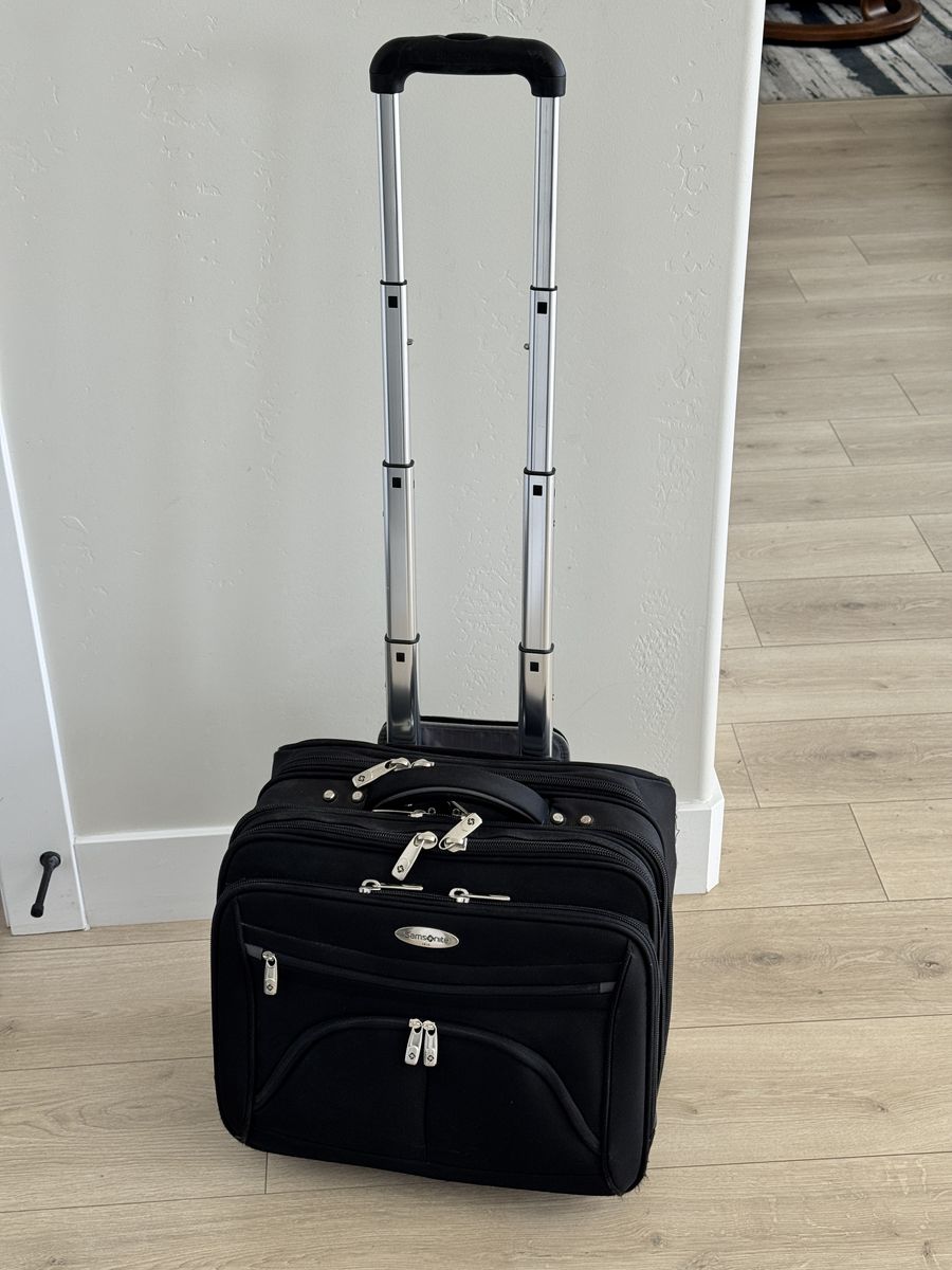 ApplePaySamsonite "Portable Office" carry-on bag/suitcase. Holds Laptop and MANY other items (See the details of the many pockets in the photos). Good condition. Nothing broken - handle telescopes smoothly. Plastic bottom panel and feet show normal wear.