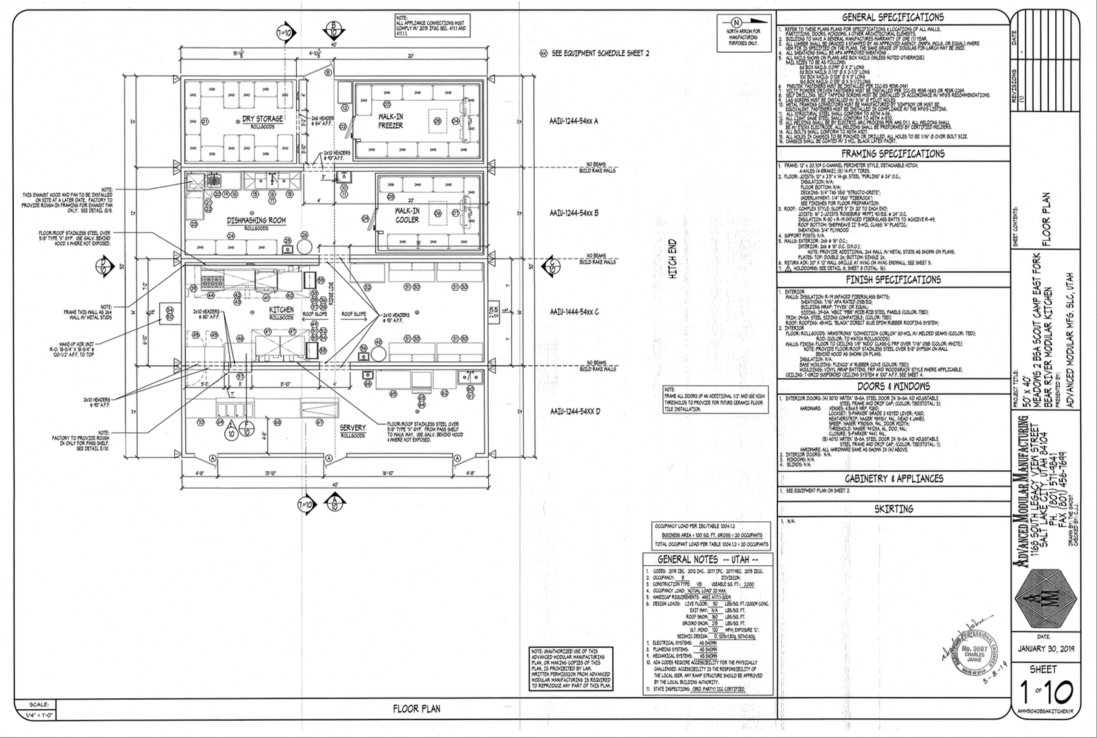 2,000 SF modular commercial kitchen facility constructed as a four-unit integrated building, originally built as a commercial kitchen for high-altitude use in the Uinta Mountains and later used by a Salt Lake City high school during campus renovation. The units were built by Advance Modular Manufacturing, Salt Lake City, Utah in 2019.