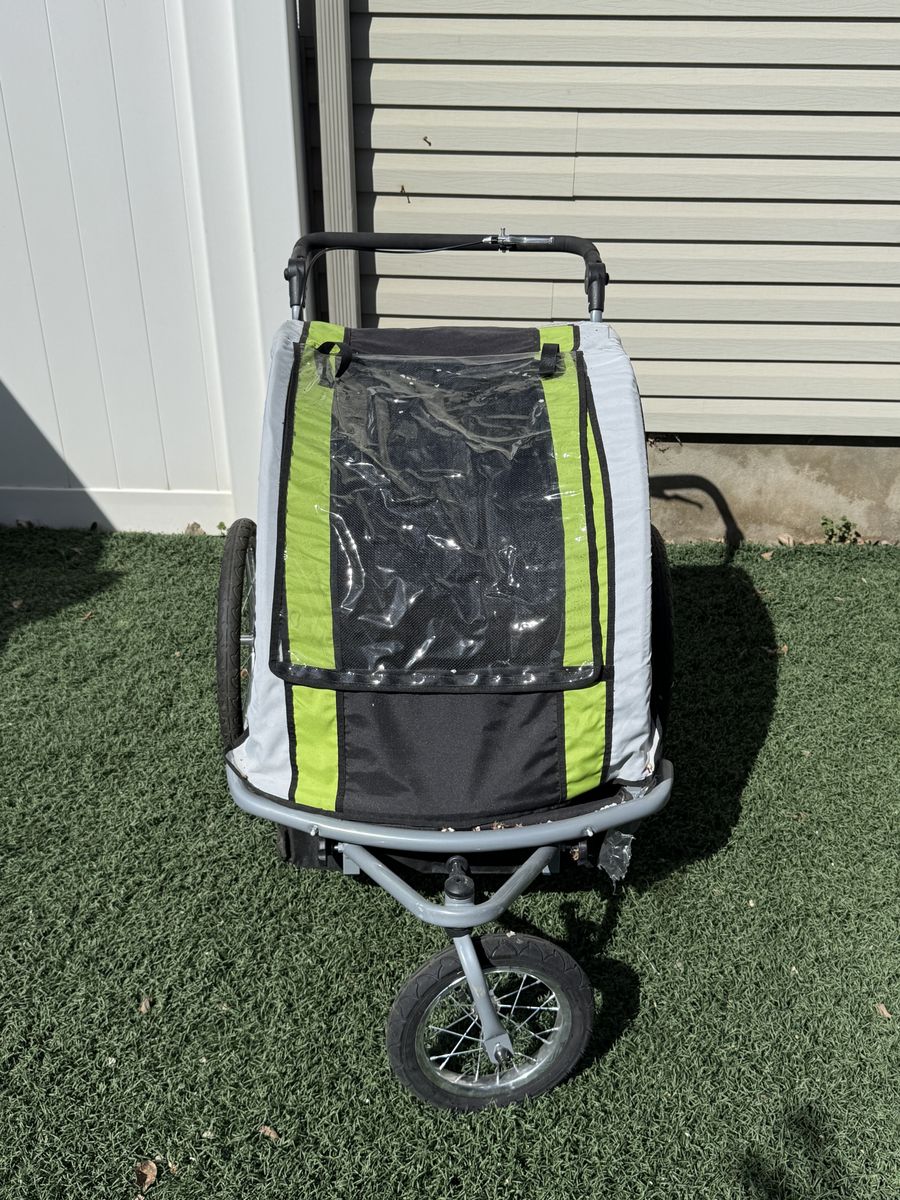 USE AS A BIKE TRAILER, STROLLER OR JOGGER - The convenient 3-in-1 design converts into a bike trailer, stroller, or jogger. It has a removable pivoting front wheel, great to use around the neighborhood, zoo, park, amusement park, sidewalks or trails. (Note: Bike Trailer feature will not work on a quick release bike) FOLDABLE - The strong steel frame assembles to fold flat for storage and transportation. In order to fold, the handlebar, safety knobs, and safety pins need to be removed. There is a push pin on the back of the frame to remove the rear wheels. BIKE HITCH INCLUDED - Universal bike hitch to rear axle included so you can use it as a trailer (The hitches may not be compatible with E-Bikes. Please measure your rear axle bolts to see if it will work with your Bike/E-Bike). The front wheel needs to be removed when using as a bike trailer. The trailer will remain upright even if bike tips over. PROTECTION & SAFETY - The top plastic cover, mesh window and tinted side windows provide protection in many weather conditions. Reflectors are included on all four sides of the trailer and on the rear wheels for extra safety. LARGE CARGO AREA: Inside cargo dimension 22"W X 24"D X 22" H approx. (22"W X 24"D X 26" H including foot rest area). Double seat with two sets of seat belts for two kids. Max Weight Capacity: 88 lbs