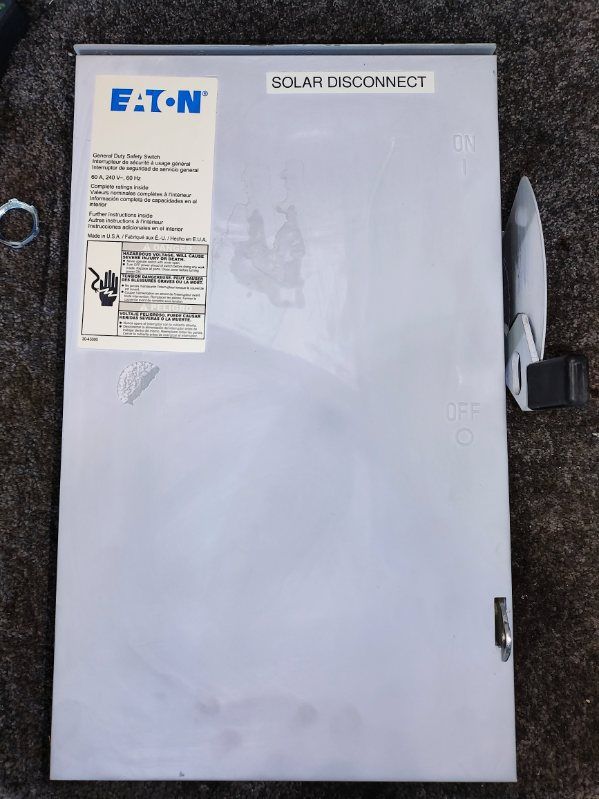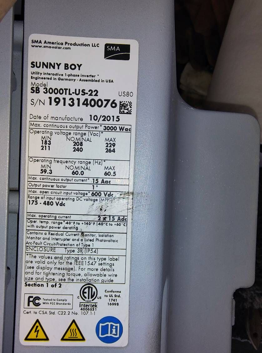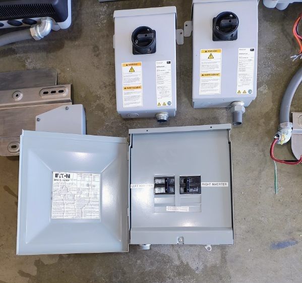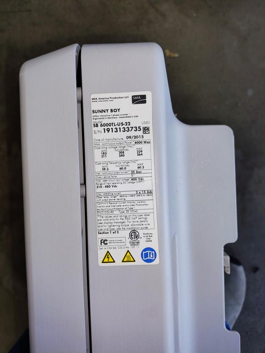 PayPalHere are all the components necessary (Minus Panels) to build a 9KV Solar System. Included are 2- SMA Sunny Boy Inverters (1-SB 6000TL and 1- SB 3000TL), 2- Individual Shut-Off Switches for the Inverters, 1- Breaker Panel for the Inverters, 1- Meter Box With Net-Metering Meter, 1- Fused Main Shut-Off Panel to disconnect Solar System from power grid, 1- 100 Amp Main Breaker, and 2- Mounting Brackets for the Inverters. All of the components are in excellent condition and fully functional. Will sell only as a set. I am selling these items because I have moved up to Tesla Powerwalls which have their own inverters. Local Pick-Up Only. Payment is by either cash or PayPal. I would be happy to address any questions you may have . I am willing to consider all offers. Thanks for looking.