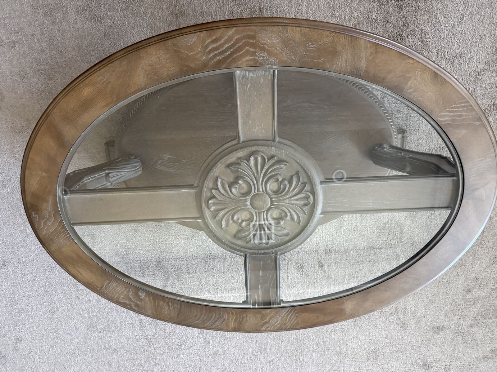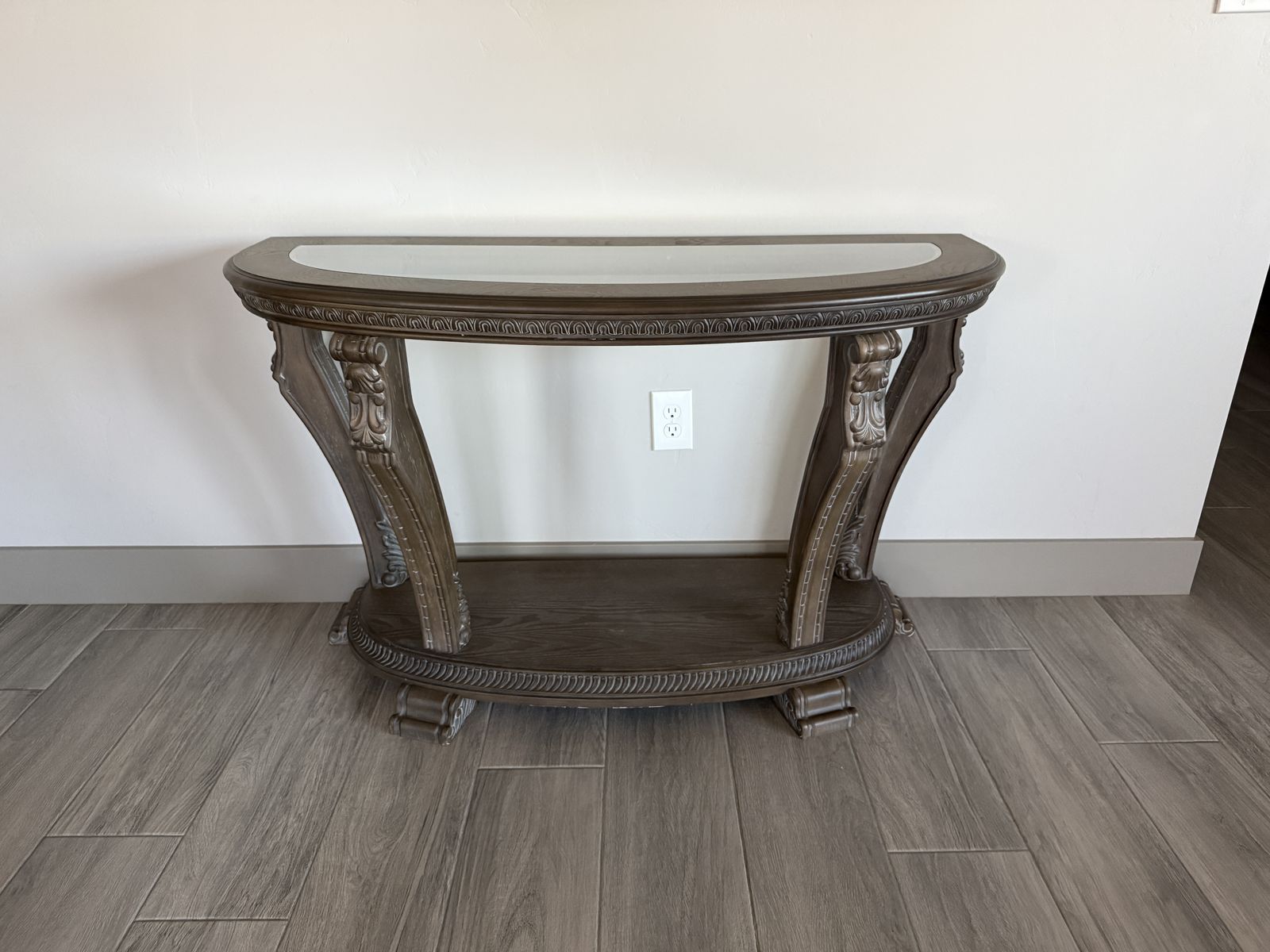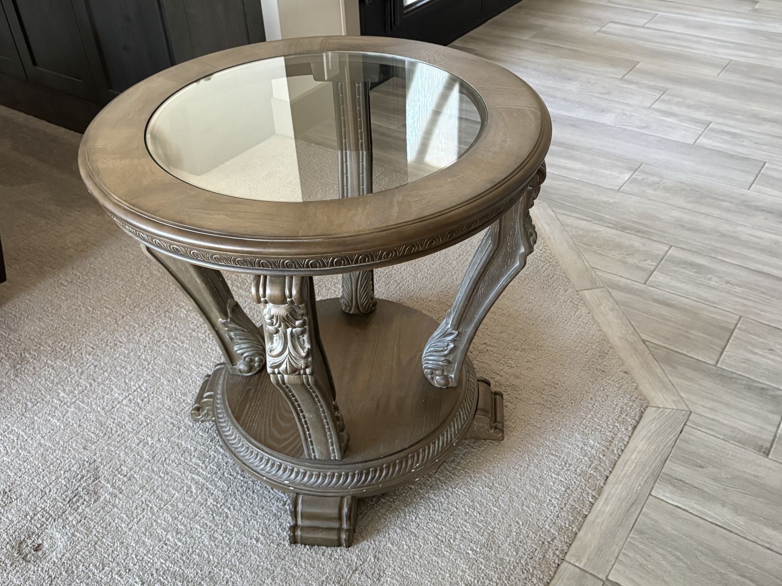 Beautiful and elegant living room furniture with light brown/gray distressed wood with glass table tops. $600 for the set of 3 pieces.