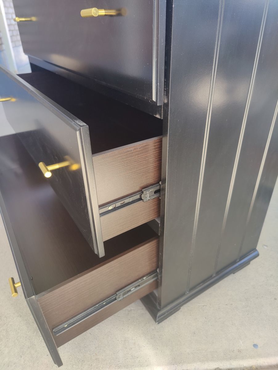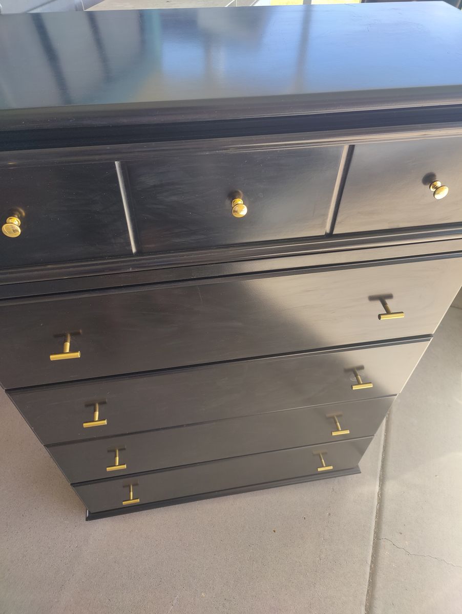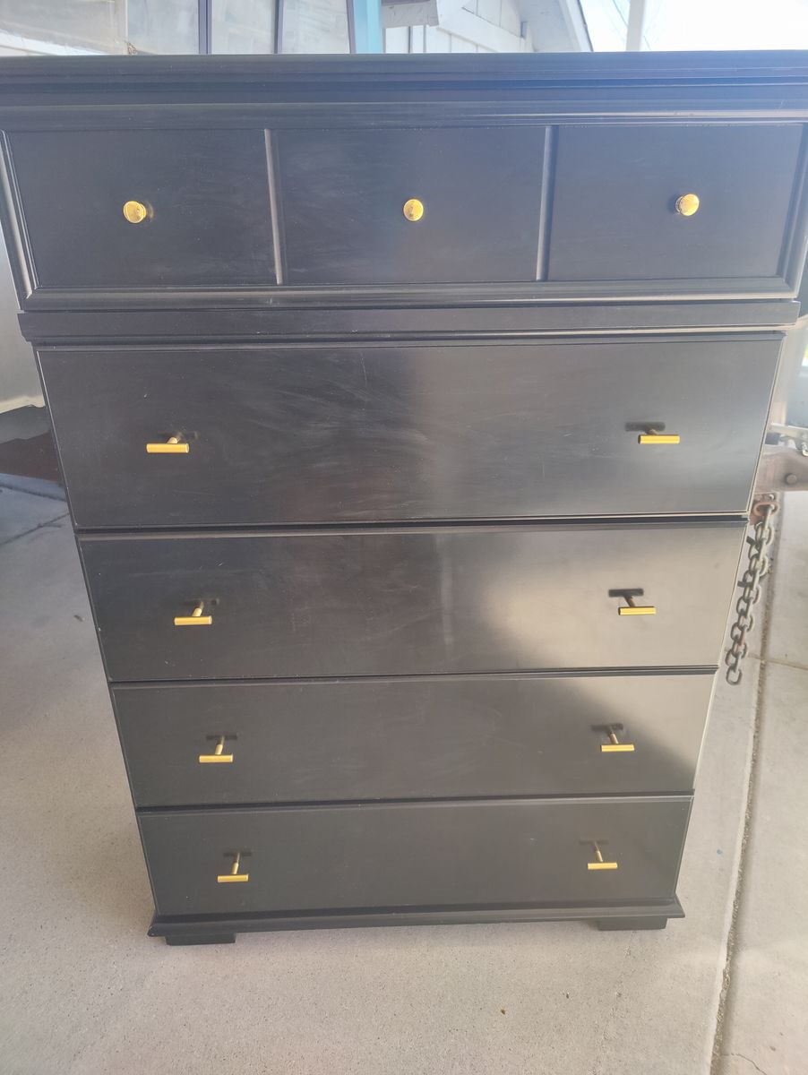 VenmoBlack dresser with 5 deep drawers (all slide nicely) and gold hardware. Beautiful piece of furniture that's in really great condition. It's 55.25" tall, 38.25" wide, and 16" deep.