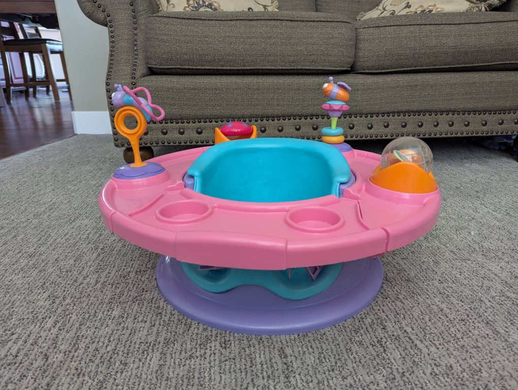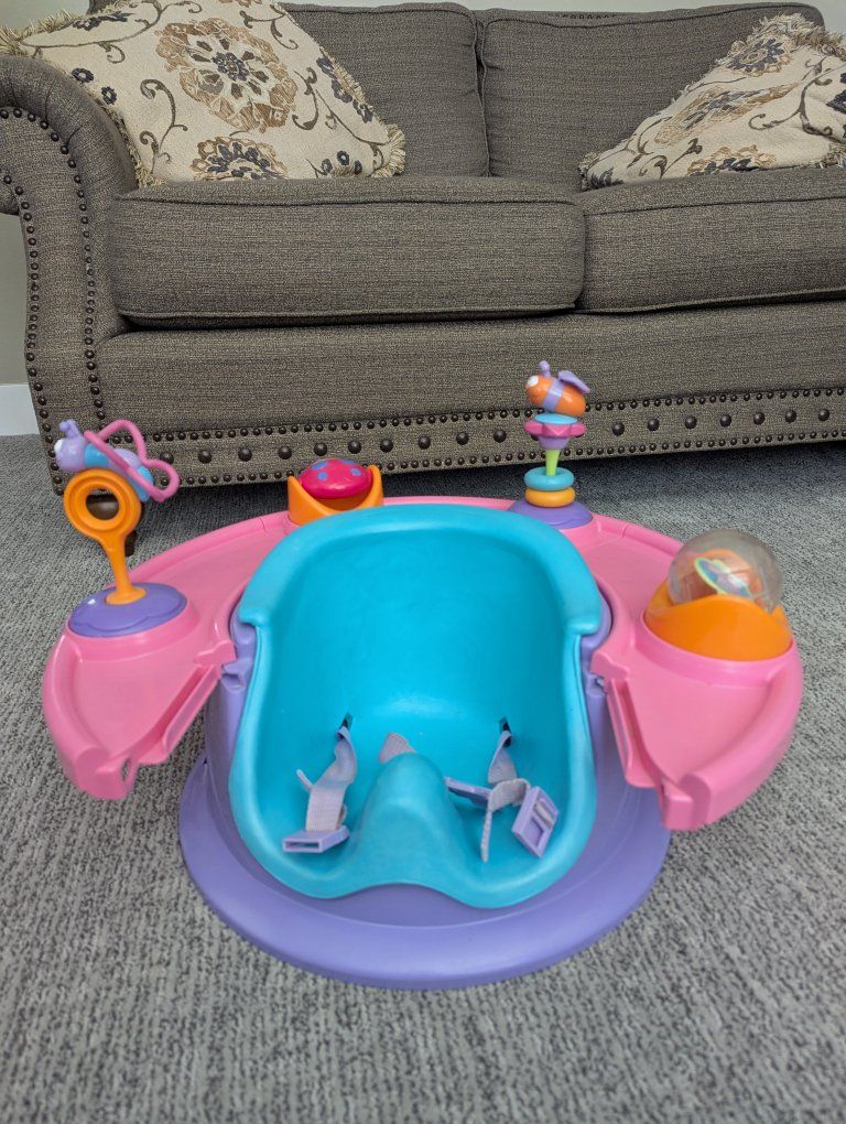 VenmoThis Bumbo with attached tray is great for keeping your baby safe and entertained when you need both hands for awhile. Part of the tray is removed to put baby in then you can rotate the tray around.