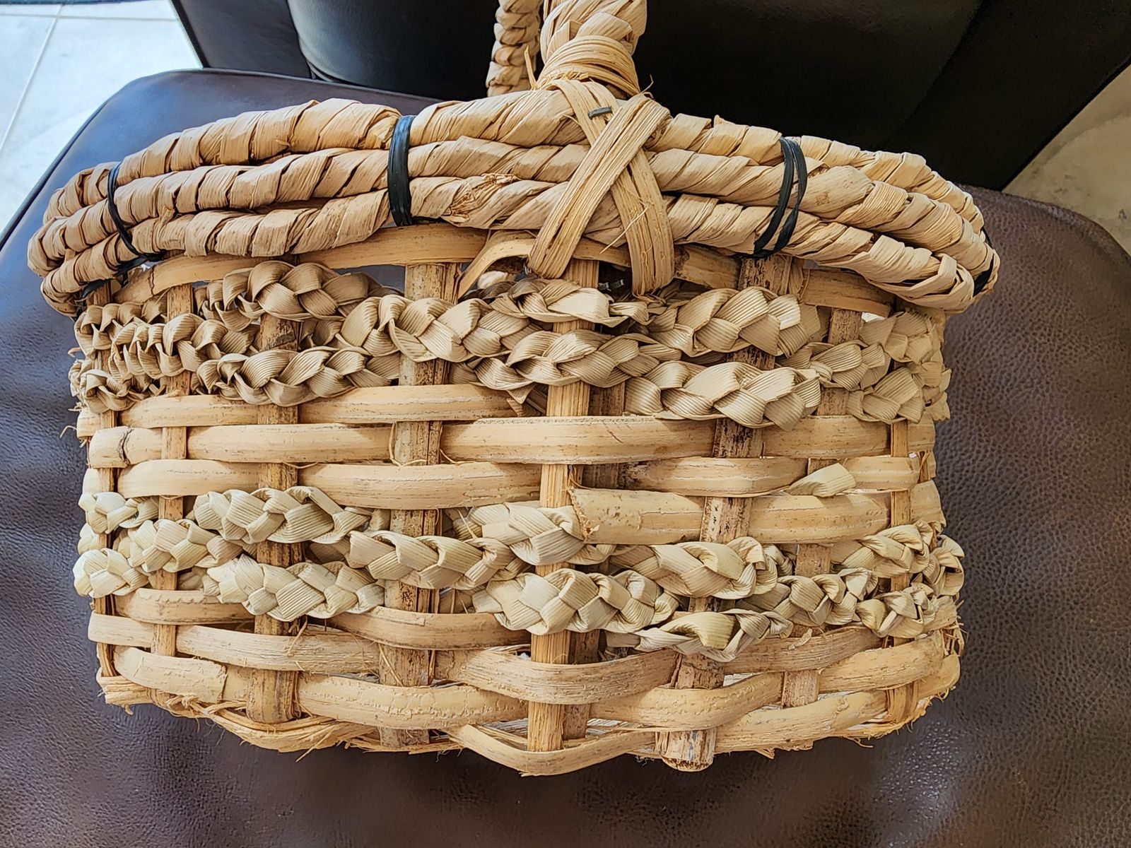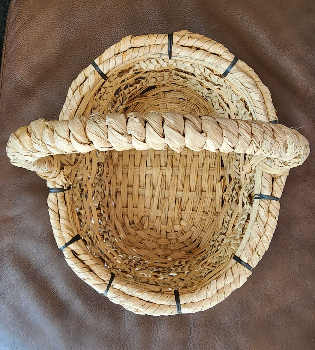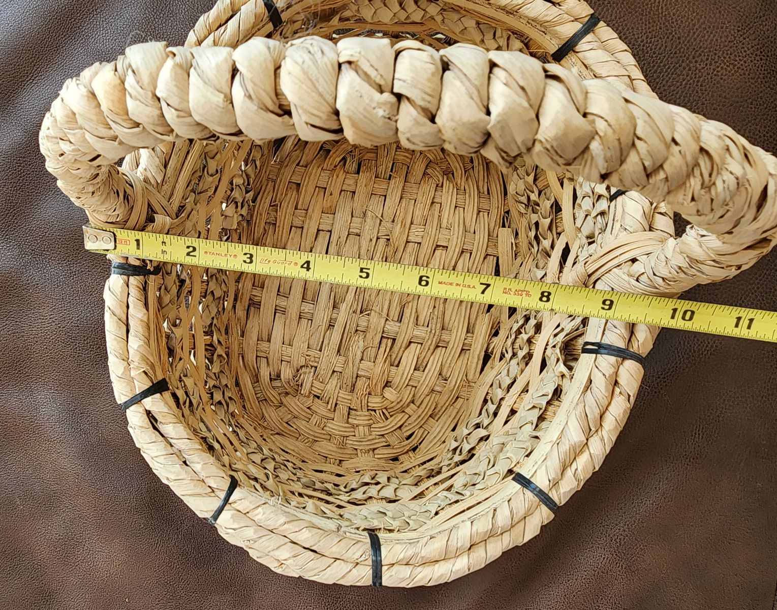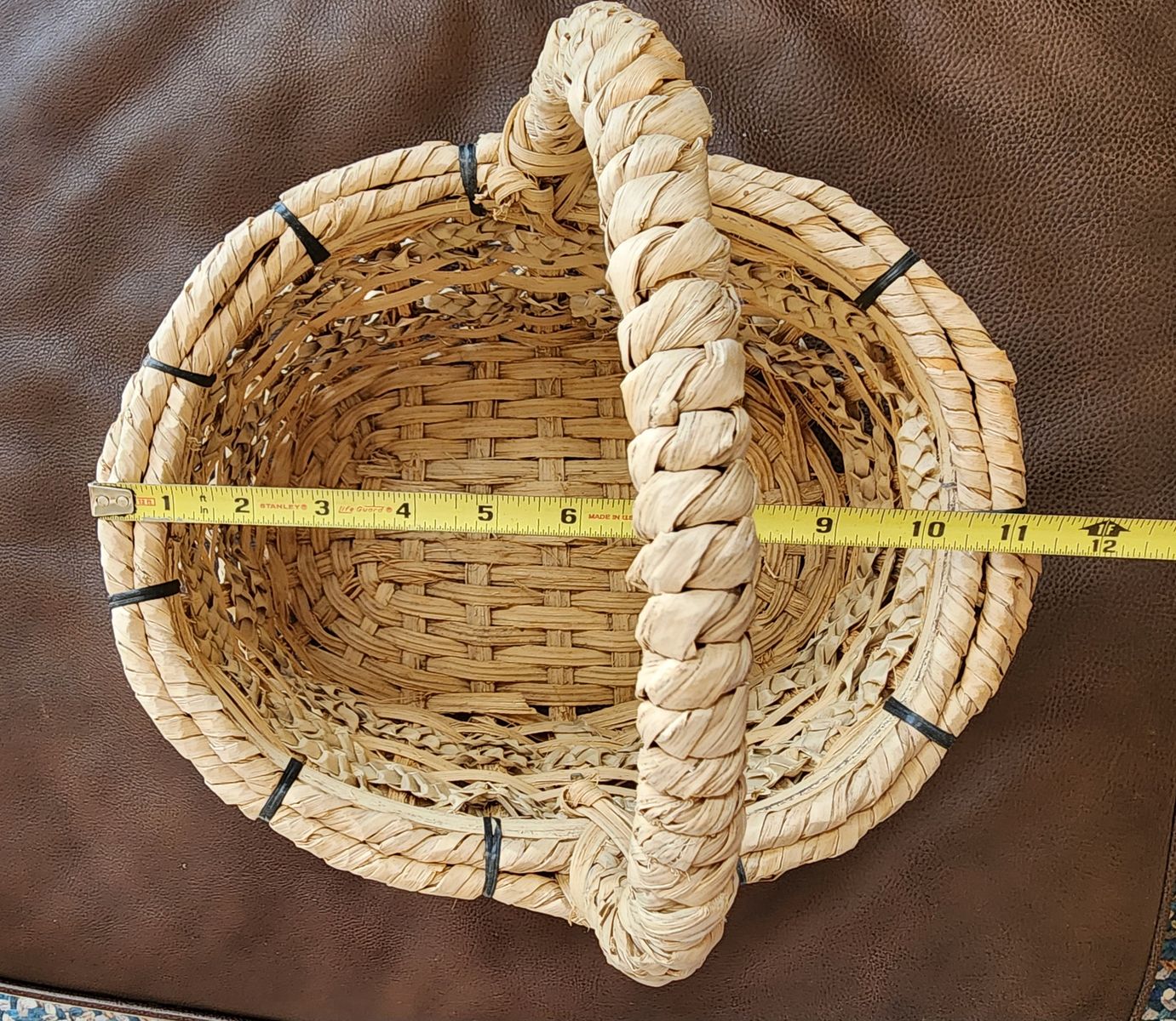 VenmoMedium size basket, combining different materials and weaving, braiding and wrapping. 12"x10", 6" to top of basket, 11 1/2" to top of handle. Would make a beautiful Easter basket.