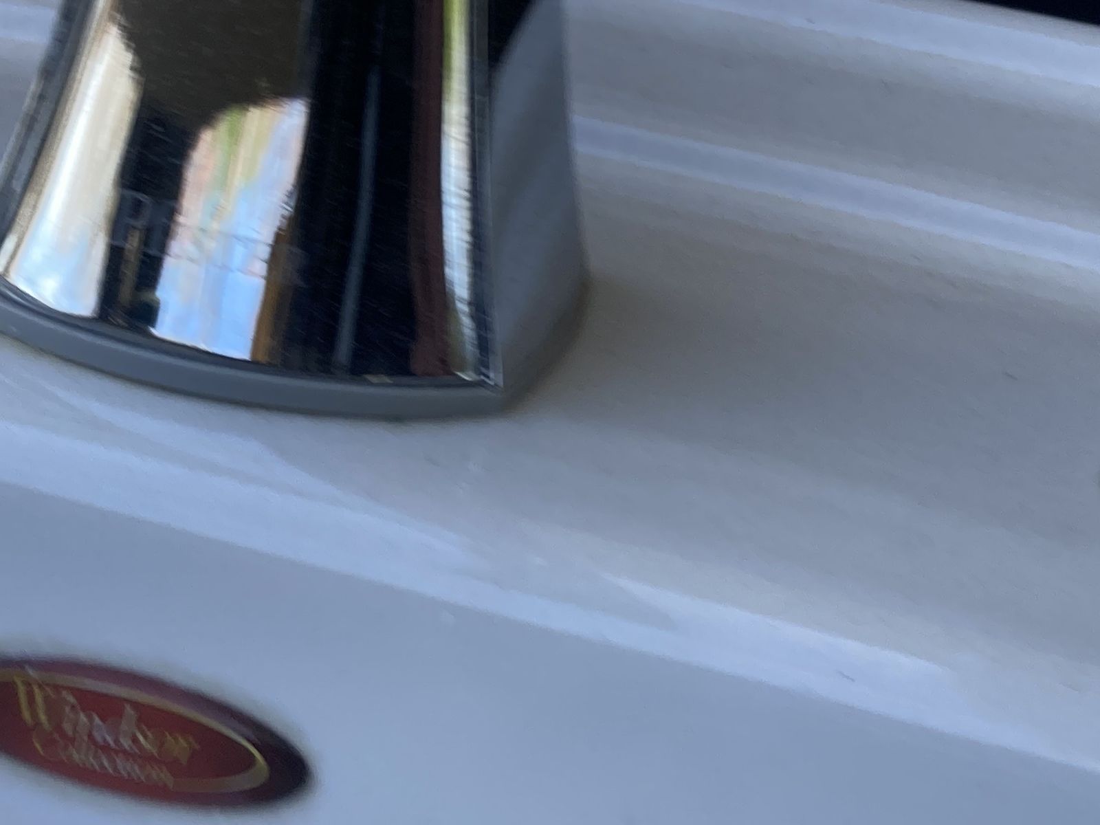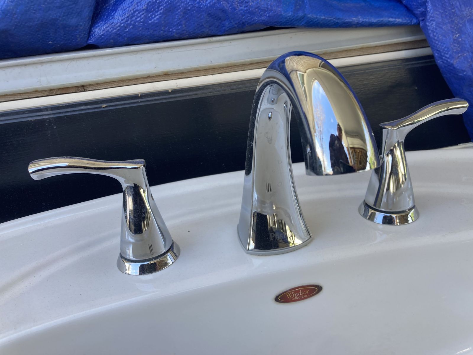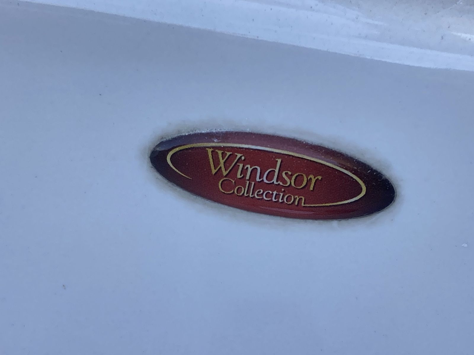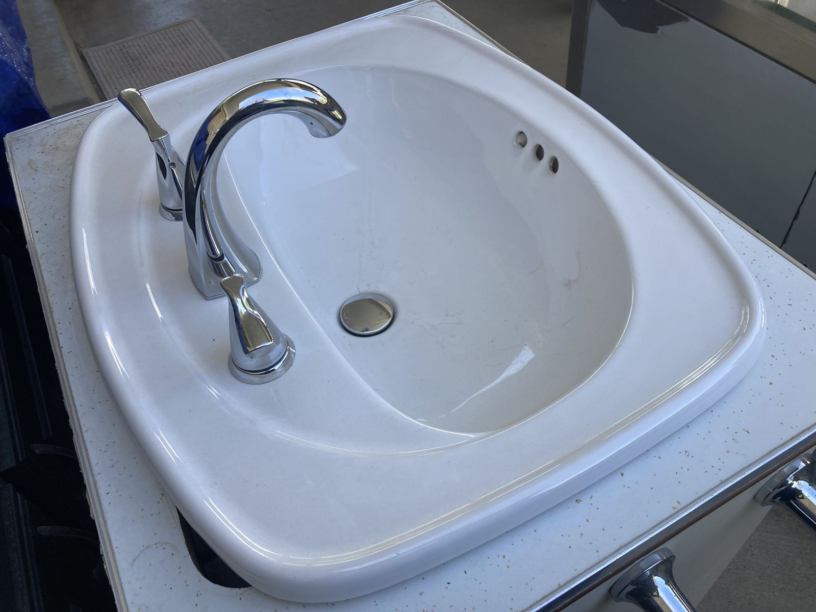 Sink: "Windsor Collection" spacious white ceramic drop-in bathroom sink with three holes drilled and overflow. Dimensions (approx):