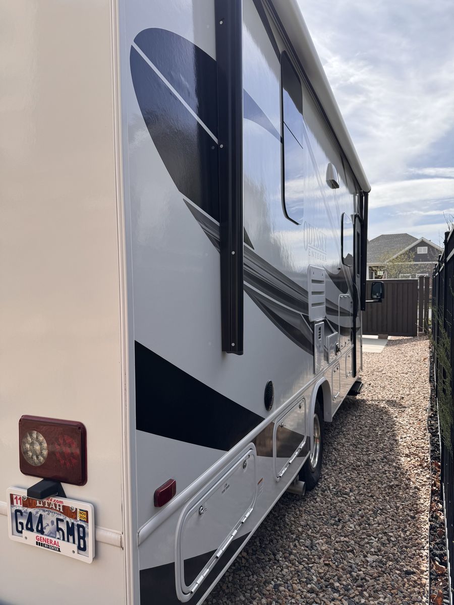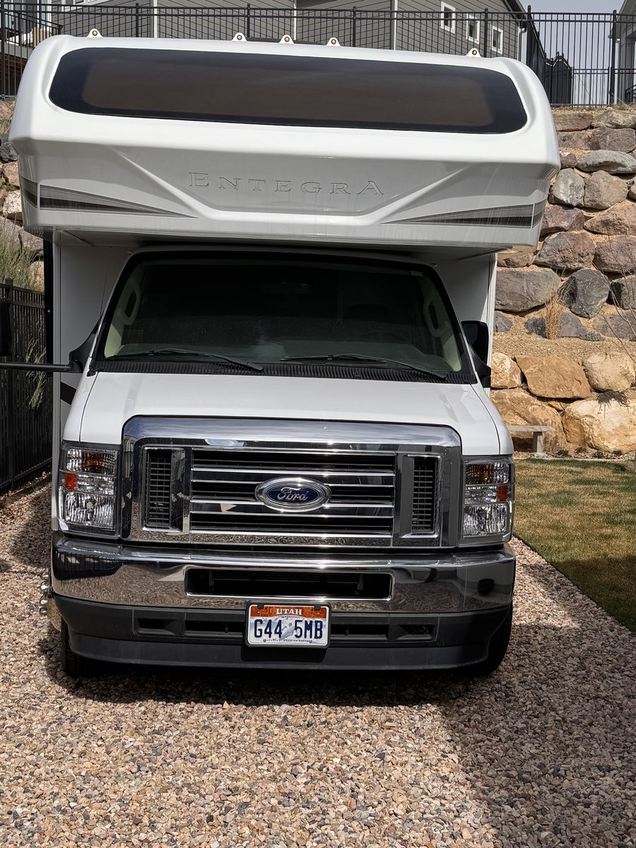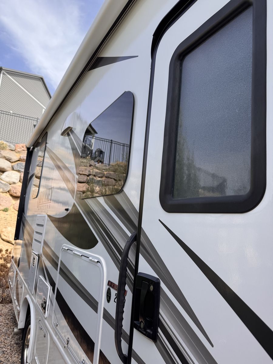 Entegra Coach Odyssey Class C gas Motorhome 24 B. Full-wall slide- U-shaped dinnette- cab-over bunk- 16" electric awning- exterior TV- E-Z Drive- Sleeps 5- clothing wardrobe- E 450 HP Super Duty engine- towing capacity from 7,500 hitch- tire pressure mmonitoring system- queen bed- 26.67" length- Apple Car Play/Android- back up camera- the kitchen offers a recessed stainless steel sink- LED-lit countertops- decorative backsplash- pop-up charging station on kitchen counter.