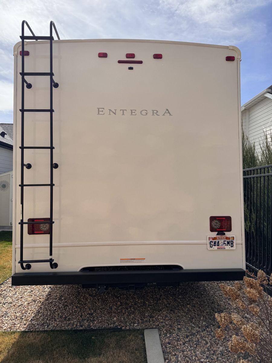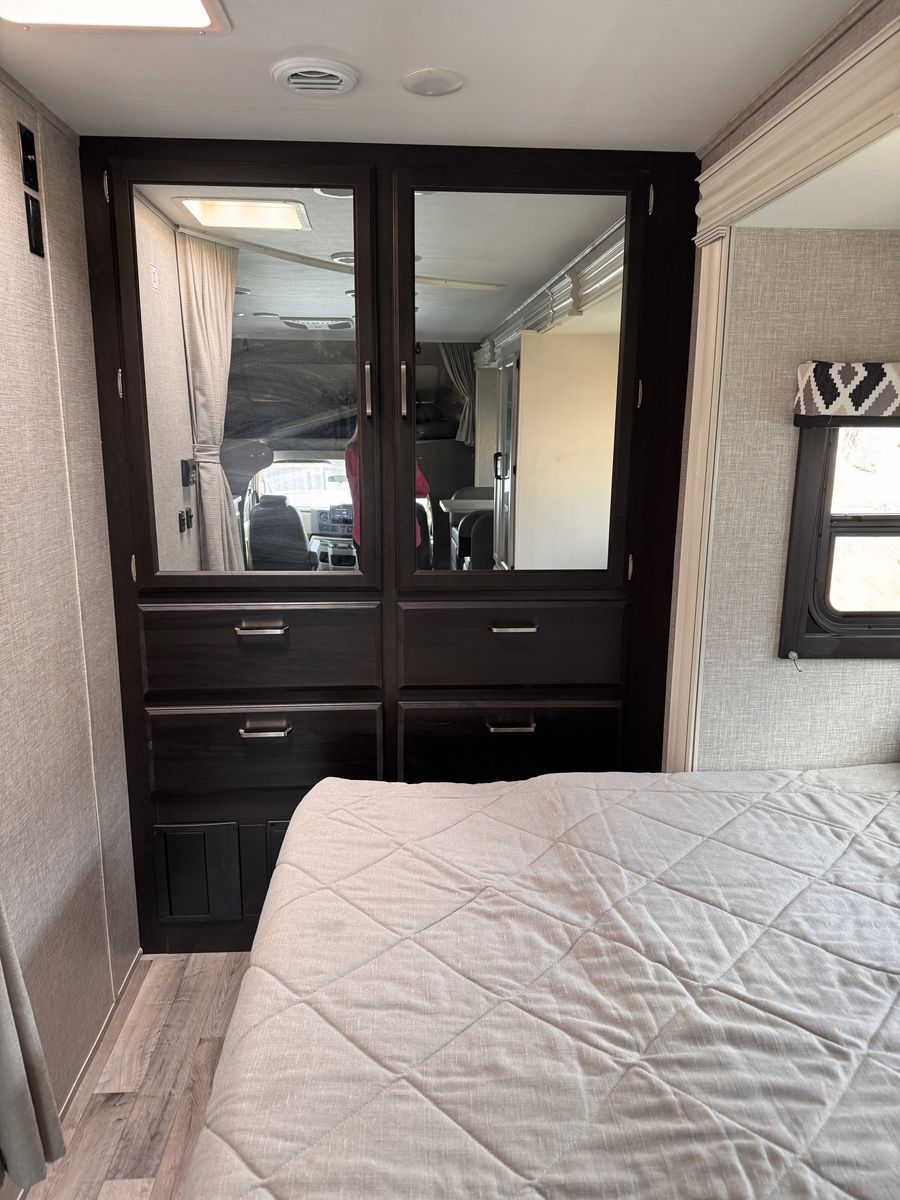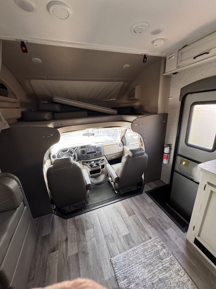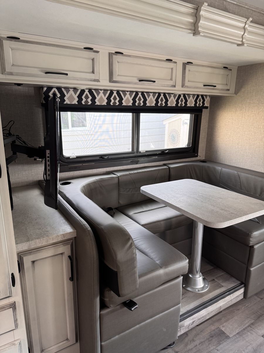 Entegra Coach Odyssey Class C gas Motorhome 24 B. Full-wall slide- U-shaped dinnette- cab-over bunk- 16" electric awning- exterior TV- E-Z Drive- Sleeps 5- clothing wardrobe- E 450 HP Super Duty engine- towing capacity from 7,500 hitch- tire pressure mmonitoring system- queen bed- 26.67" length- Apple Car Play/Android- back up camera- the kitchen offers a recessed stainless steel sink- LED-lit countertops- decorative backsplash- pop-up charging station on kitchen counter.