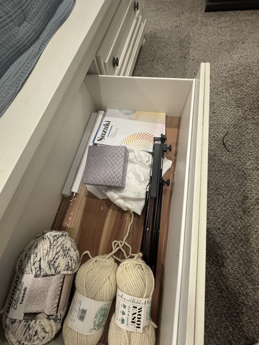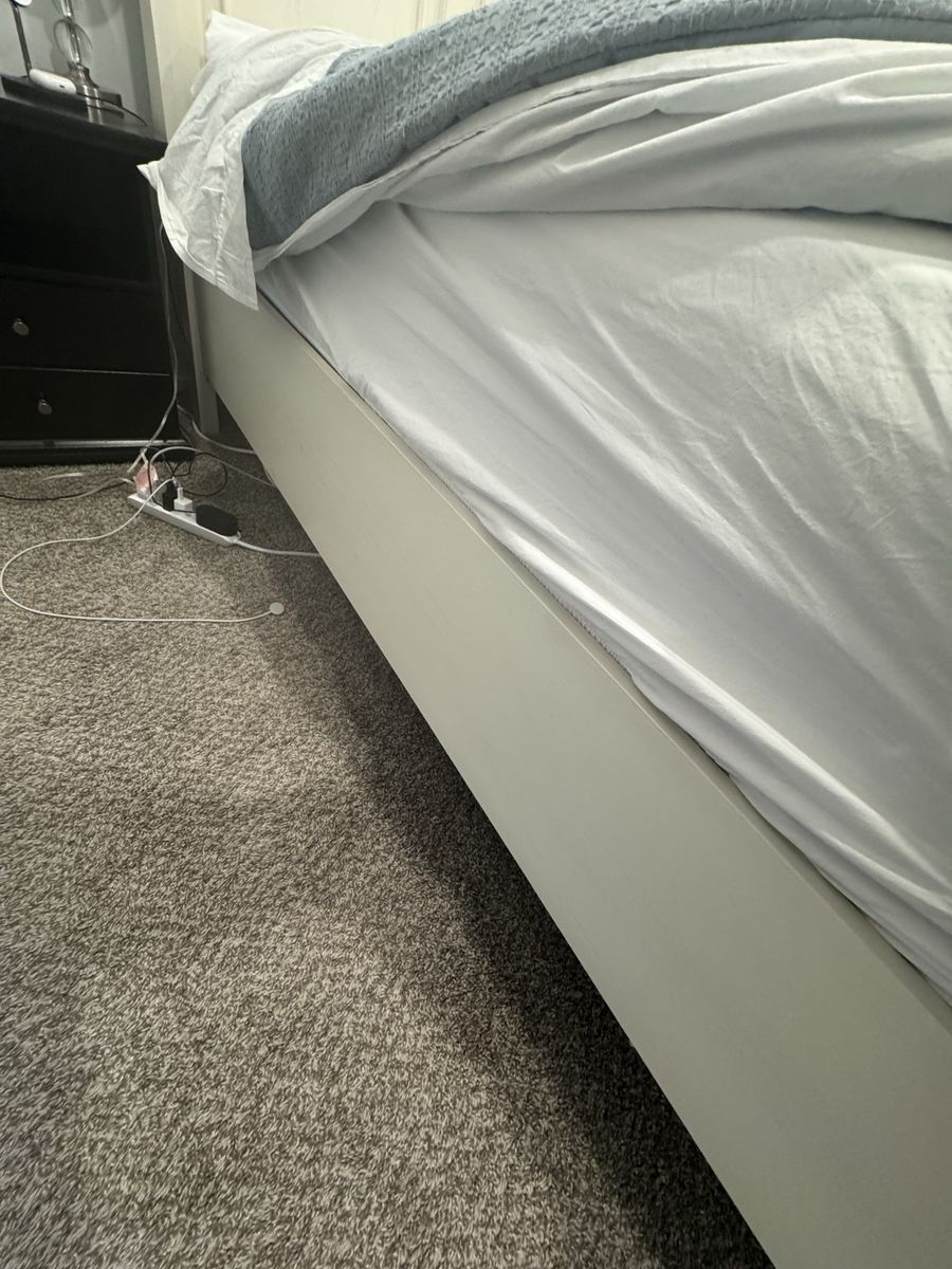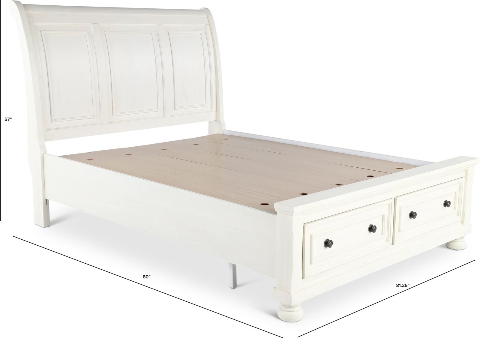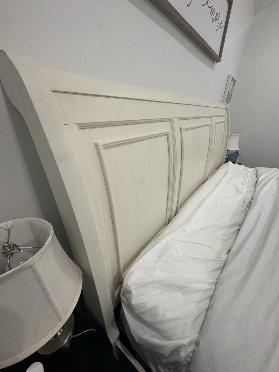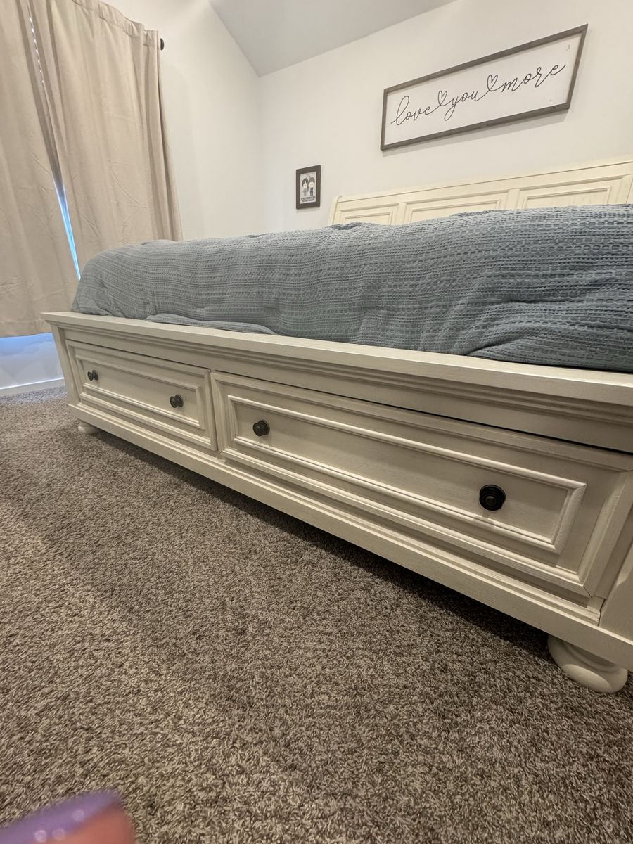 VenmoLike new king storage sleigh style bed. Super nice, off white finish. Box spring not required. Pick up only. I will take it apart but you will need to bring help to move the pieces. Headboard dimensions: 80.5"W x 11.5"D x 57"H Footboard dimensions: 81.25"W x 22"D x 21.75"H Drawer dimensions: 35.5"W x 19.5"D x 10"H