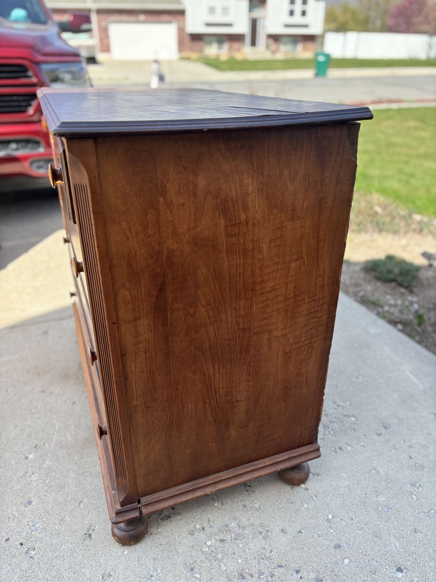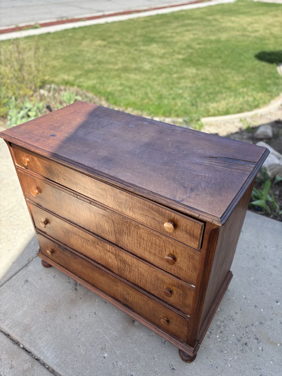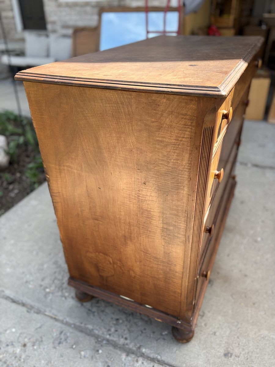 VenmoThis beautiful antique dresser/chest of drawers needs a makeover. It does have peeling and chipped veneer. All drawers are quite large for extra storage. It sits on four beautiful legs and has original wood handle. The sides, top and fronts all have chipping veneer. This piece is over 100 years old. The wood on it is absolutely beautiful and would be great restored. It does need some glue for the structure of it. Selling for less than I paid. My loss is your gain!  Dimensions: 45W 22D 38.5T