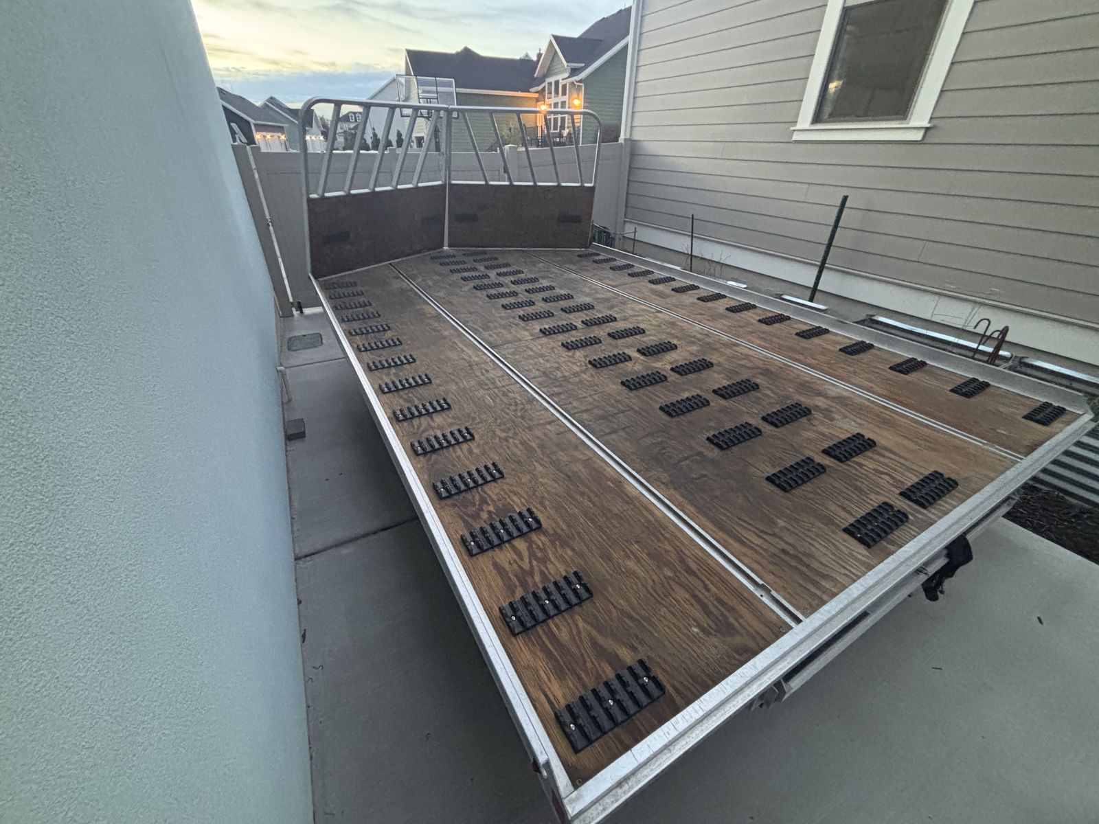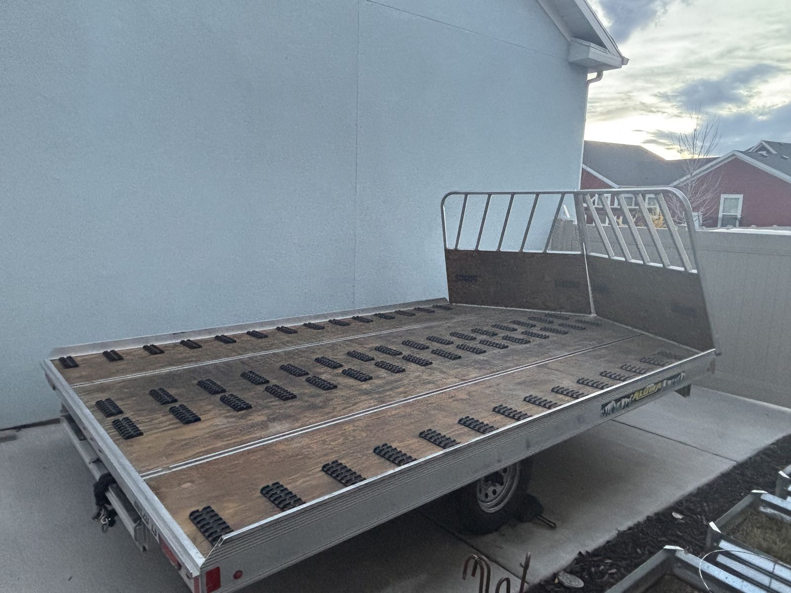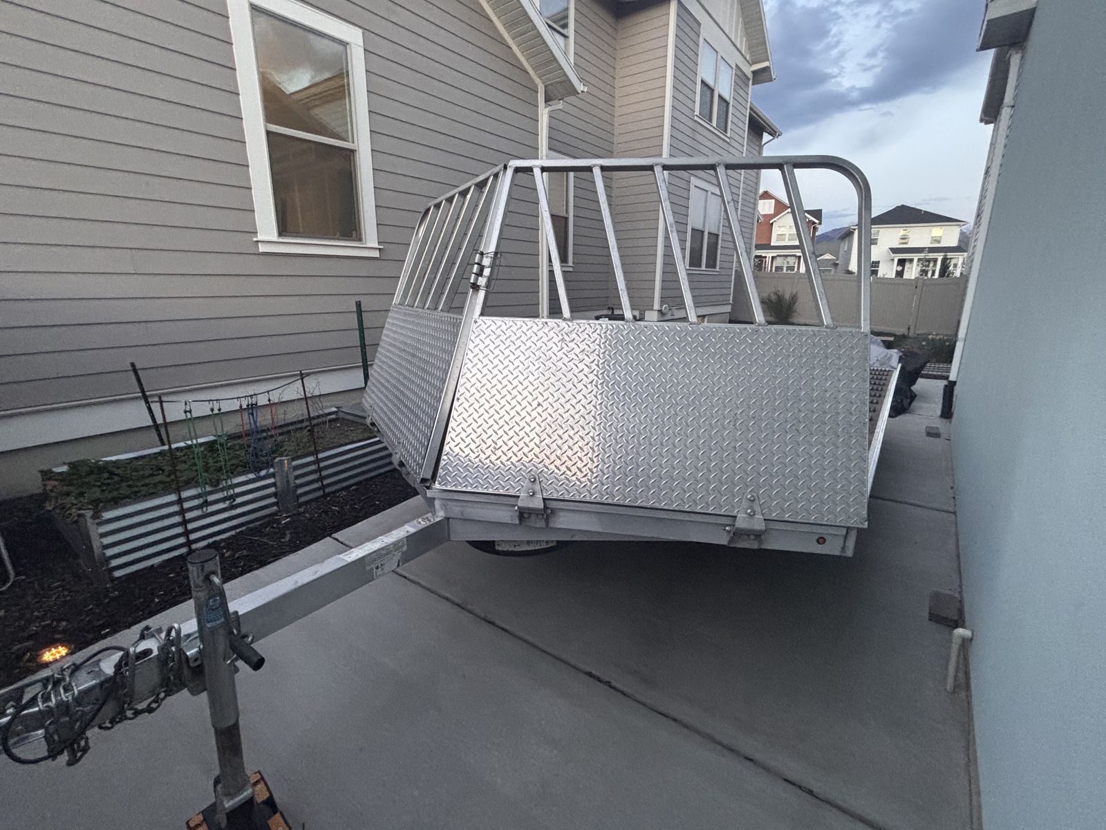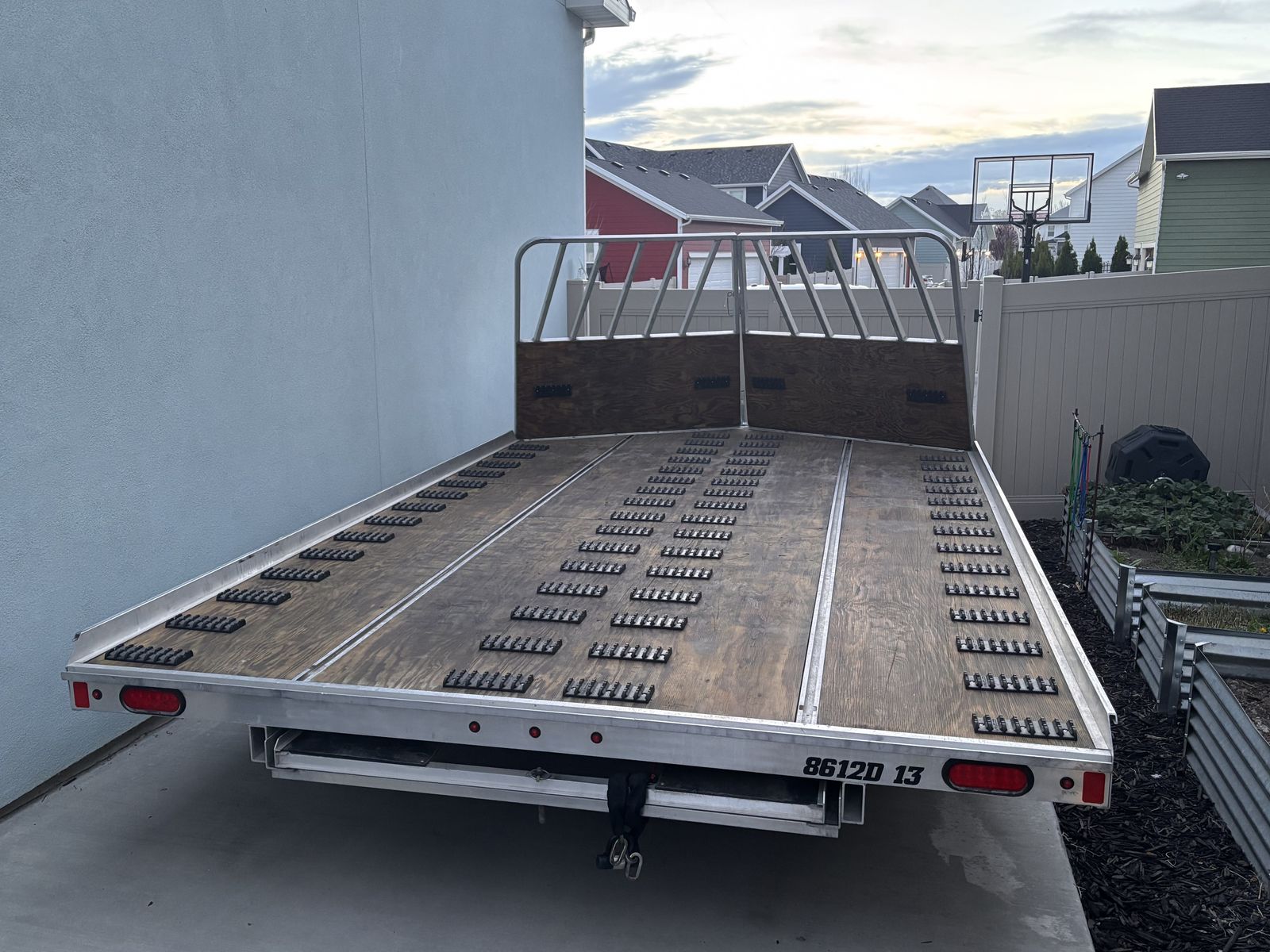 Aluma brand aluminum snowmobile trailer. 12’ deck, single axle, with 13” wheels. Has ski guides installed. Pulls super easy due to its light weight. Has two ski hold down bars.
