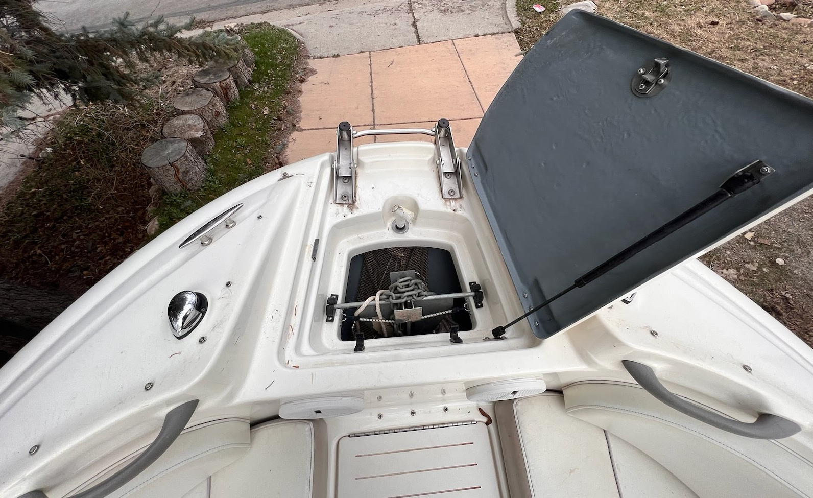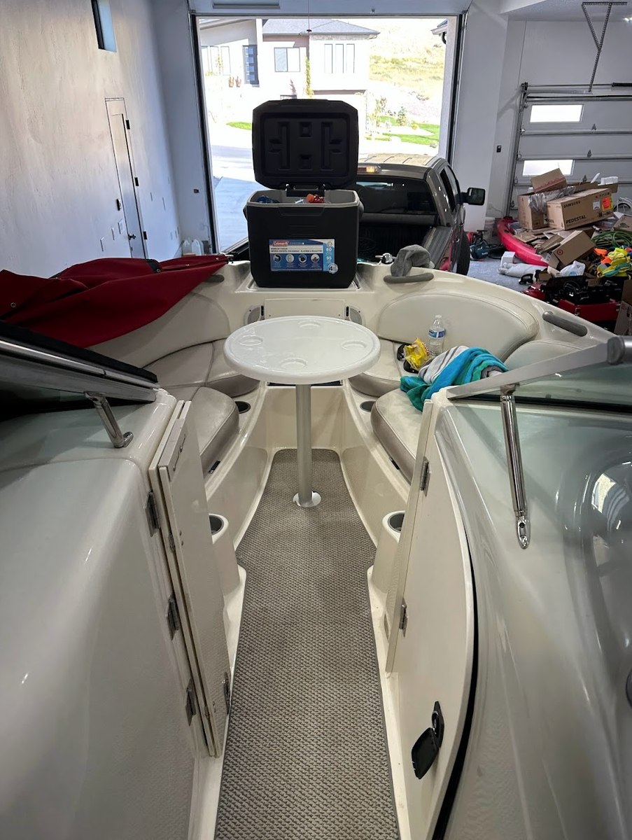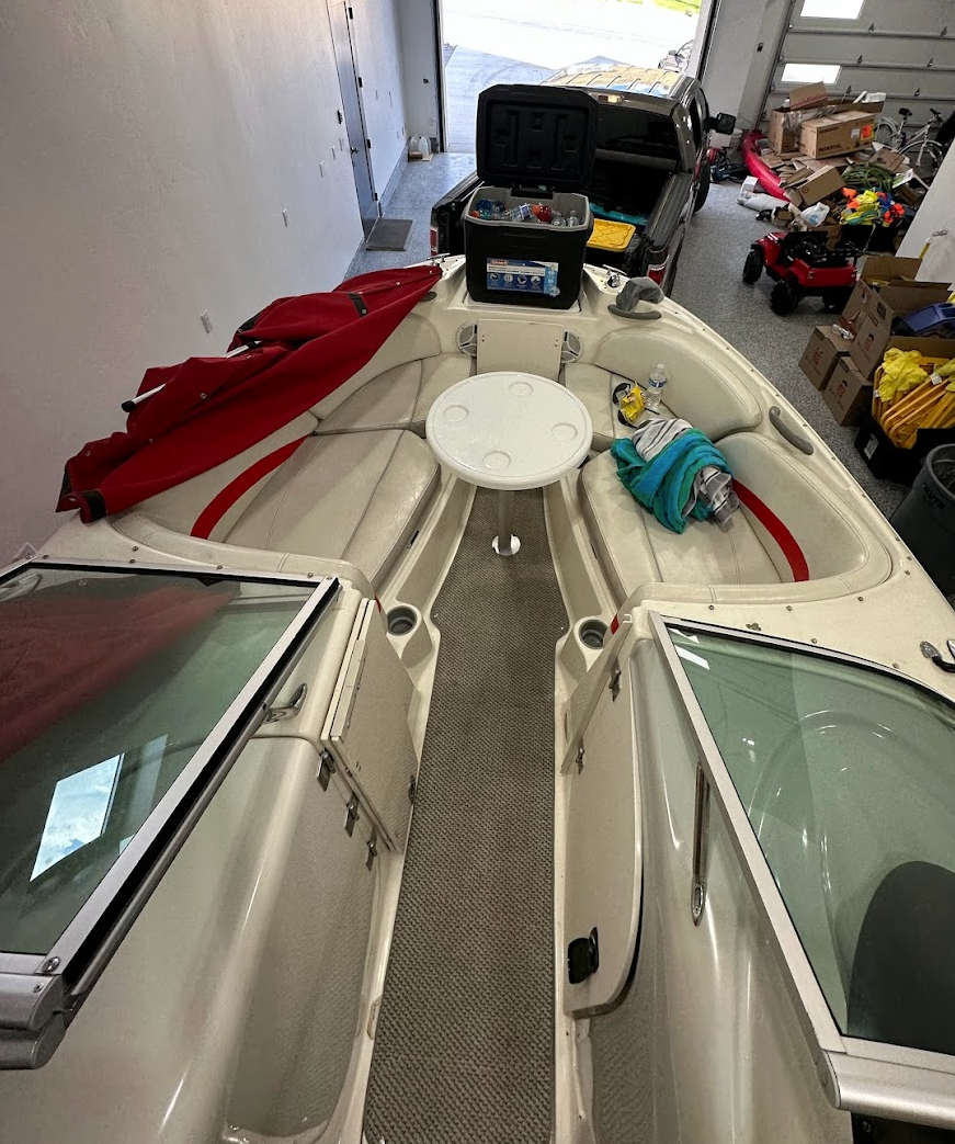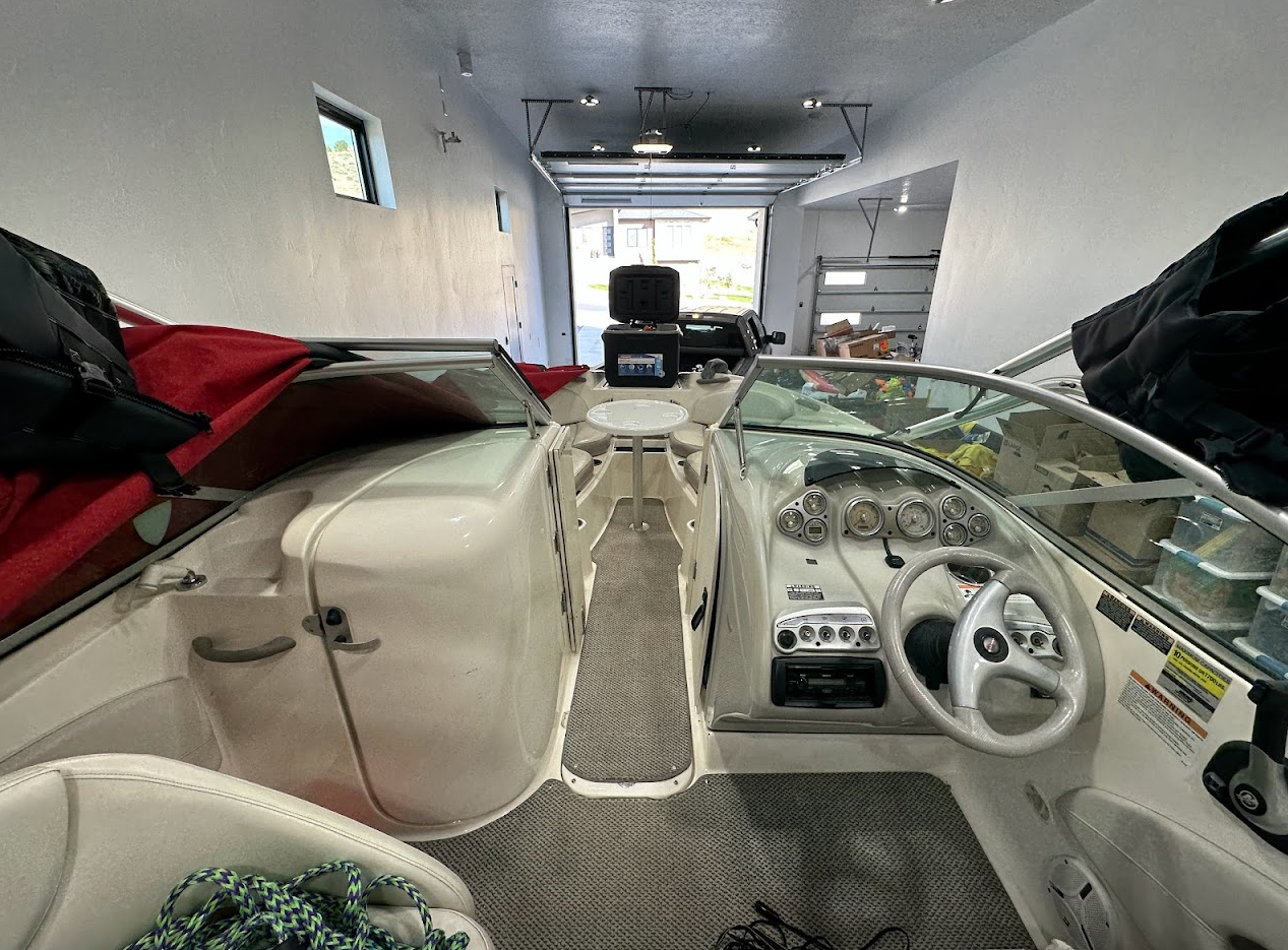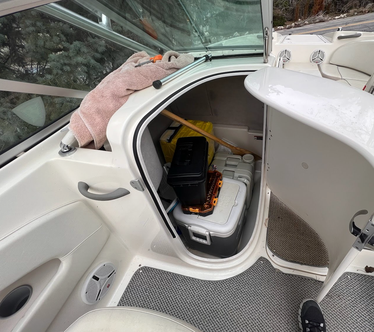 There is a front cooler with an auto drain to keep your drinks cold on the lake and lots of storage throughout.