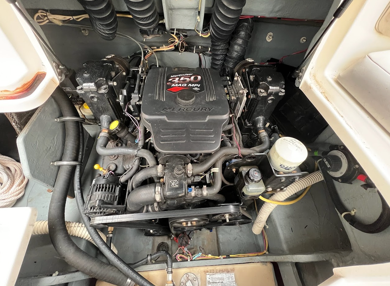 The Engine is a MerCruiser Mag 350 MPI 5.7L that is Fuel Injected - The Engine has been flawless and gives over 300 HP of power to the dual-prop outdrive. The engine has extremely low hours for its age with only 336 hours.