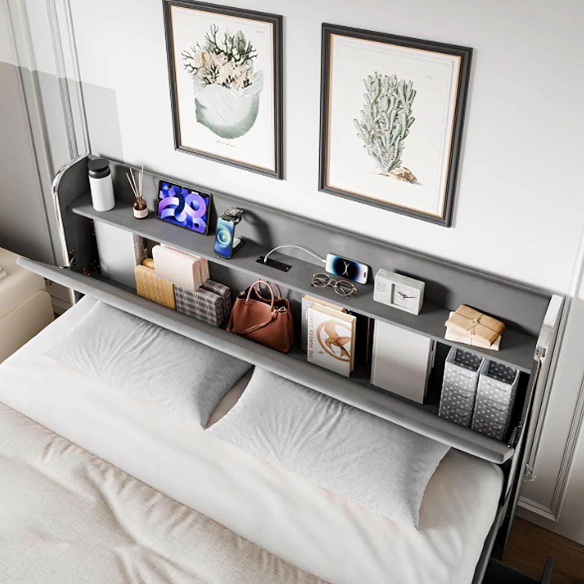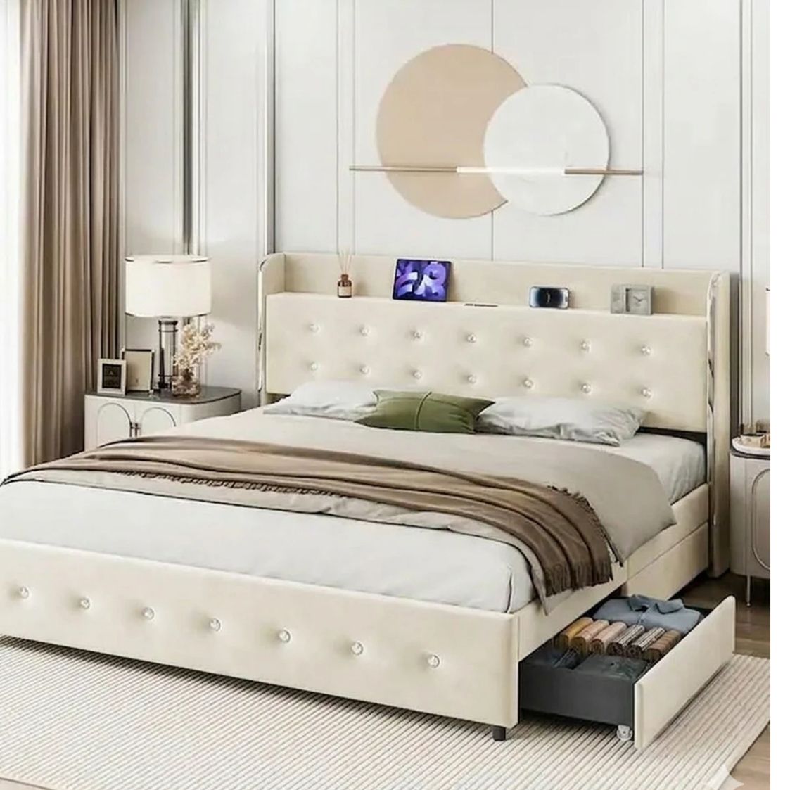 Large Storage Drawers: Enhance your bedroom storage with our king bed frame featuring four spacious drawers underneath. Perfect for storing extra linens, blankets, pillows, and clothing, these drawers provide ample space to keep your belongings organized and easily accessible. HEADBOARD WITH STORAGE SHELF & CHARGING STATION: Experience our wingback bed frame Queen size with a storage headboard, featuring 2 AC outlets and 2 USB ports, along with a 5ft long power supply cord. Conveniently charge your devices on the headboard while easily storing books, alarm clocks, photo frames, and more. VELVET BED FRAME: The elegant wingback design and delicate button tufted headboard of this bed frame effortlessly complement a range of bedroom styles. Crafted from breathable fabric material, this piece offers a gentle and skin-friendly touch, ensuring both style and comfort in your bedroom. STURDY CONSTRUCTION: Experience superior stability and noise-free sleep with this king bed frame and headboard featuring 12 high-quality solid wood slats and 12 support legs. The platform bed frame evenly distributes weight and can support up to 1000lbs for your mattress. No box spring required.