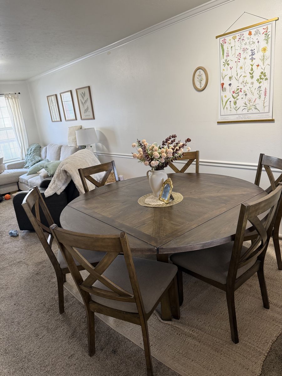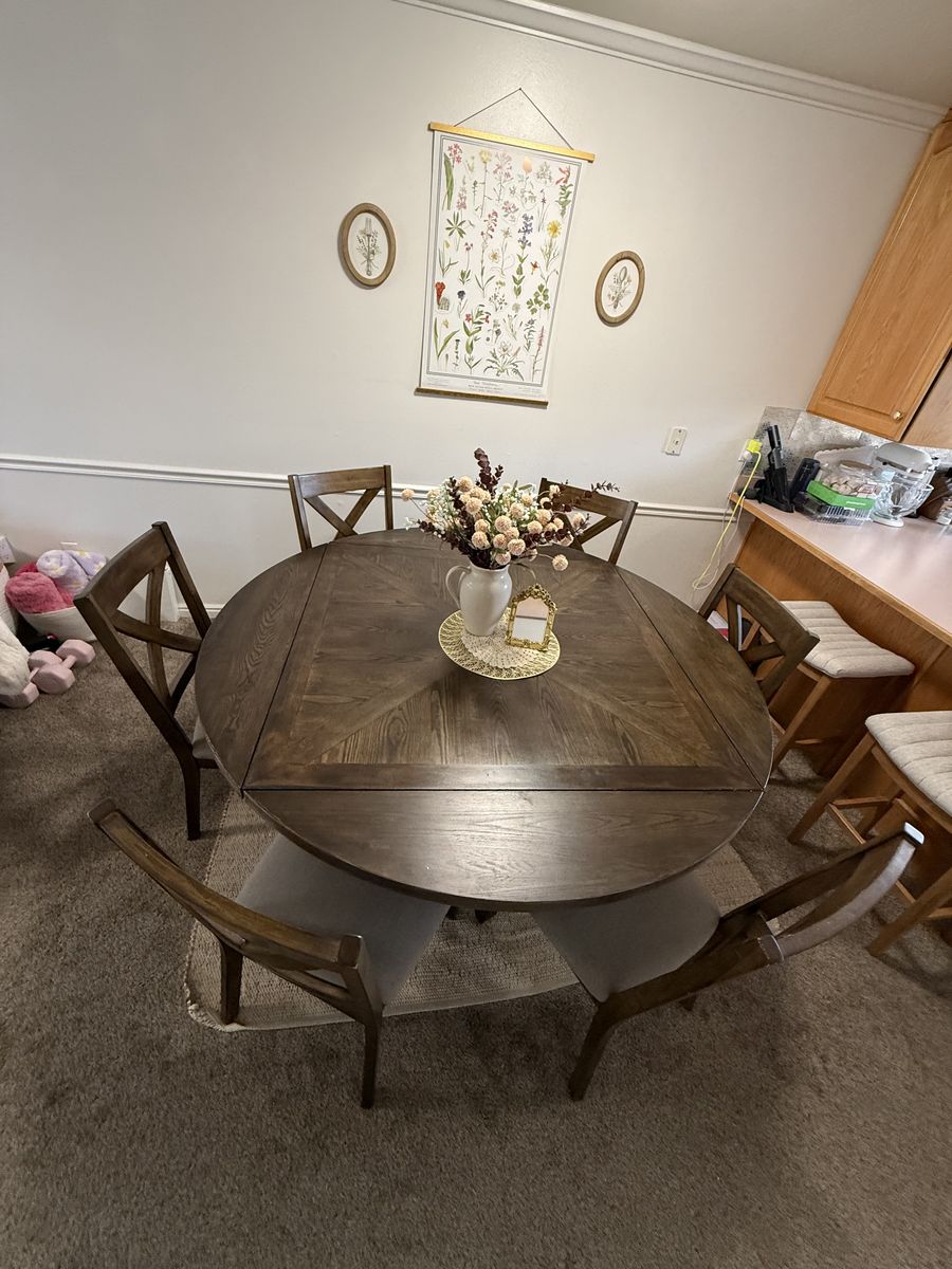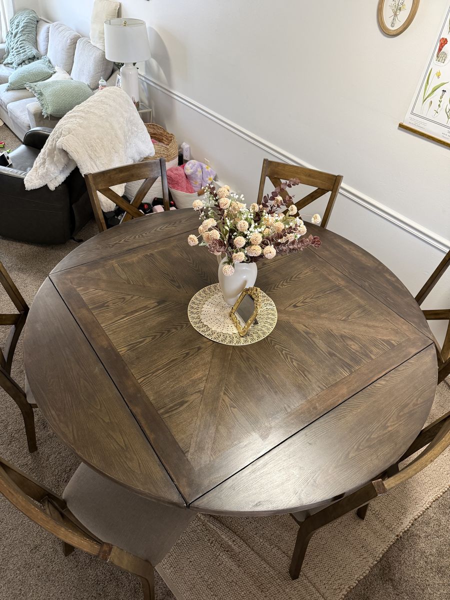 VenmoBeautiful big table that goes from a square to a circle with foldable leaves that fold under the table. Very good condition just shampooed the seats. Non smoking and pet free home. Perfect for dining, family dinner, game nights, and parties.