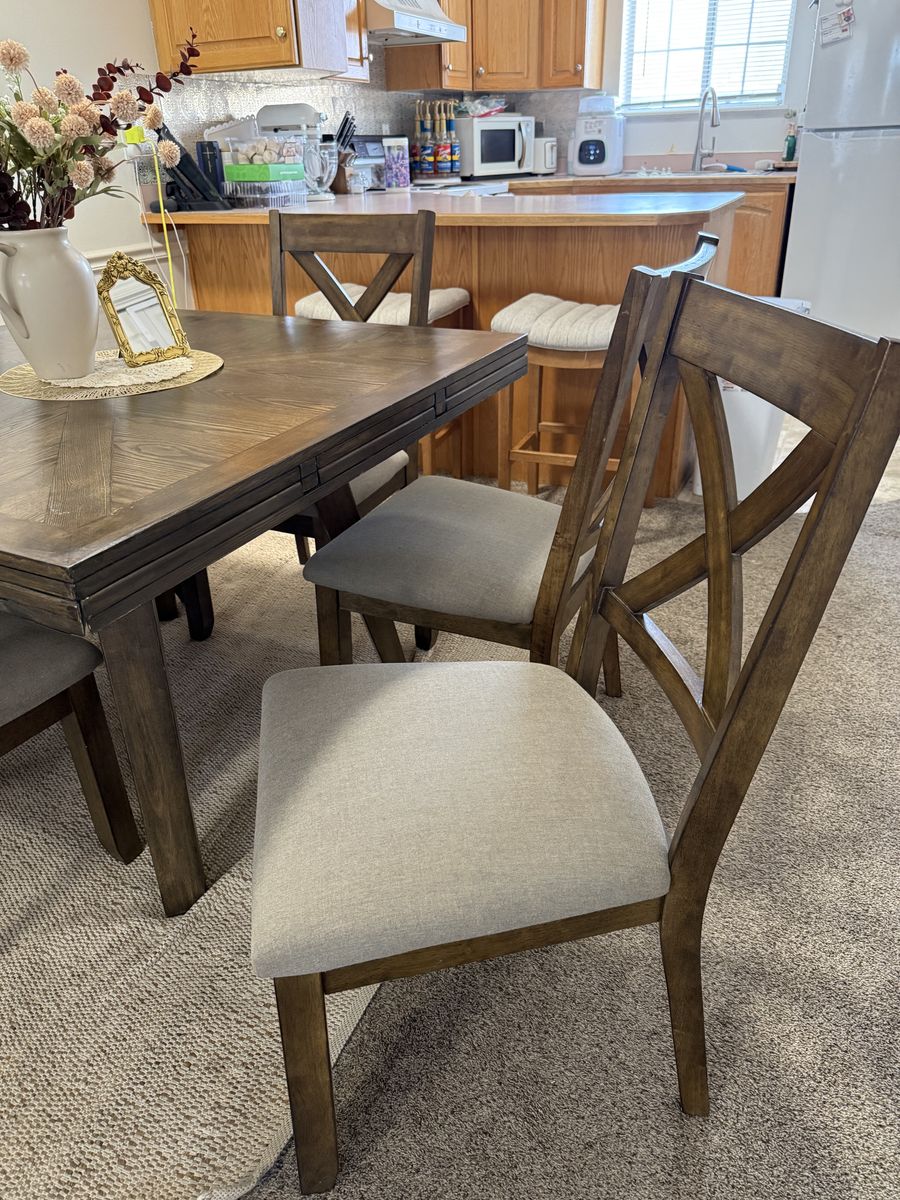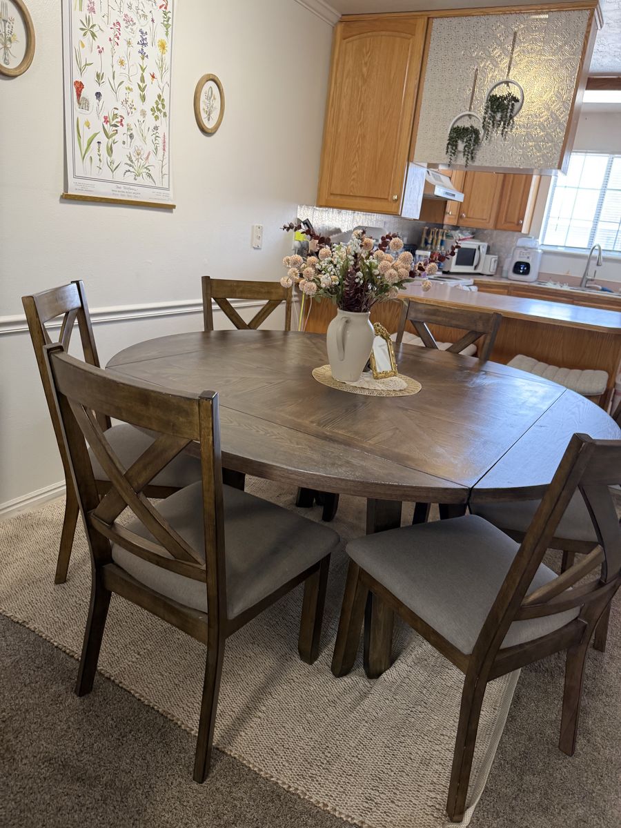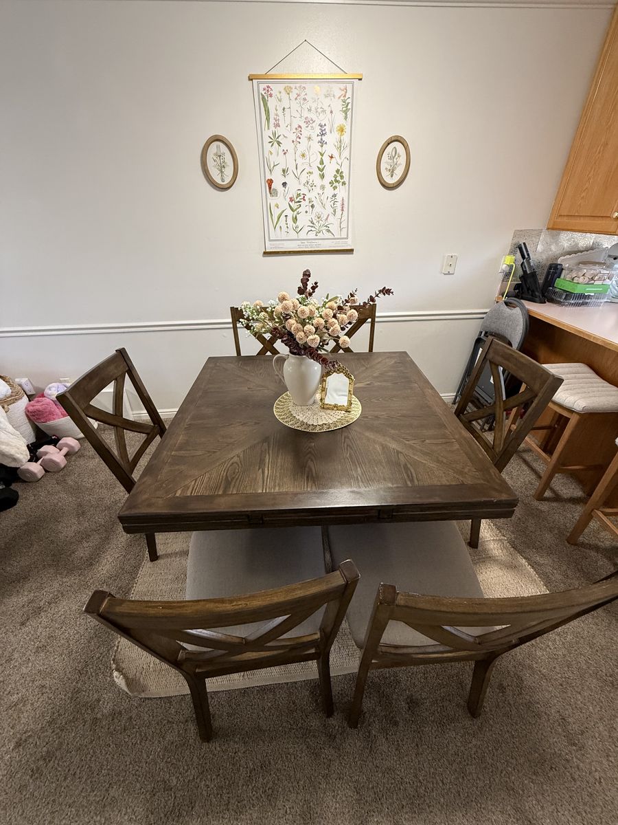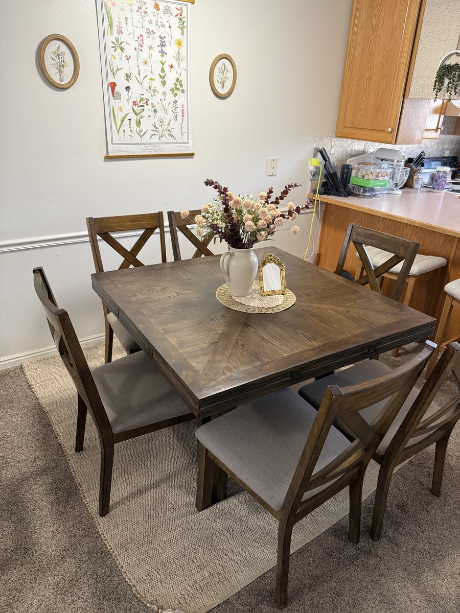 VenmoBeautiful big table that goes from a square to a circle with foldable leaves that fold under the table. Very good condition just shampooed the seats. Non smoking and pet free home. Perfect for dining, family dinner, game nights, and parties.