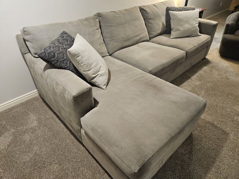 Crate & Barrel grey suede sectional, down filled. Barely used/in a spare room. From a home with no kids, no pets, no smoking. Cash only. You pick-up